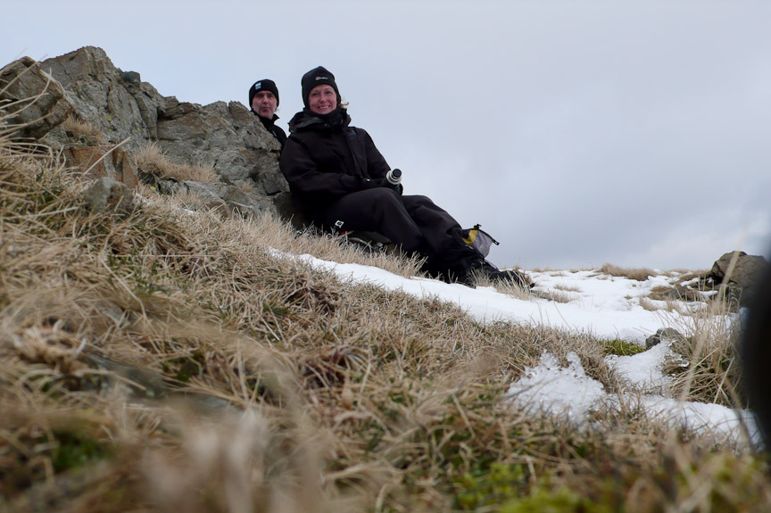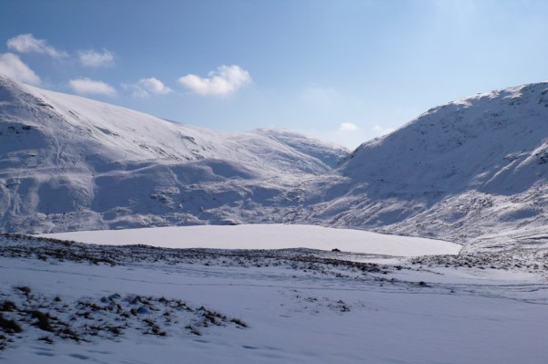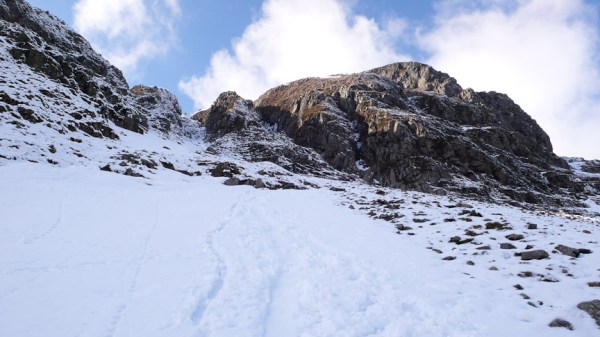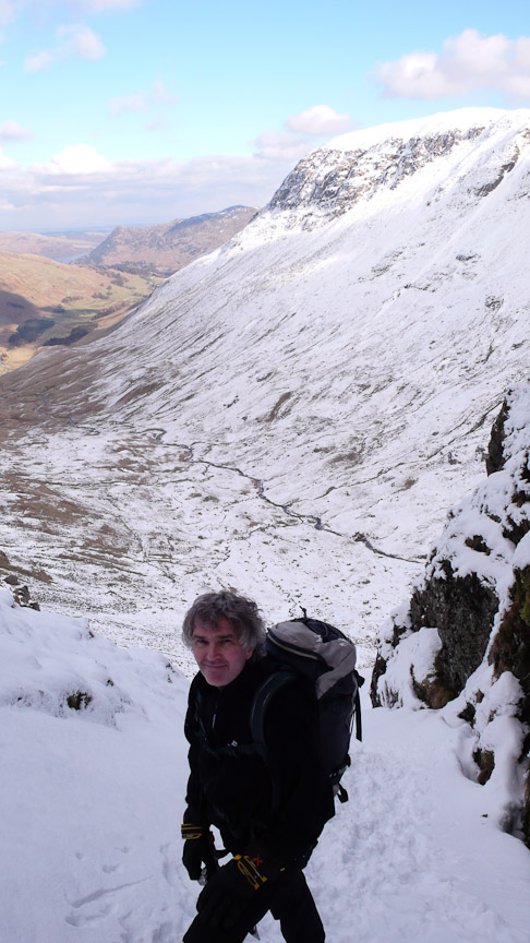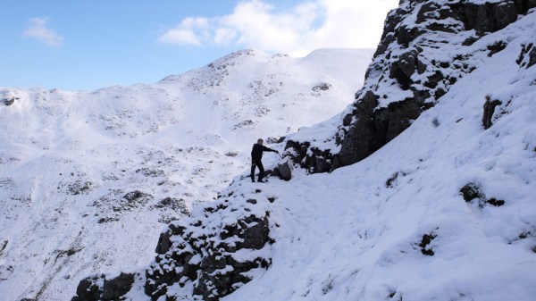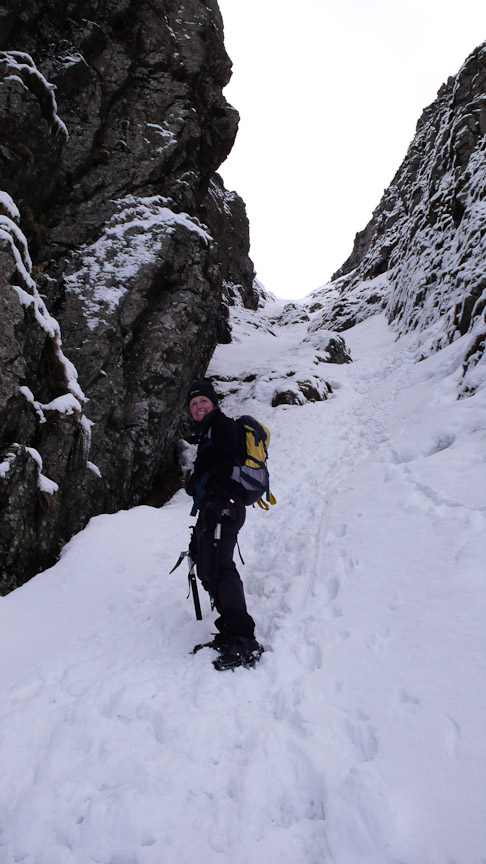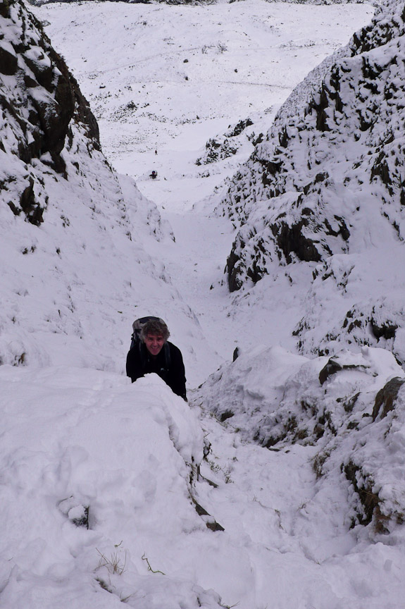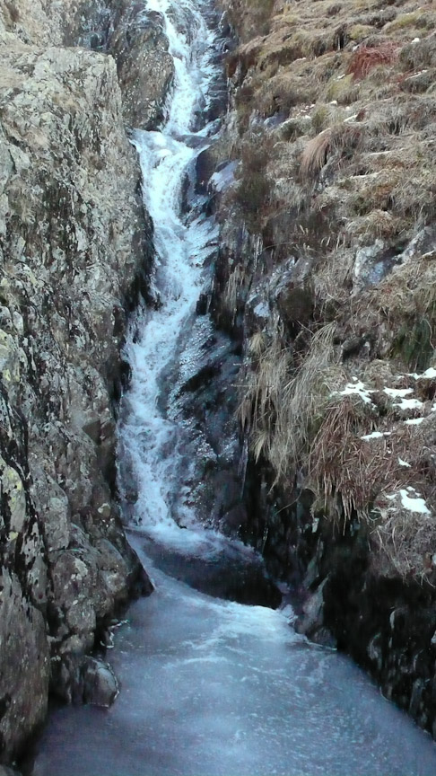It was a fairly cold night and still -3.5 when we got into the car, as there had possibly been quite a bit of snow in the week we thought that we would see what condition the gills are in. We parked at Dunmail Raise and headed to Birkside Gill. It was frozen but no where near enough to climb. We carried on up the gill for a bit and then headed up to the ridge and Willies Wife’s Moor. We traversed round above Grisedale Tarn heading to Tarn and Falcon Crags. There was frozen snow and ice on the ground covered by a fresh powder snow. There were a couple of parties in number 1 gully so we headed for number 2 gully (grade 1). It was great – a bit trampled but nice and solid under the powder snow. We descended the same way hoping to have a look at number one gully but the two parties were still at it. So we started up number 3 gully (grade 1) towards the top there was some interesting ice which was in fact quite steep and interesting. The top became very interesting as the snow became sugary. We desended number 2 gully and as the two parties were now off the first pitch we had a go at number 1 gully. It had a small ice pitch which had lost most of its ice.