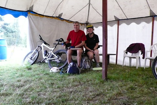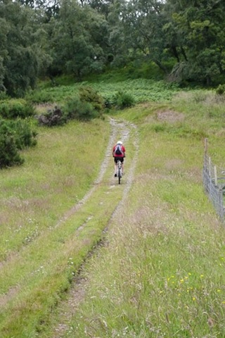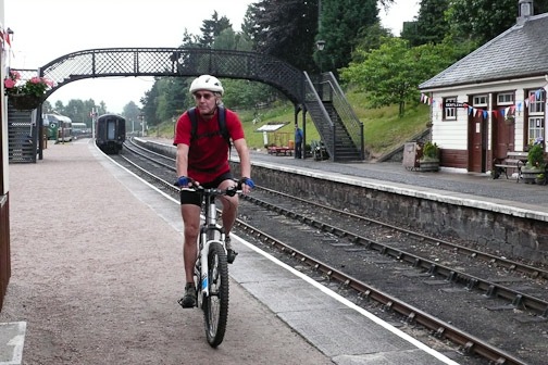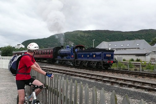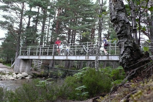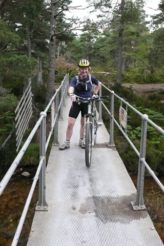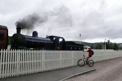 It was dry when we set off but not for long. We attempted this route last year but Roger had a major mechanical failure with his chain, and so it was abandoned. We followed the spey way from Aviemore stopping to look at houses and Bungalows and a steam train in the station which then left and passed us. By the time we got to Boat of Garten it was pouring , we took shelter in a beer tent left over from the steam rally the day before …had a sandwich and coffee as no tea shop could be found. A debate to continue or not . We decided to bat on regardless. I was pretty wet anyway. We continued through Abernethy forest to Nethy Bridge…no tea room and on passed the spot of the bike in a gorse bush incident last year and on through the forest to Glenmore Tea and a scone before continuing round Loch Morlich and on with weary legs to Loch Elieen and beyond to find a bridge over the Spey but none was to be found so back to the car.