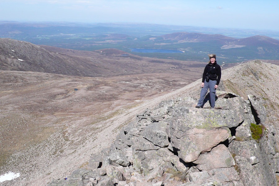 We parked at the Ski car park and headed up the path pass the ski tows and towards Coire am t sneachda. this turned out to be a happy mistake as once we got to the corrie we realised that we should have headed up toward the ridge to the west. But after having a good look at the crags we headed diagonally back to a small out crop that we noticed when we were here last winter. It turned out to be a very interesting way on to the ridge an obviously well used in winter – crampon marks. It was quite blustery but we headed up the ridge to the main scramble. It was brilliant such grippy rock. Once on the top we headed to the summit of Cairn Lochan and then down Fiacaill Coire Chais, although we dropped down to the ski area and made our way back to the car.Both our ankles stood up well!!