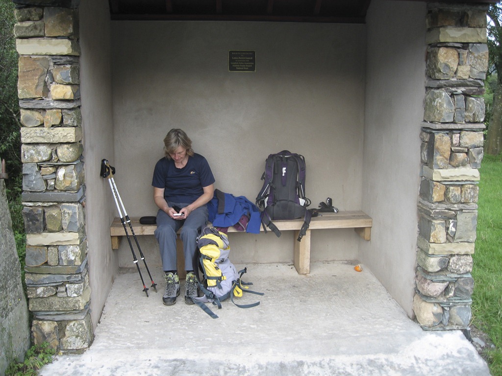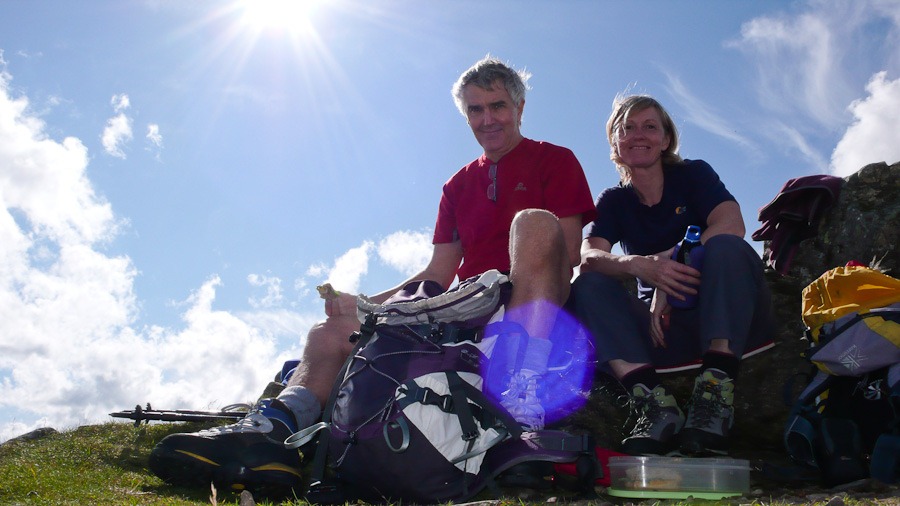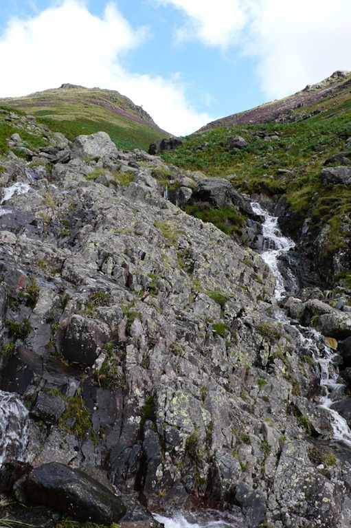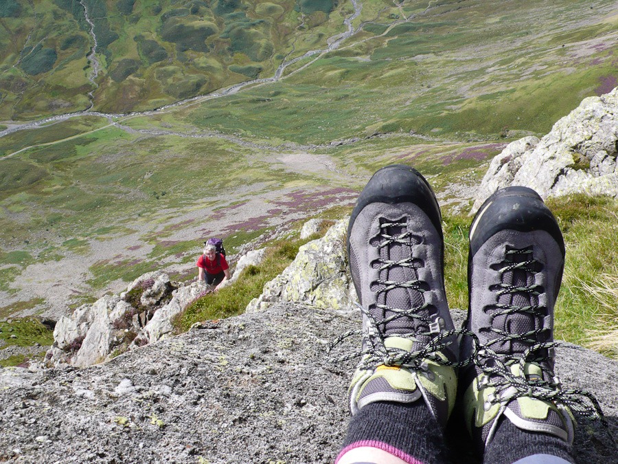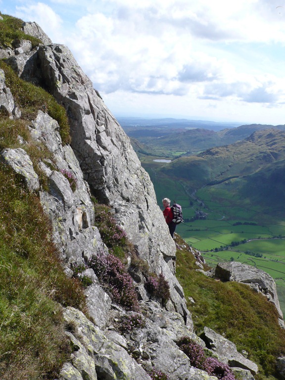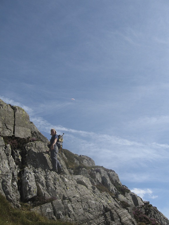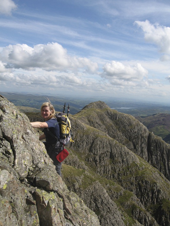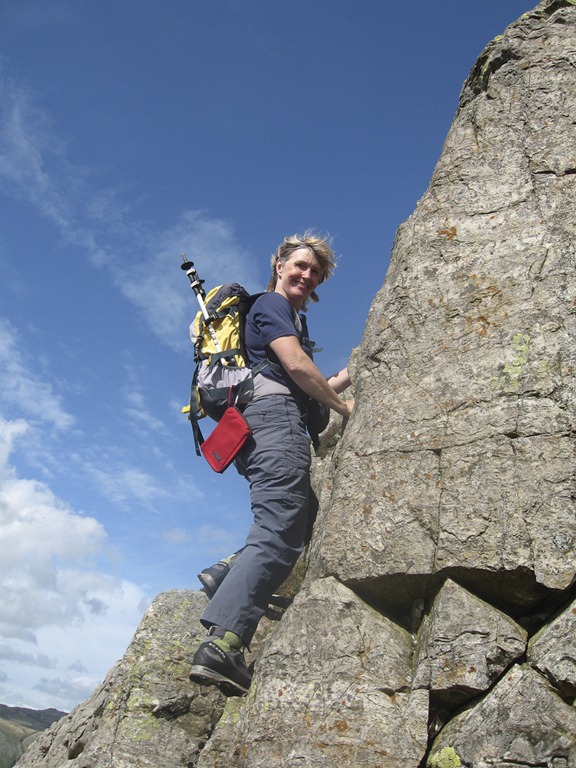The forecast was good and we headed to Langdale with the aim of going up a scramble on Pike of Stickle probably the Grey Band route grad 4 and v diff **. As we walked to walked towards Traughton Gill I had what must have looked a very comical fall as a rock gave way and I tried to save myself waving sticks about frantically in the air. I managed to get my hand down but landed no my knee and thumb! – bit shaken we scrambled up the gill where I had another fall trying to save my self from putting my foot in a deep pool, this resulted in a gash on the hand and a wet bottom! As we headed to Pike of Stickle we decided to go for something a little easier and scrambled up the excellent Main Face Grade 2 ***. A hang glider floated over head. Once at the top we decided we definitely need to do more so dropped down to the top of dungeon Gill and traversed round the bottom of Harrison’s Stickle and headed up South Central Buttress grade 3 **. Where the hang glider shouted down to us “ beat you to the top!” Lovely day weather perfect. And Roger’s EBay bargain of his Scarpa Freny’s were a perfect fit…just have to wait for some serious winter weather to do them justice now!