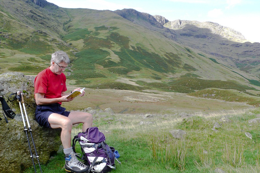 Deciding the route with Bow Fell and Bow Fell Buttress in the background