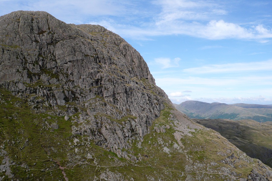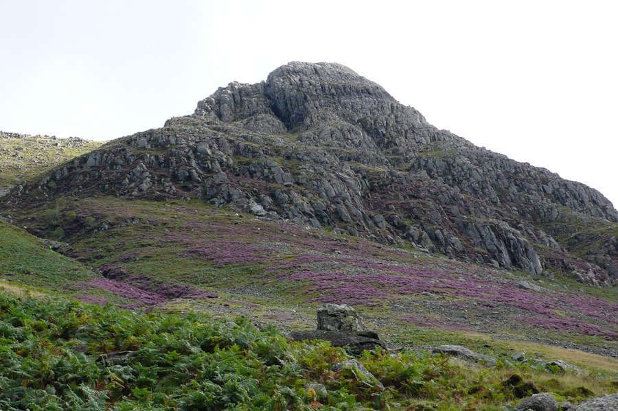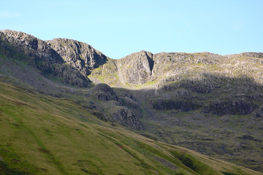 Bow Fell with North Gully – the winter climb in the shadow and central Buttress to the left