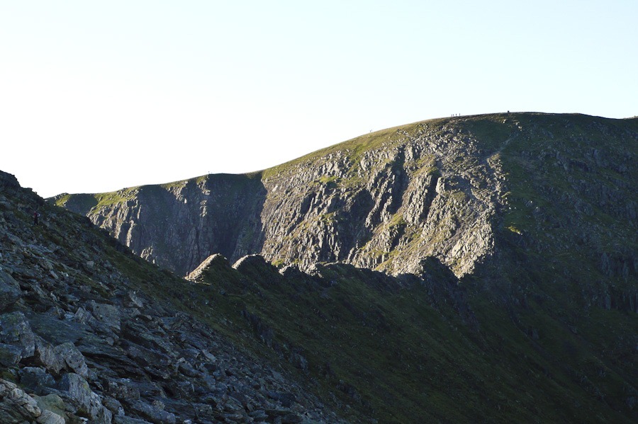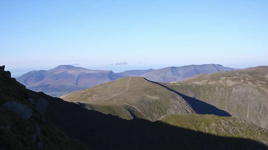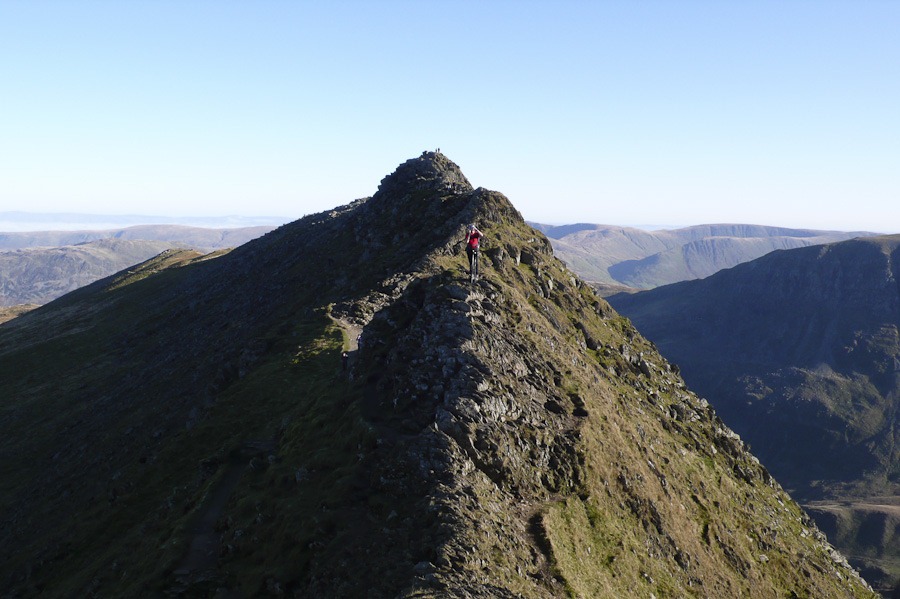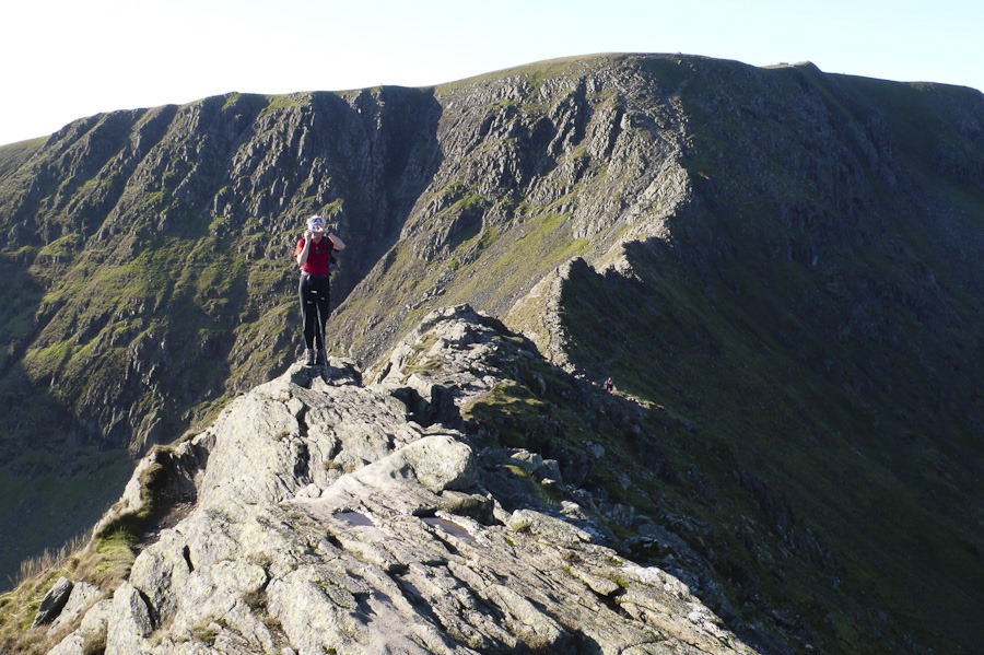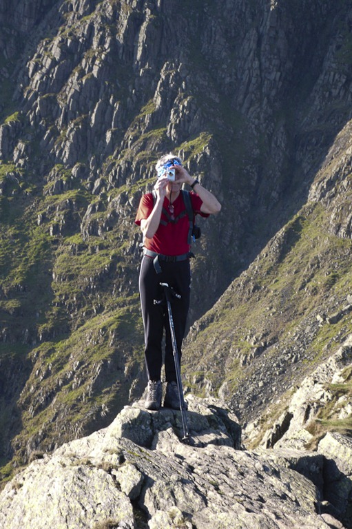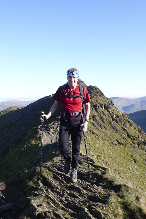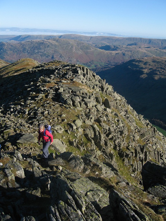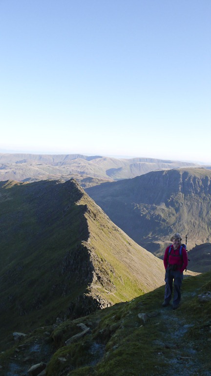 The forecast was good and it was right! Sunny and not a breath of wind…We drove up to greenside mine to park the car and then made the discovery that I had left the butties on the kitchen table but as we set off to contour round to the hole in the wall we decided to drop down to Patterdale to buy some as the thought of just mini mars bars was too much – and as it turned out not very nice ones as they must have got melted on gimmer crag last month during the late heat wave. We stopped at Greystones cafe and had a coffee and cake while we waited for them to be made. We retraced our steps…..then went along striding edge up Helvellyn and down Swirrel edge to Catsyle Cam….wonderful……….![]()