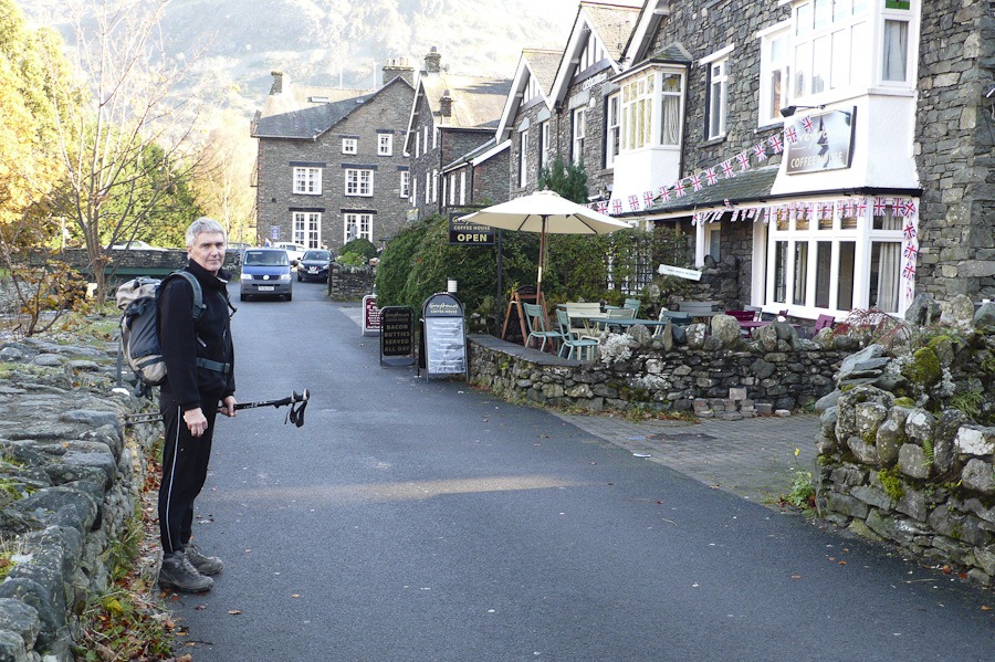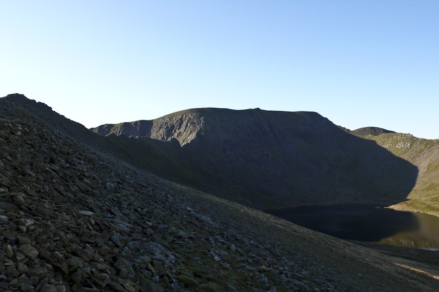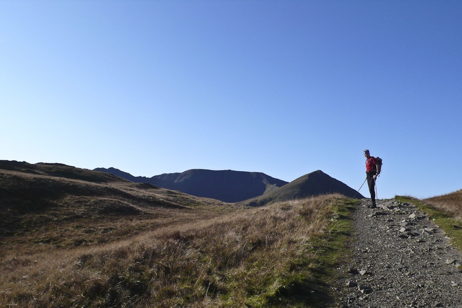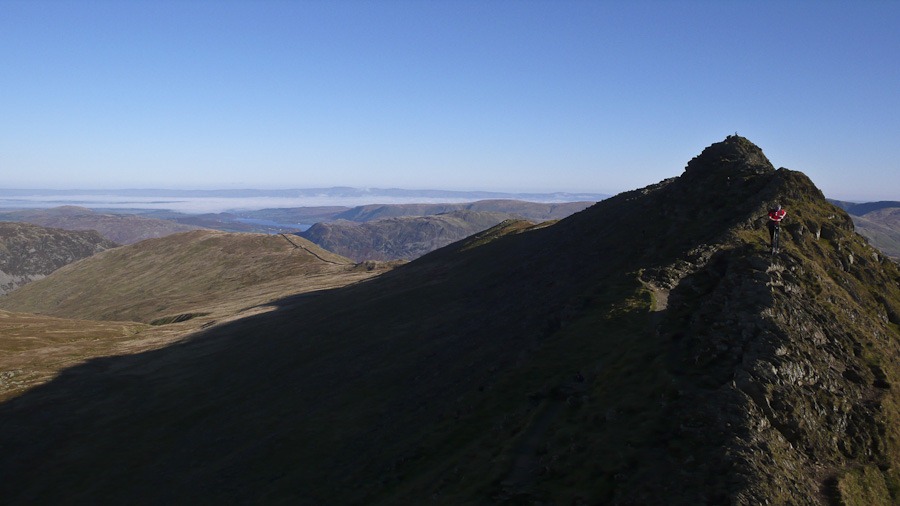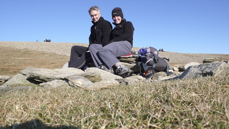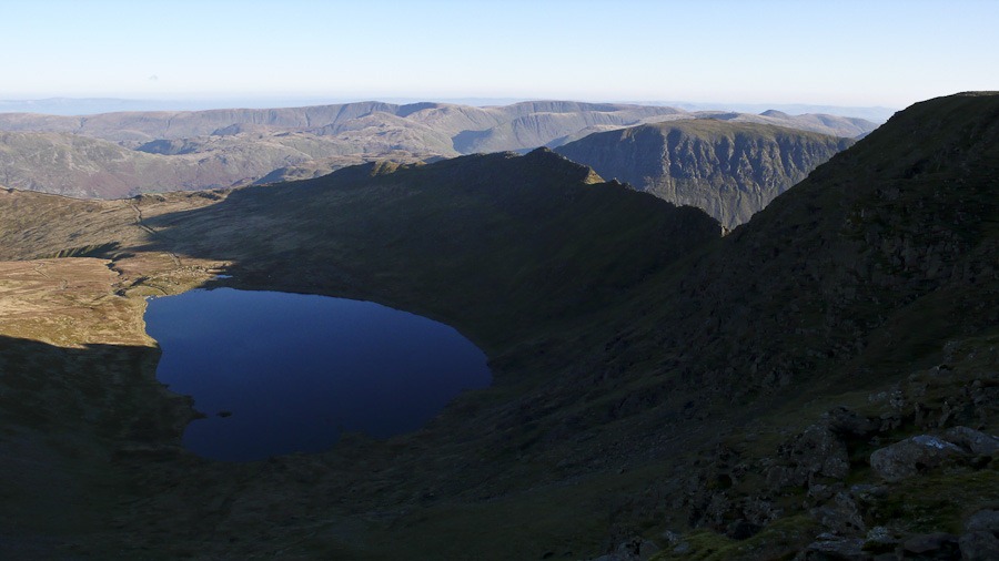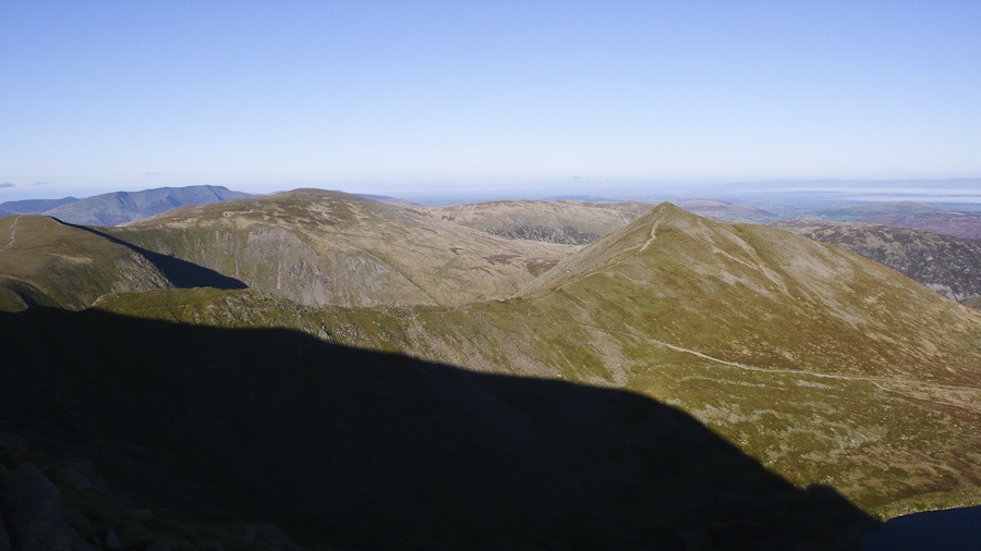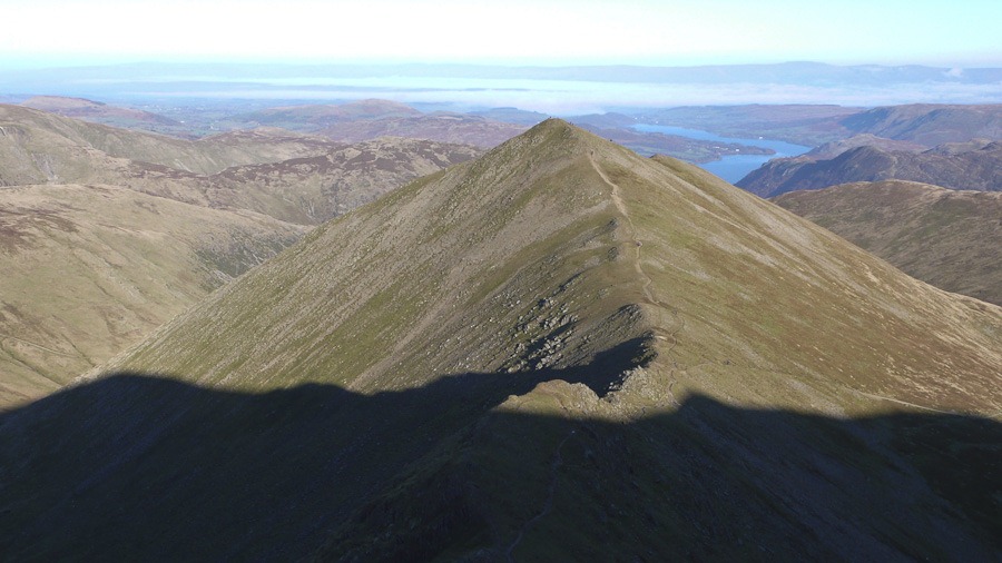 The forecast was good and it was right! Sunny and not a breath of wind…We drove up to greenside mine to park the car and then made the discovery that I had left the butties on the kitchen table but as we set off to contour round to the hole in the wall we decided to drop down to Patterdale to buy some as the thought of just mini mars bars was too much – and as it turned out not very nice ones as they must have got melted on gimmer crag last month during the late heat wave. We stopped at Greystones cafe and had a coffee and cake while we waited for them to be made. We retraced our steps…..then went along striding edge up Helvellyn and down Swirrel edge to Catsyle Cam….wonderful……….![]()