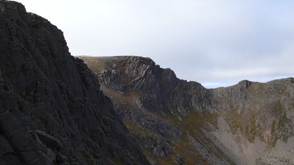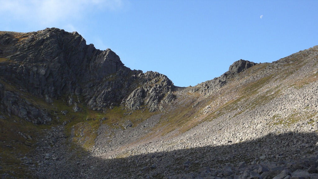 Aladdin’s Buttress and Fluted Buttress. The deep scars of Central gully, the runnel and Crotched Gully in the middle