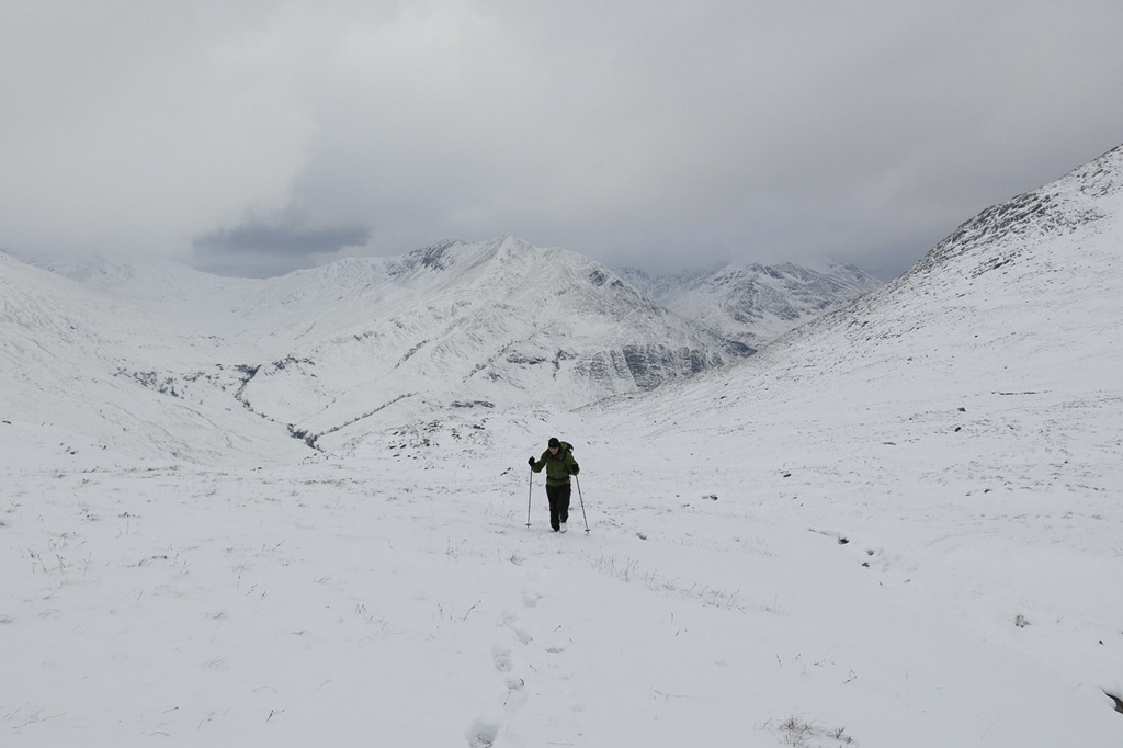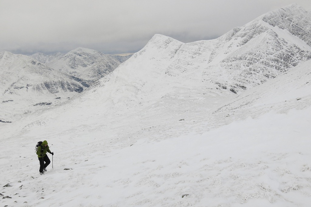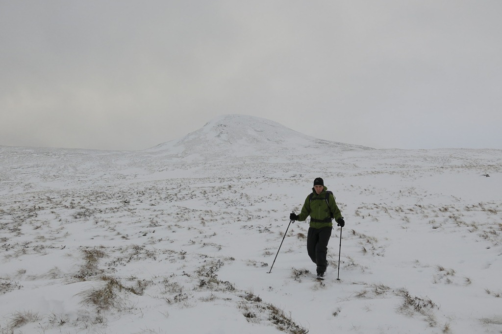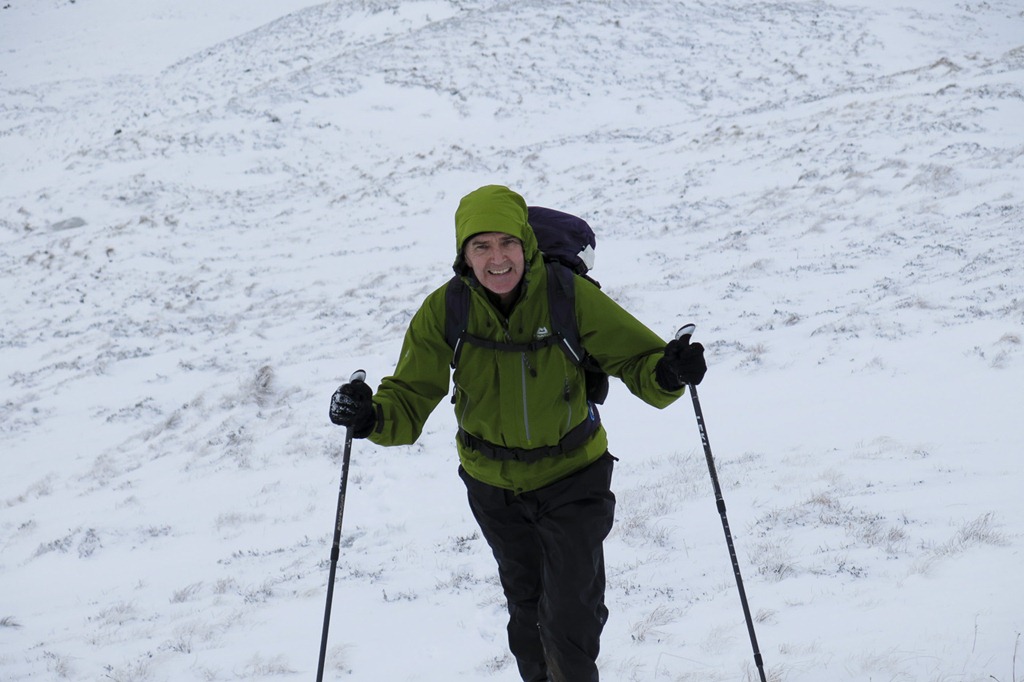 The avalanche risk generally was considered to be considerable on East, North and West slopes we could see on the final ridge up to the summit a weak cornice had developed. We did trudge up some deep snow in places but the angle was not great and the ground under the deep snow on the mountain was heathery – so nothing to slip on. We didn’t see any wind slab today.