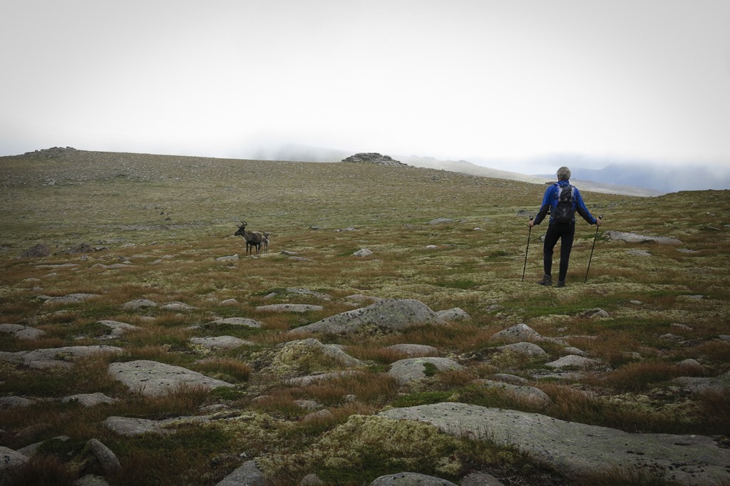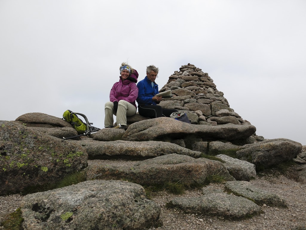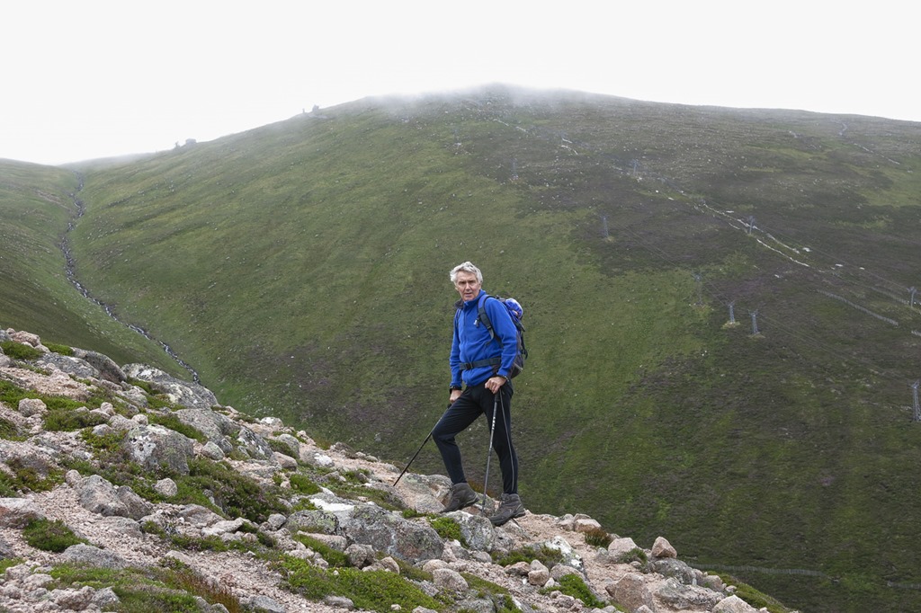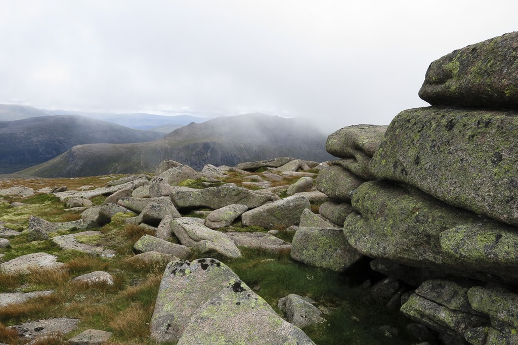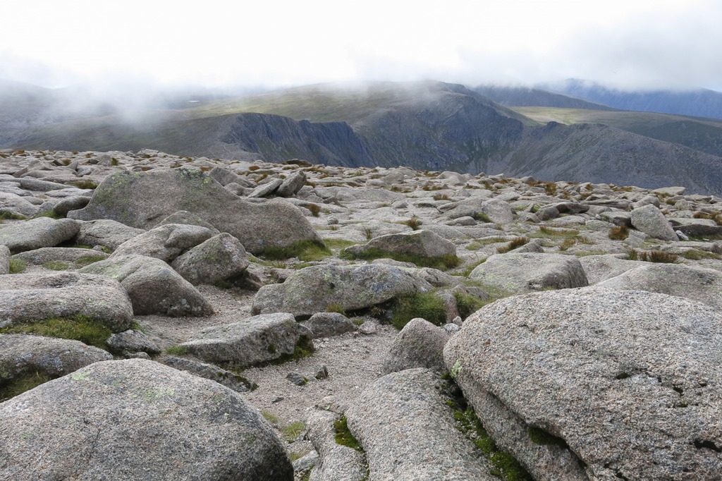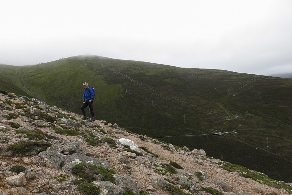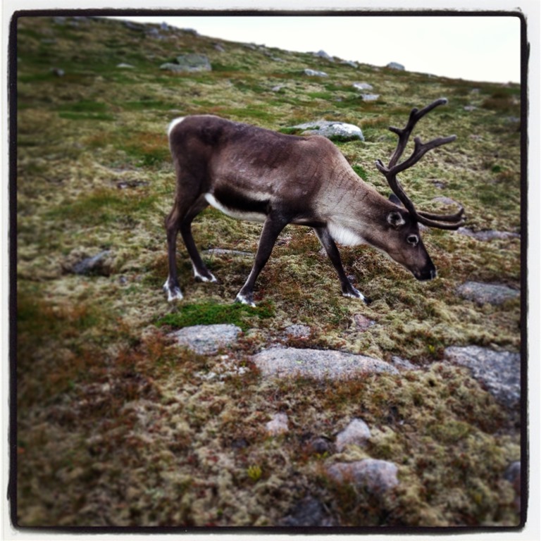 Still testing the newly mended ankle so this trip up Cairn Gorm has been a bit of a target for a while. We parked at the lowers ski car park and got seriously midges and I had forgotten my insoles for my boots so we high tailed it back home to pick up midge repellent and my insoles! We set of up the ridge at the side of Coire na Ciste. Strange looking down on the ski tows in the summer. As we approached the top of the ridge we saw some deer and we were surprised when they didn’t run away but walked towards us – they were reindeer and very tame! we arrived at Cnap Coire na Spreidhe in the mist ( or so we thought) and took a bearing to take us to the top of Cairn Gorm but as we walked it felt wrong but we stuck to the bearing and came across the top of the ski tow. We had dropped down too far and this was because we were not actually at the top of Cnap Coire na Spreidhe but a cairn just below it ….interesting. We continued on to the summit of Cairngorm and then retraced our steps but returned down Strona Cha no looking down into Strath Nethy and getting a bit wet in the rain!