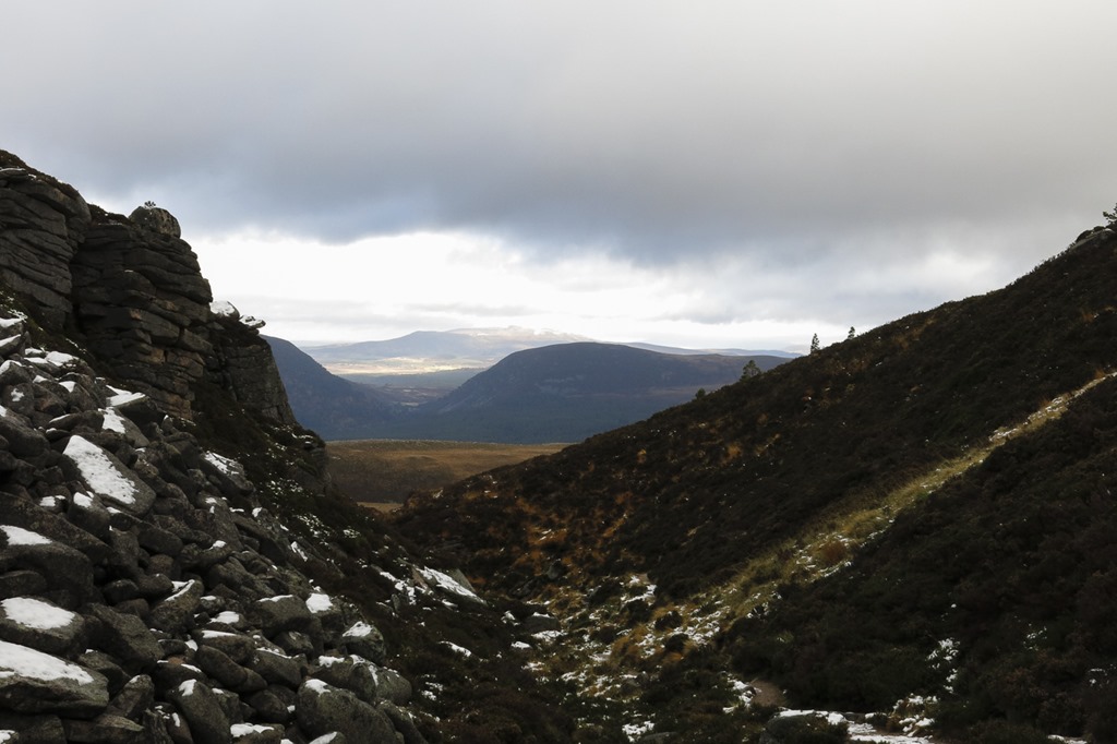 Looking down the Chalamian Gap to the pass of Ryvoan. with Creag nan Gall in the middle and the Hills of Cromdale in the distance![]()