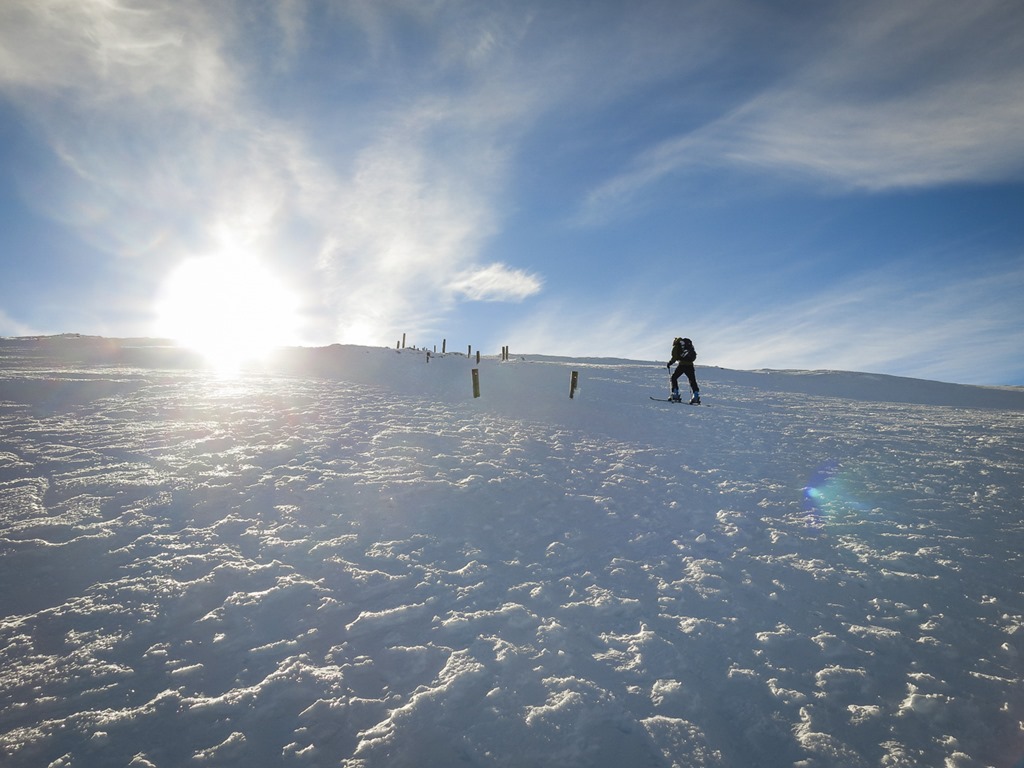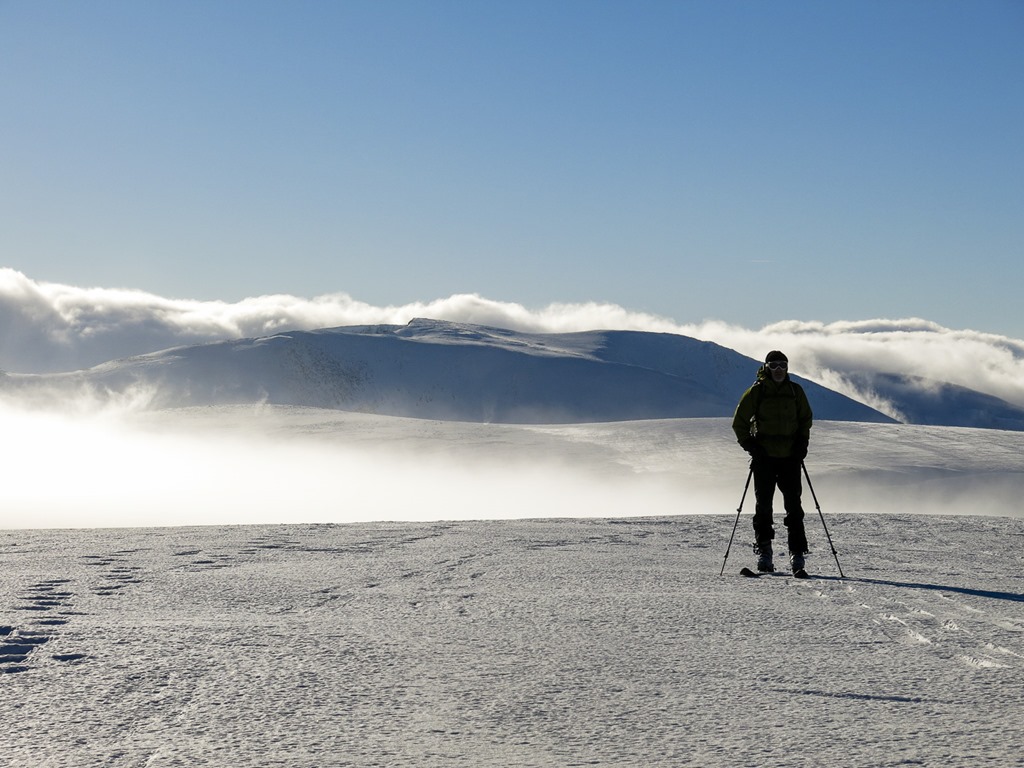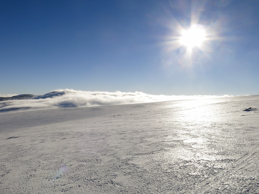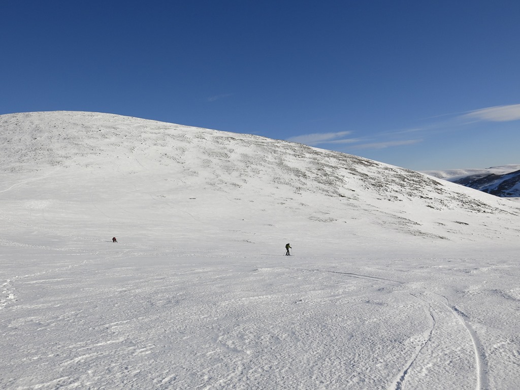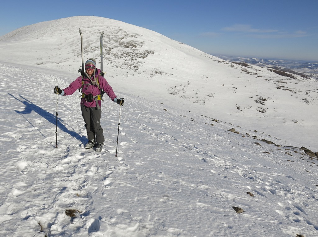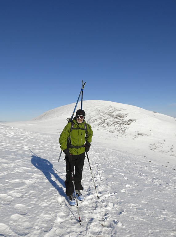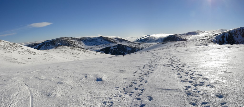 What an amazing day. We parked at the top car park and caught the train up to the ptarmigan building. We then skinned up Cairngorm, a beautiful sunny day with only a little wind. My ski mountaineering bindings had been put on my old atomic skis which were a lot lighter. From Cairngorm we headed down towards point 1141 but in fact skirted round towards Stob Coire an t-Sneachda. It was just a bit too rock at first but then there was enough snow to whiss down. WE then carried on to Carn Lochan but as there was a bit of cloud coming in and we were not sure of the snow conditions we decided to head back the way we had come to Stob Coire an t-Sneachda and Fiacaill a Choire chais. From there we went down a very narrow and icy ridge to pick up the Fiacaill traverse and followed the ski runs back to the car park. I think it is fun but there was a lot of faffing about putting skins off and on. Today ( the day after) I ache a bit!