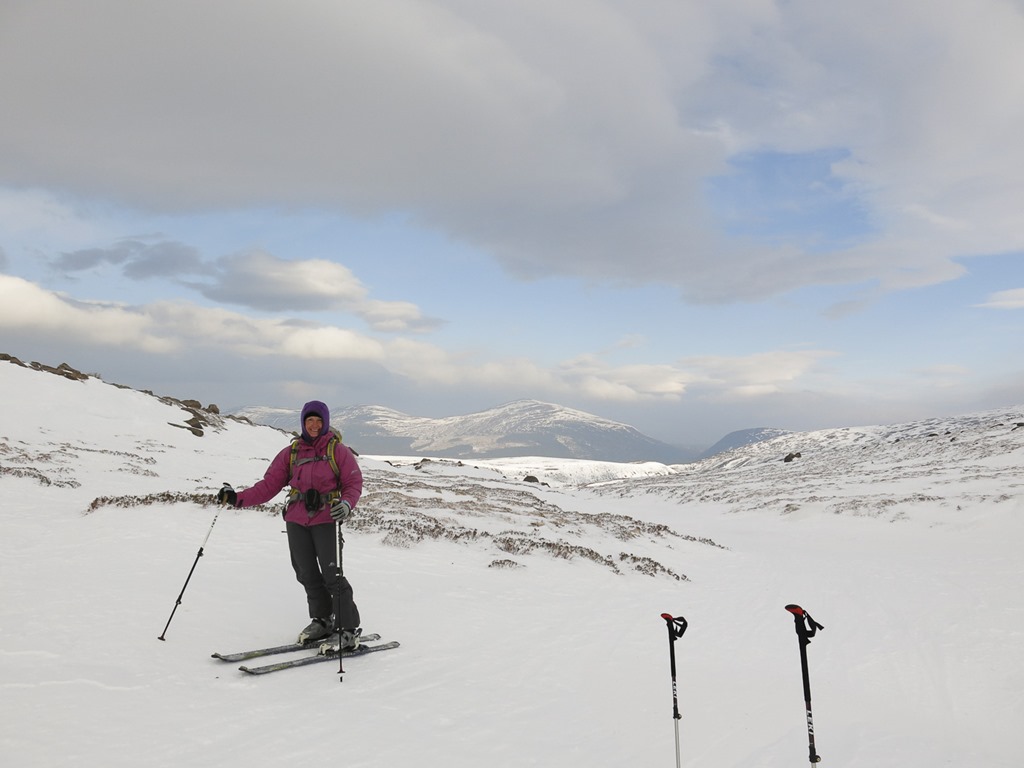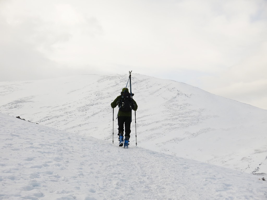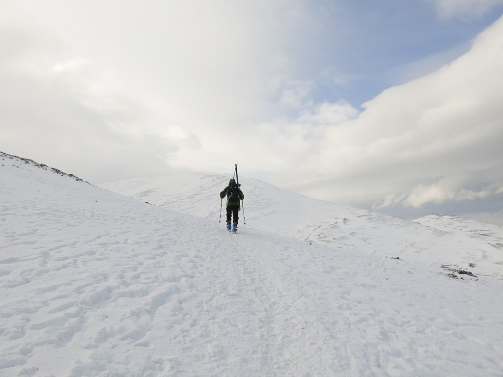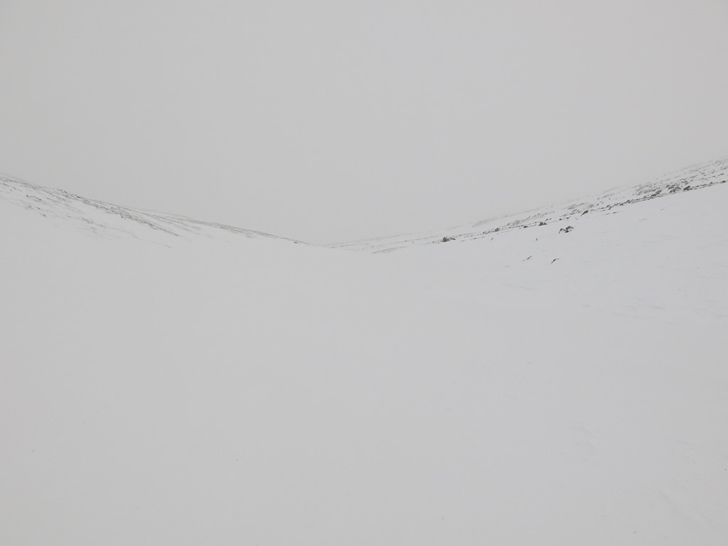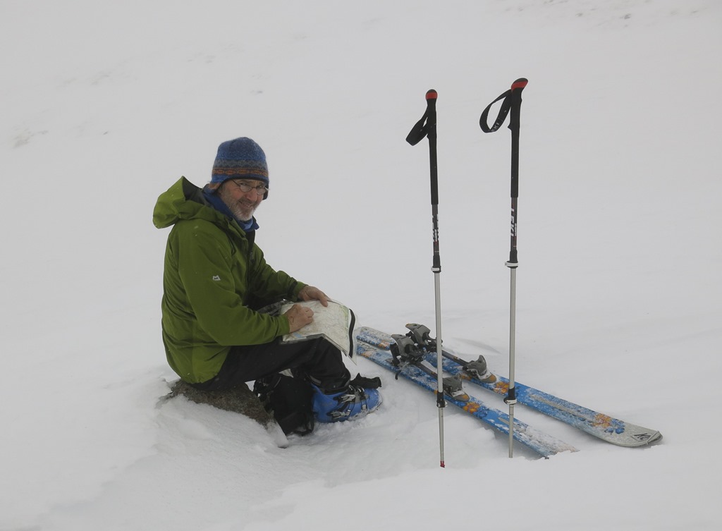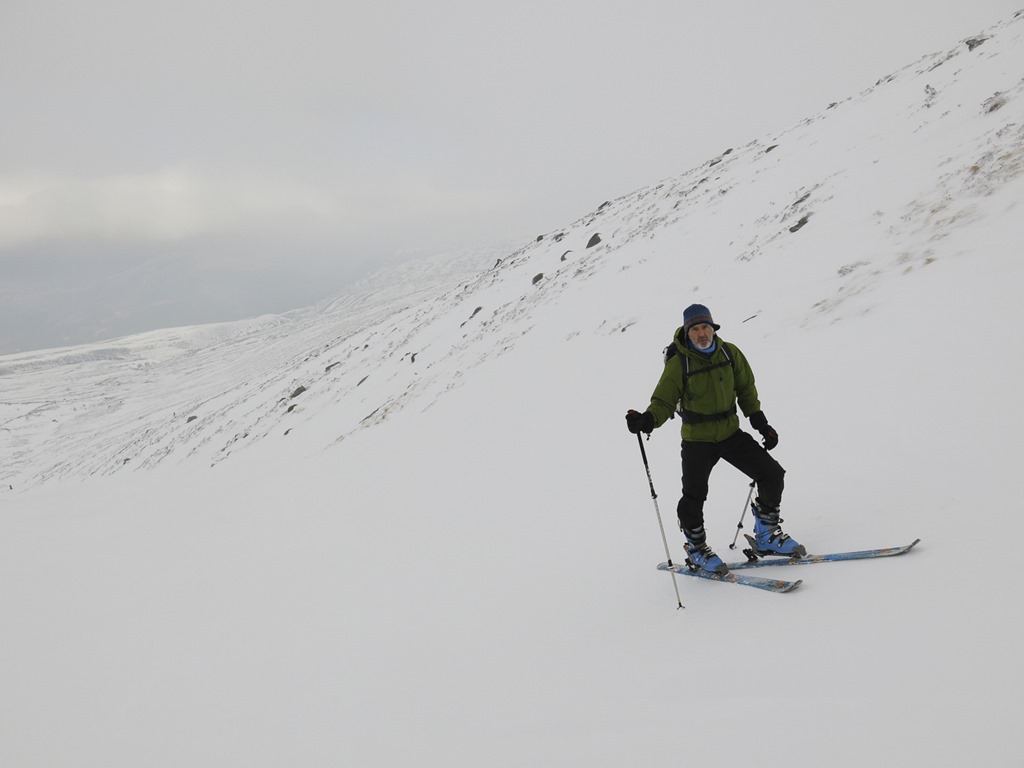 After a debate we parked at the top ski car park and traversed round to the bottom of Lurchers Gully. We set off with Skins on our skis but carrying them, after a while we put the on and started the traverse but it was awkward as the gradient dropped down so we took them off, however it wasn’t long before we had to put them back on again. We decided that faffing about putting them on and off was not fun! We Kept them on then all the way to nearly the top of Lurcher’s gully(870m), unfortunately the visibility fell somewhat. We had a sandwich and then whizzed down and traversed back to the Top of the Ridge poma. With only a little carrying.