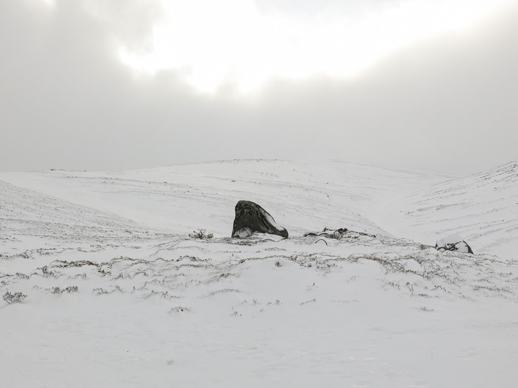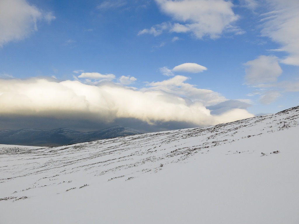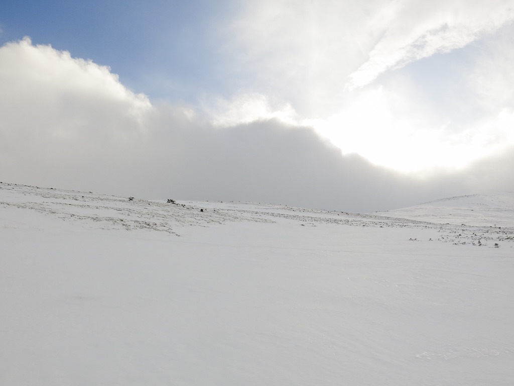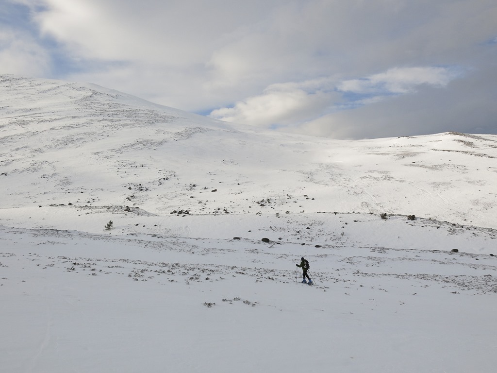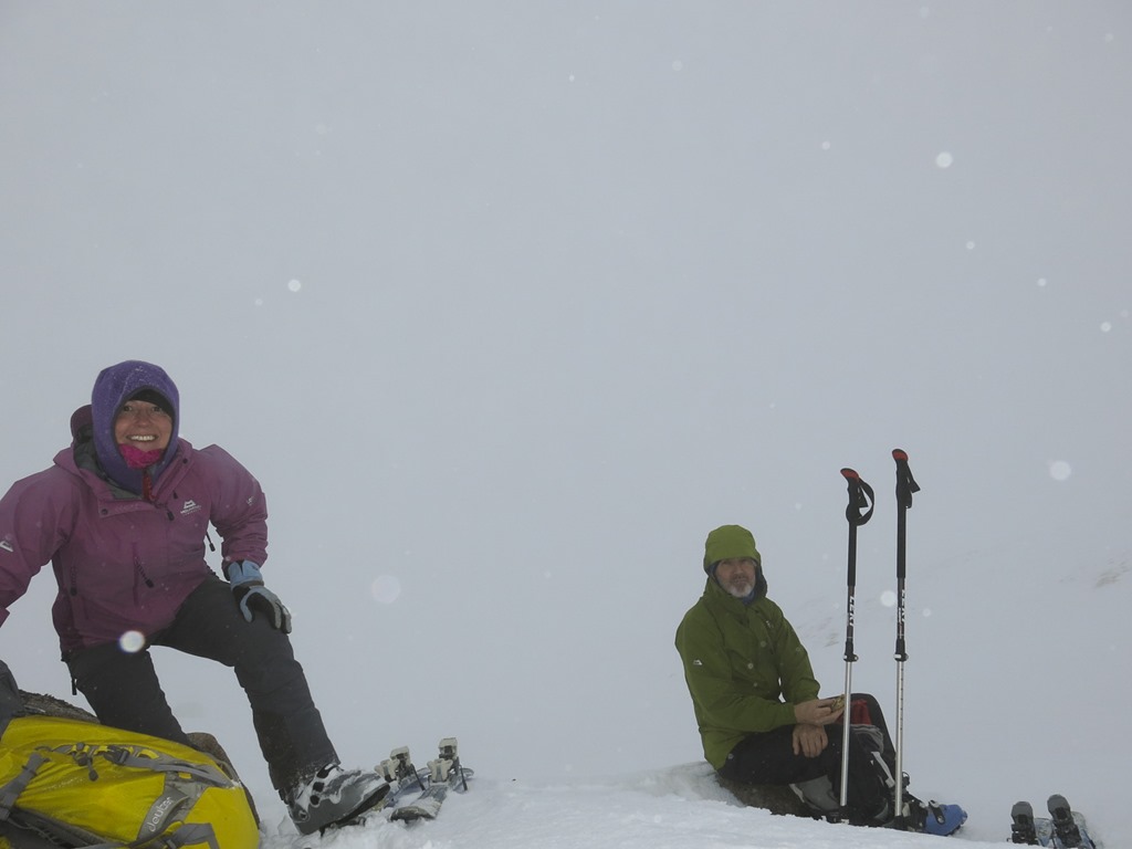 After a debate we parked at the top ski car park and traversed round to the bottom of Lurchers Gully. We set off with Skins on our skis but carrying them, after a while we put the on and started the traverse but it was awkward as the gradient dropped down so we took them off, however it wasn’t long before we had to put them back on again. We decided that faffing about putting them on and off was not fun! We Kept them on then all the way to nearly the top of Lurcher’s gully(870m), unfortunately the visibility fell somewhat. We had a sandwich and then whizzed down and traversed back to the Top of the Ridge poma. With only a little carrying.