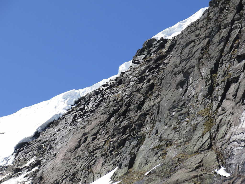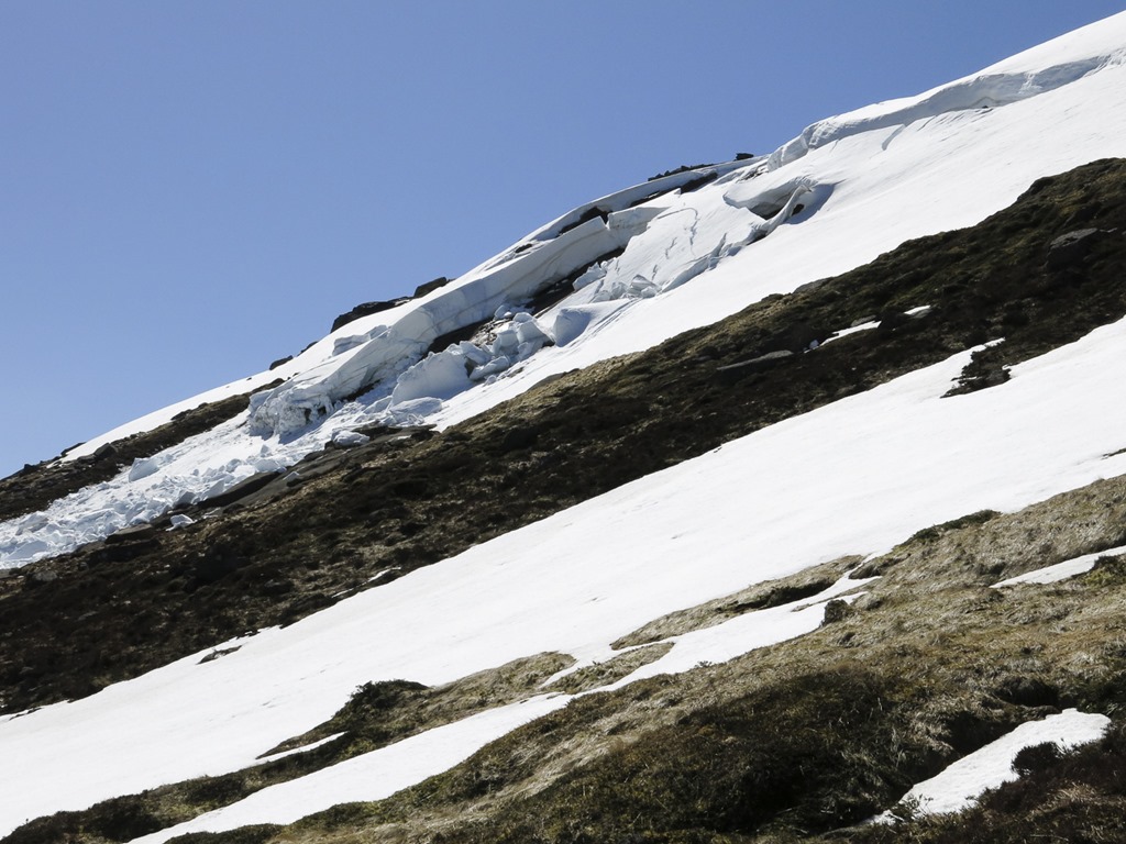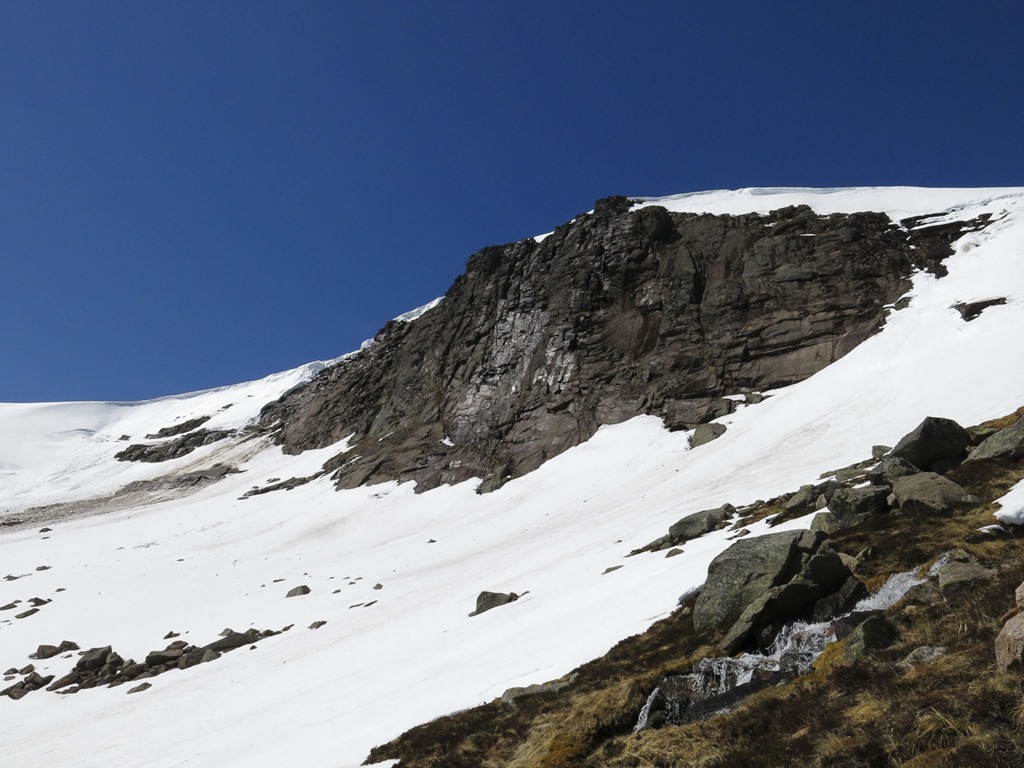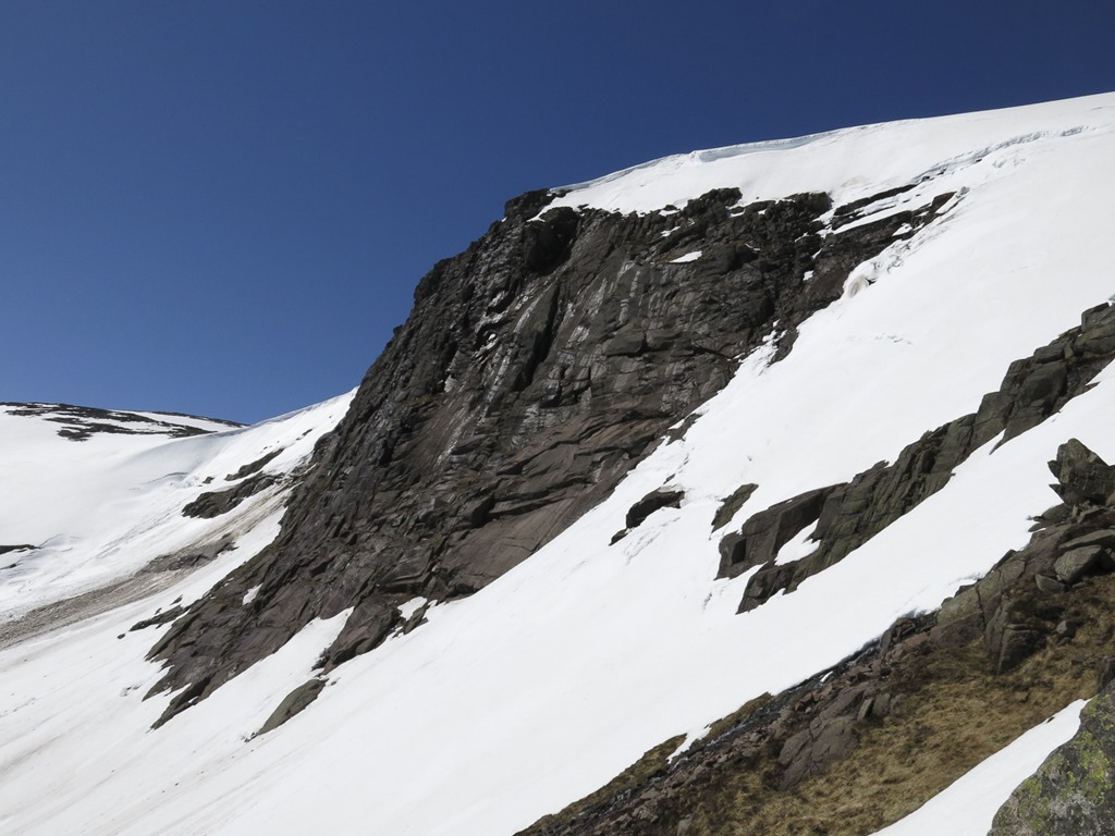 It was a great forecast so we thought we would have a day out on Cairngorm. We set of from the car park, although it was lovely and sunny there was a nip in the wind. We headed up to Coire an t Sneachda aiming for the goat track. There was still a fair bit of snow on it and it was pretty solid and icy but there were steps kicked in to it so it was fine. From the top we went down Coire Domhain and down the side of Alt Coire Domhain. We had a good look at Heel’s Lum Crag, there was a recent snow and rock avalanche from the cornice at the top. We didn’t get across to the Shelter Stone as the stream was a bit full and we didn’t want to paddle! There was a scramble up the slabs at the side of the Shelter Stone Crag but there was a lot of snow still on it. We walked along Loch Avon past some great camping places and beaches and up to the saddle up passed another avalanche to Cairngorm and down by point 1141 and down the fiacaill ridge. A great day.