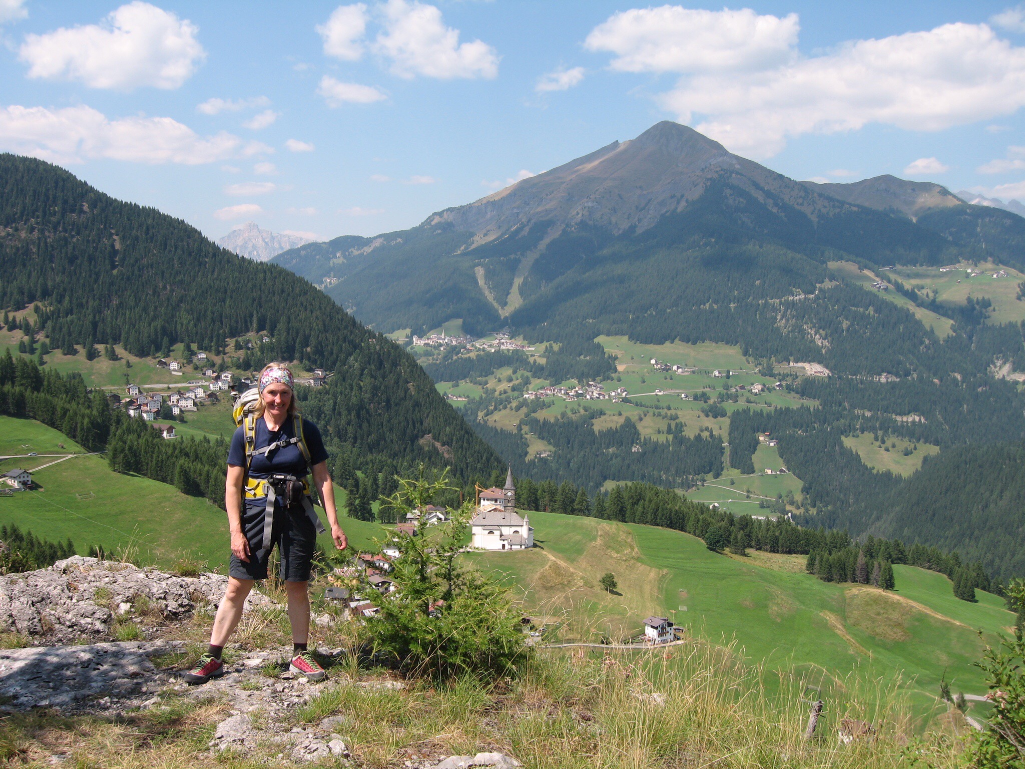 Another fairly relaxing day, we went to Arabba and stopped for a coffee and checked out the cable car for tomorrow. Then headed down the valley and up the other side to Ronc. We were just going up a short climb to the top of a small peak. It is the sight of many bolted routes not surprisingly as it was really a giant lump of rock with very straight sides.