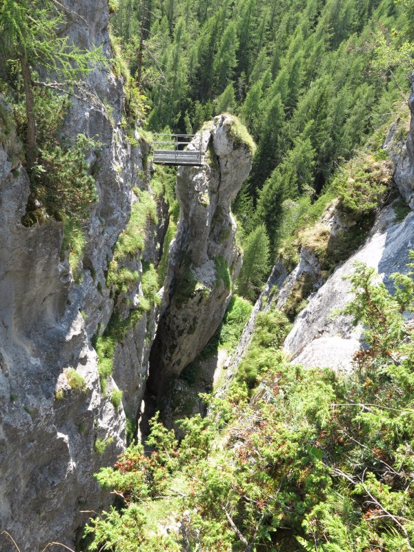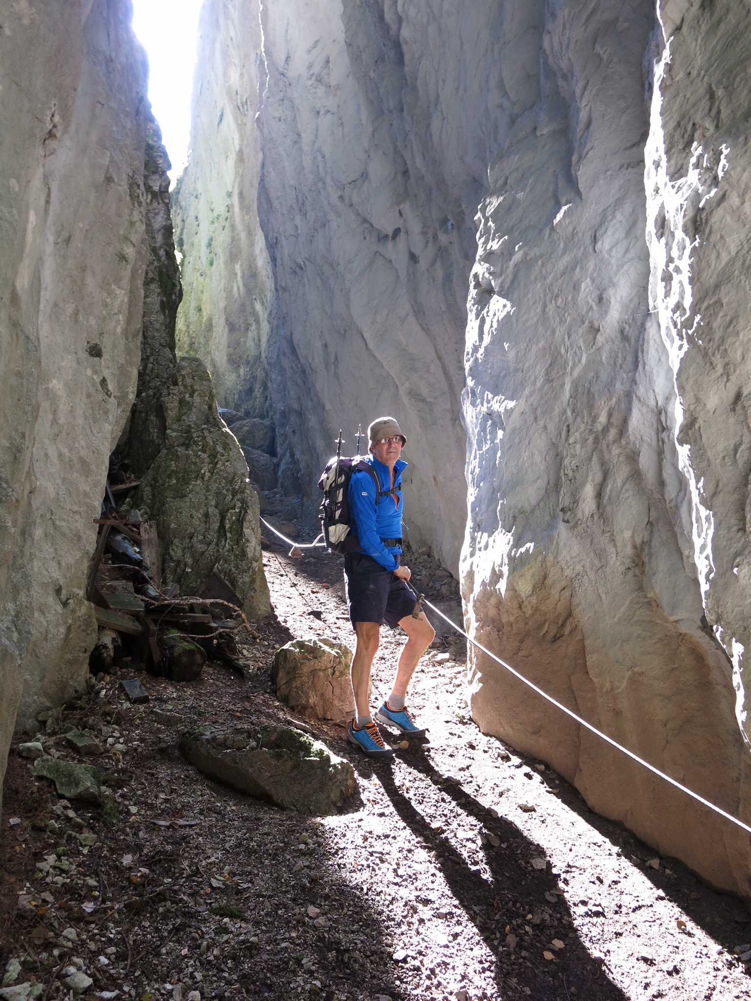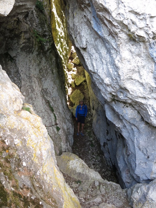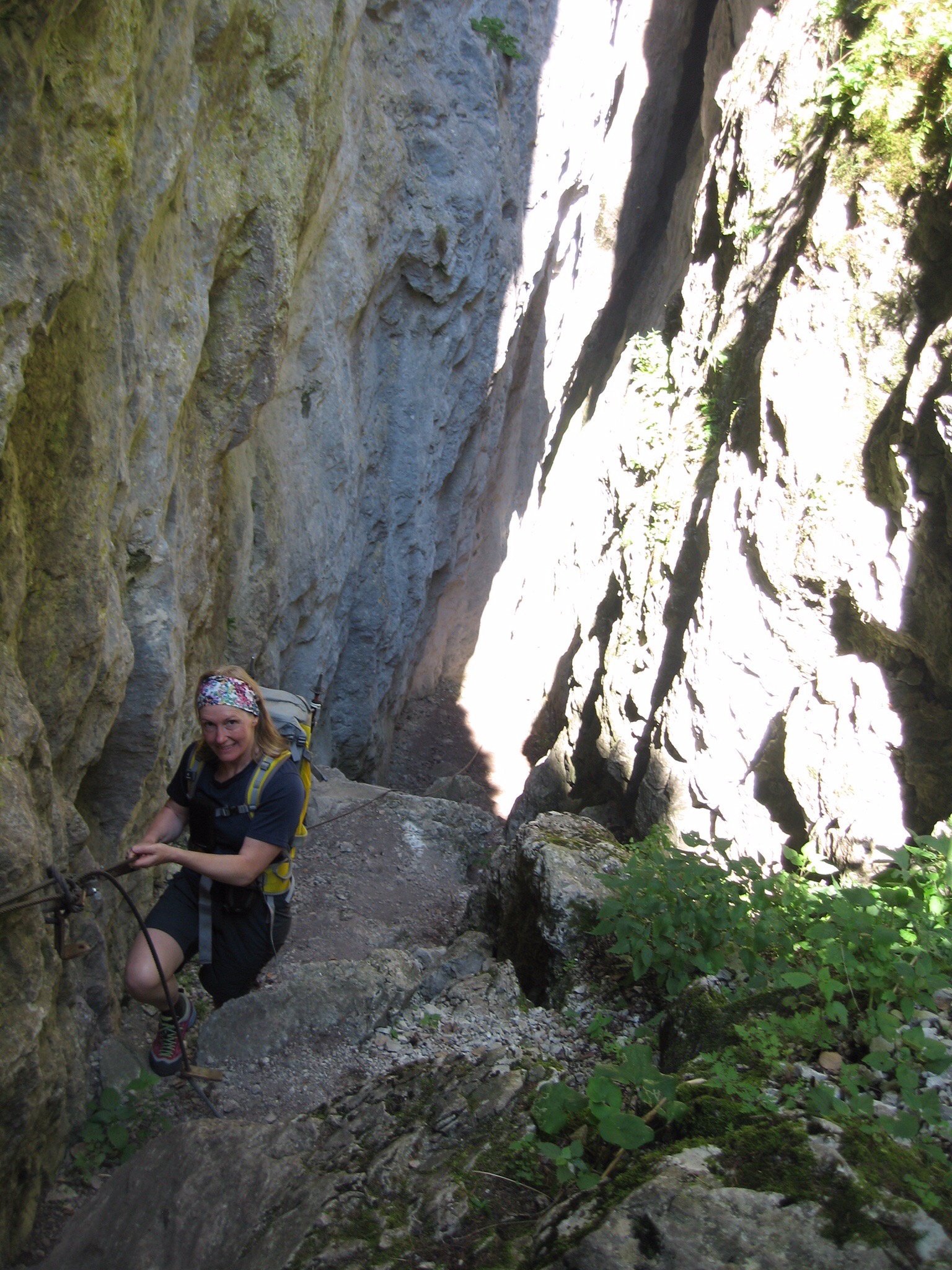 After an initial false start we retraced our steps and easily found the cleft in the rock that marked the beginning of the gorge. We went up a ladder then staples and then more staples and a nice little path to a bothy. And up to a view point. Coming down we went down the other side of the gorge and found more staples but they were a bit dodgy so we went back up the gorge contoured round and under the bolted routes and down through the wood to the c road and the car. Lovely.