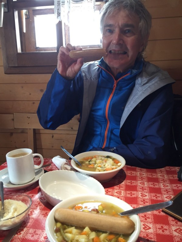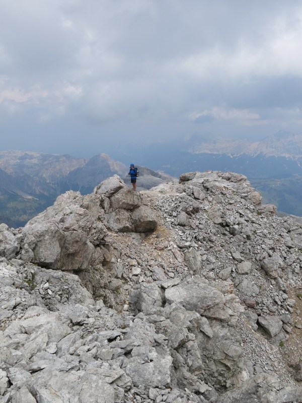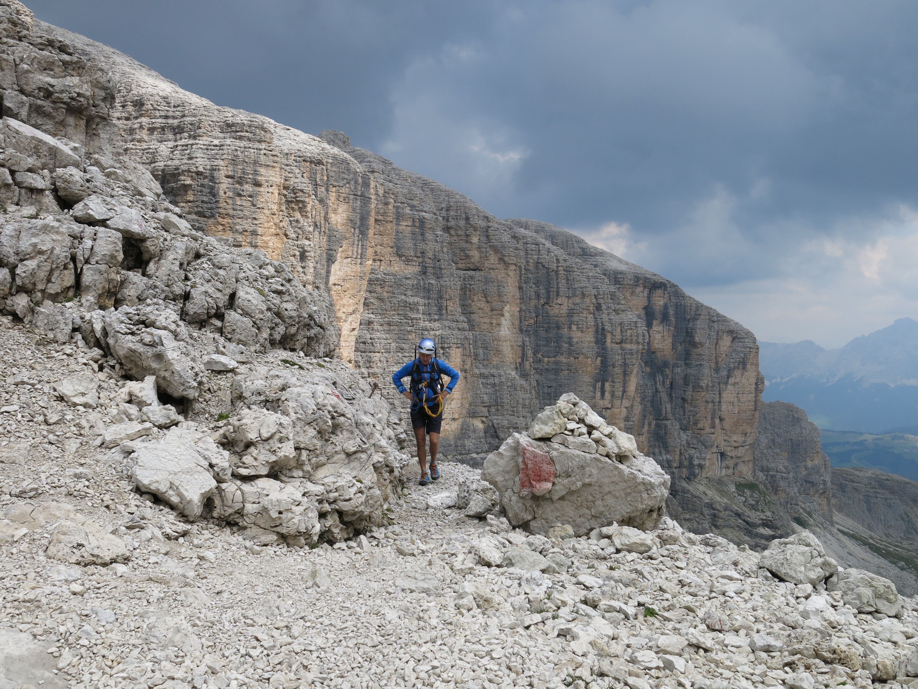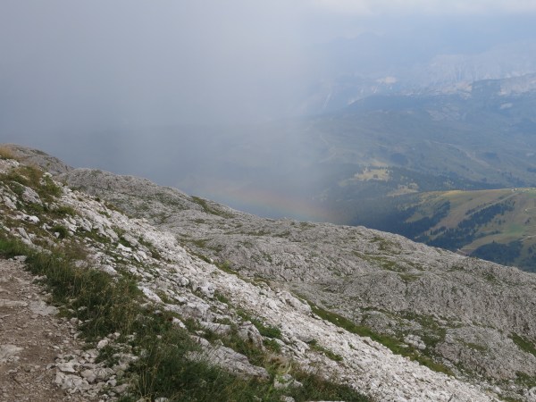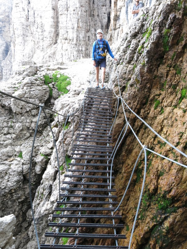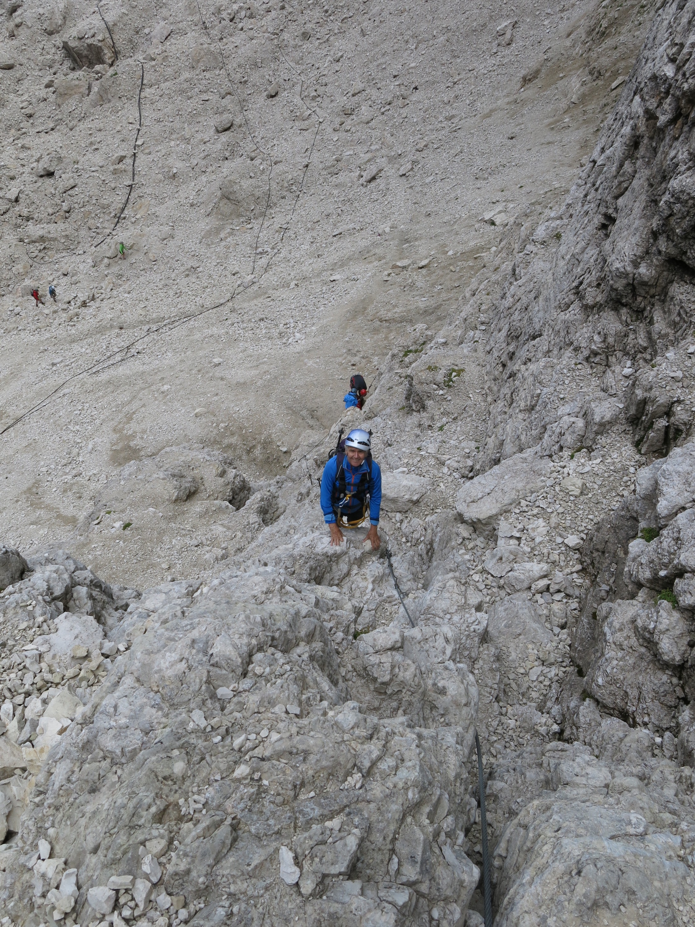 Another early for us stat with breakfast at eight. We then sorted our self out and set of on foot for the cable car Boe. We were going up the cable car and then the Vallon chair lift. At the top we traversed round the basin at first no one was going our way and I was a little worried about the bridge still being there. We had a little trouble locating the star but another party came up behind us who headed straight for it. That helped! The route was fantastic a lovely scramble to the bridge and after a bit more challenging. At the top the heavens opened for a while it was much colder rain than we were expecting and then hail. We could hear thunder. The quickest route back involved an other via feratta which we were not to sure about! Luckily it was just a shower and the sun came out. We continued up to Piz Boe going over Piz Lago Gelato 3,009m on the way. At the top we went into the refuggio and had minestrone soup with sausage. Lovely. It was at this point that I realised that we had only bought single lift tickets instead of return! But did we panic no we did not. We walked back to the refuggio near the chair lift. Lost of thunder and lightening but no rain until later. We walked down to the cable car and bought no tickets for that. A good decision we thought as we would still have been walking down even after we had finished our evening meal. Of pizza and salad and a nice beer. Excellent day