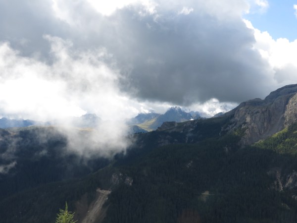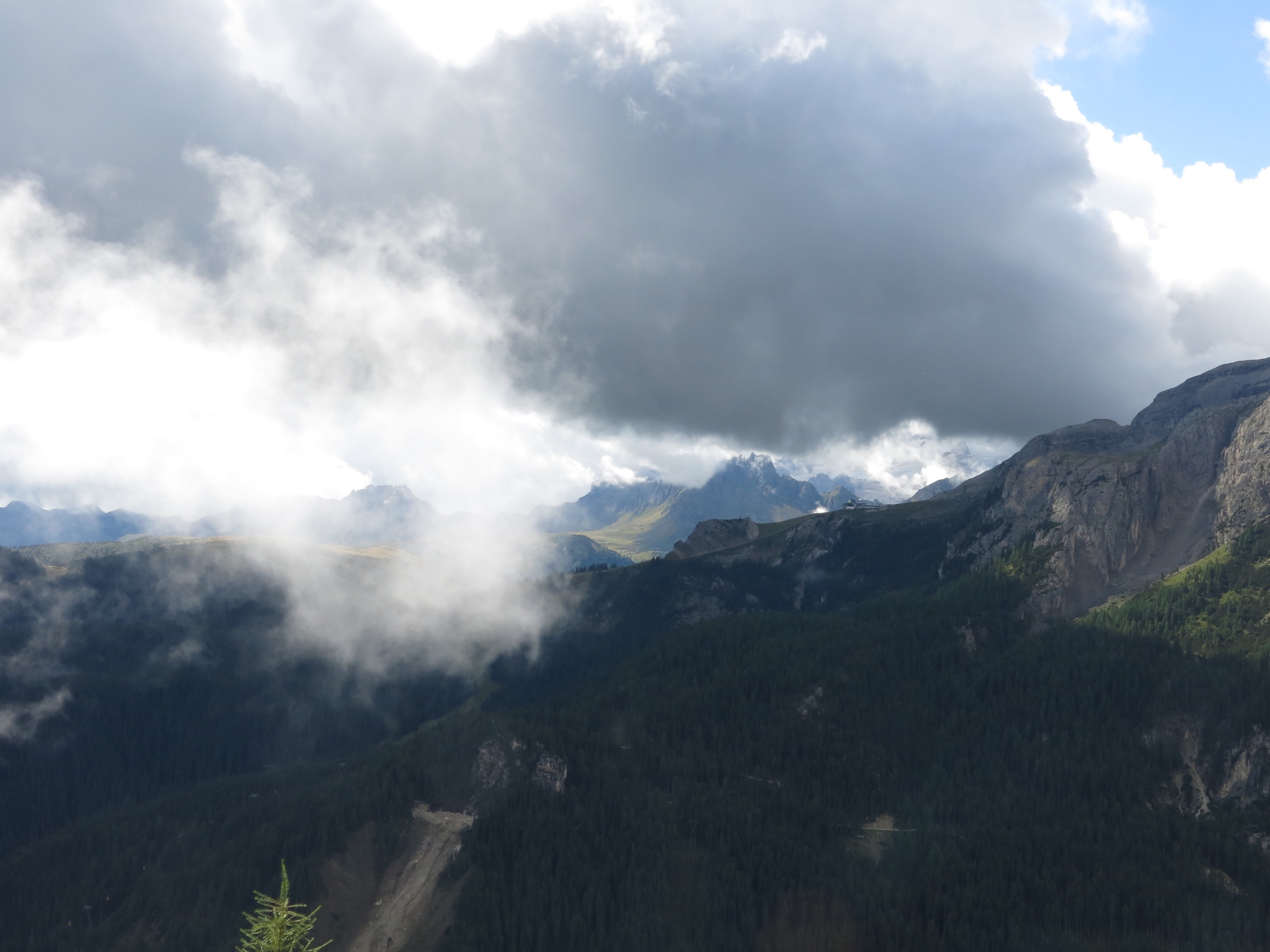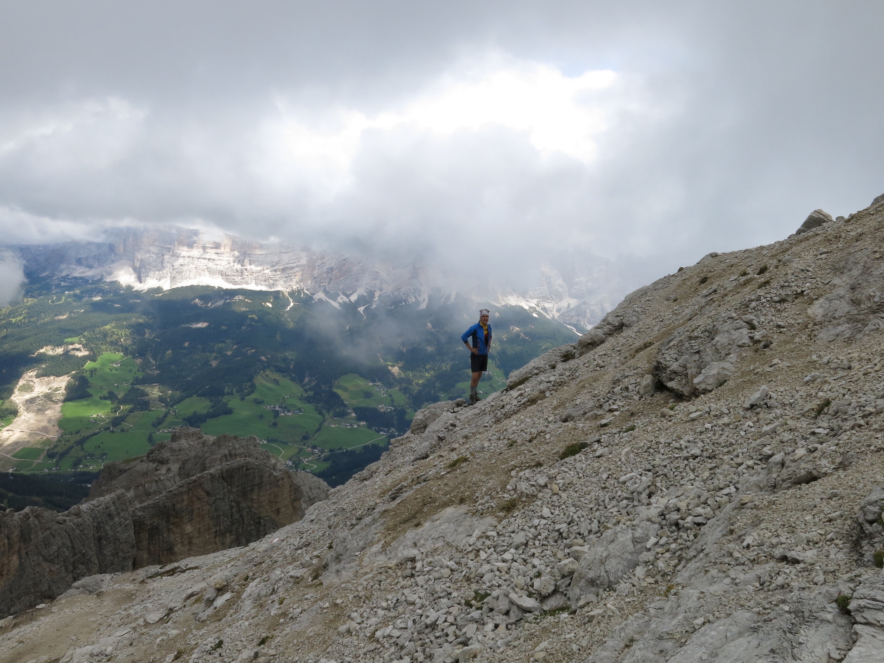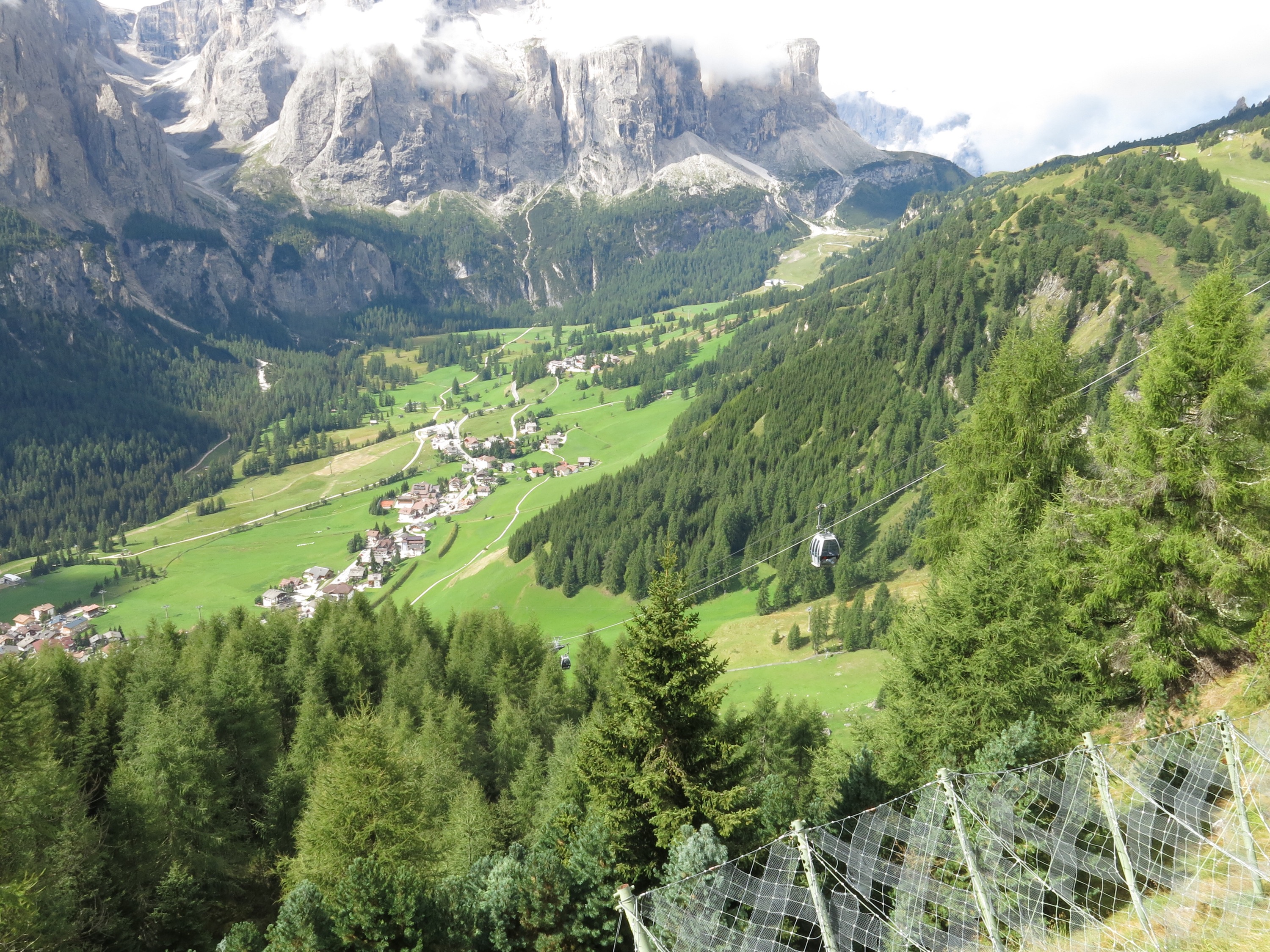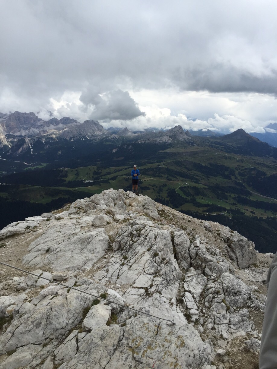 Today we decided to go up Sassongher. There is a via feratta which is described as more like a scramble or a protected walk with a few wires in place. We went up the cable car from Colfosco to Col Pradat. The cafe at the top was amazing with fusions and furs on the seats. At that point the sun was out and we dalyed a bit in the sun. It has been a bit lacking this week. The then traversed round to the ridge walked up to the col and the pen the final push to the top. It did cloud over but we were lucky enough to get a clear view on the top. We had a bit of rain later but we were dry when we got back to the car.