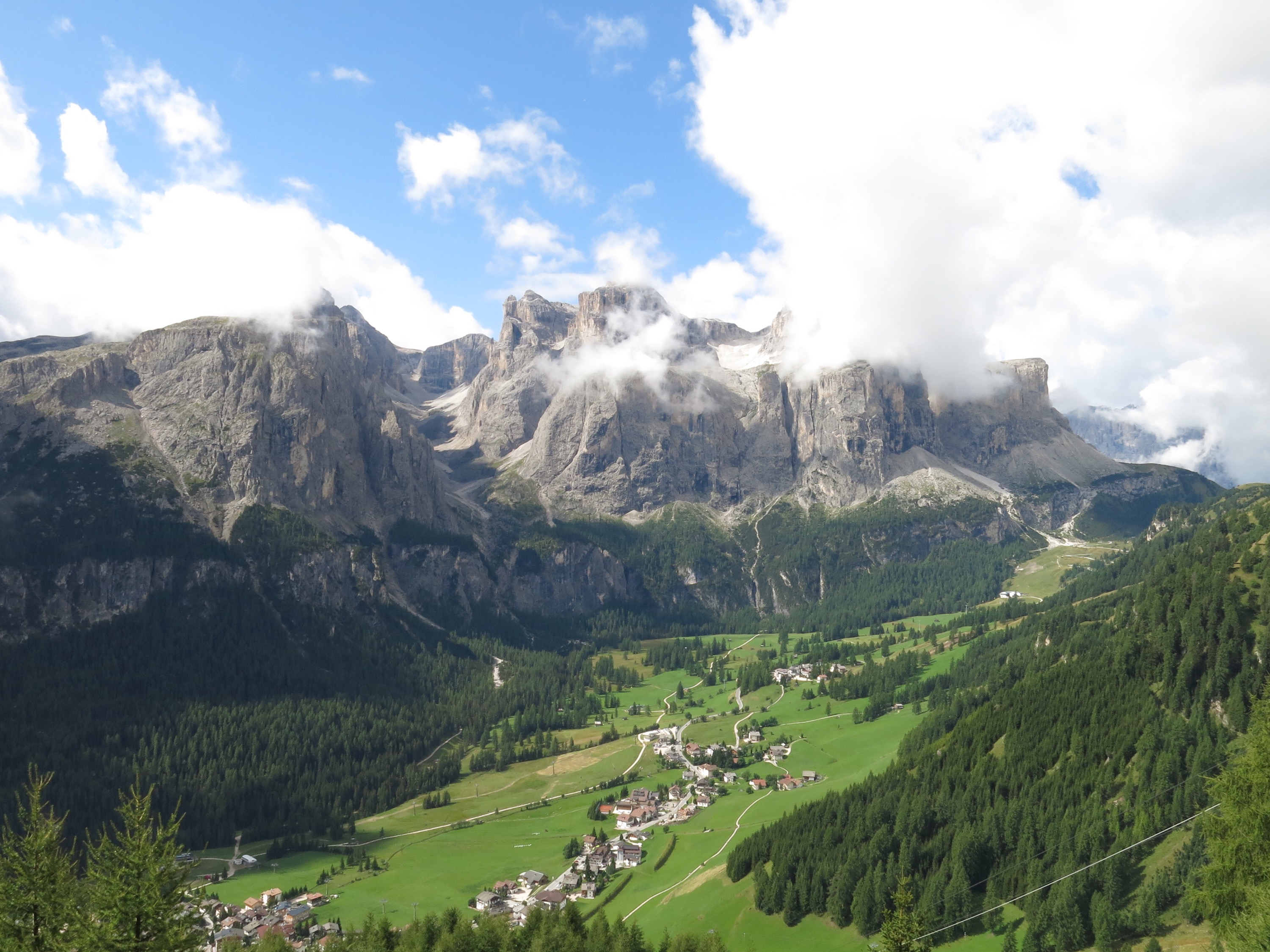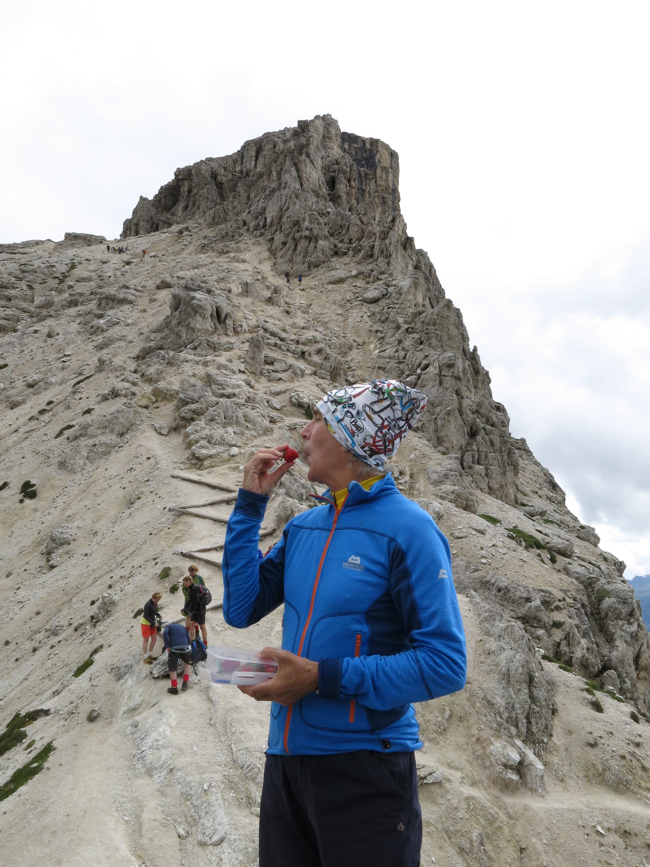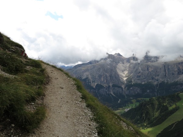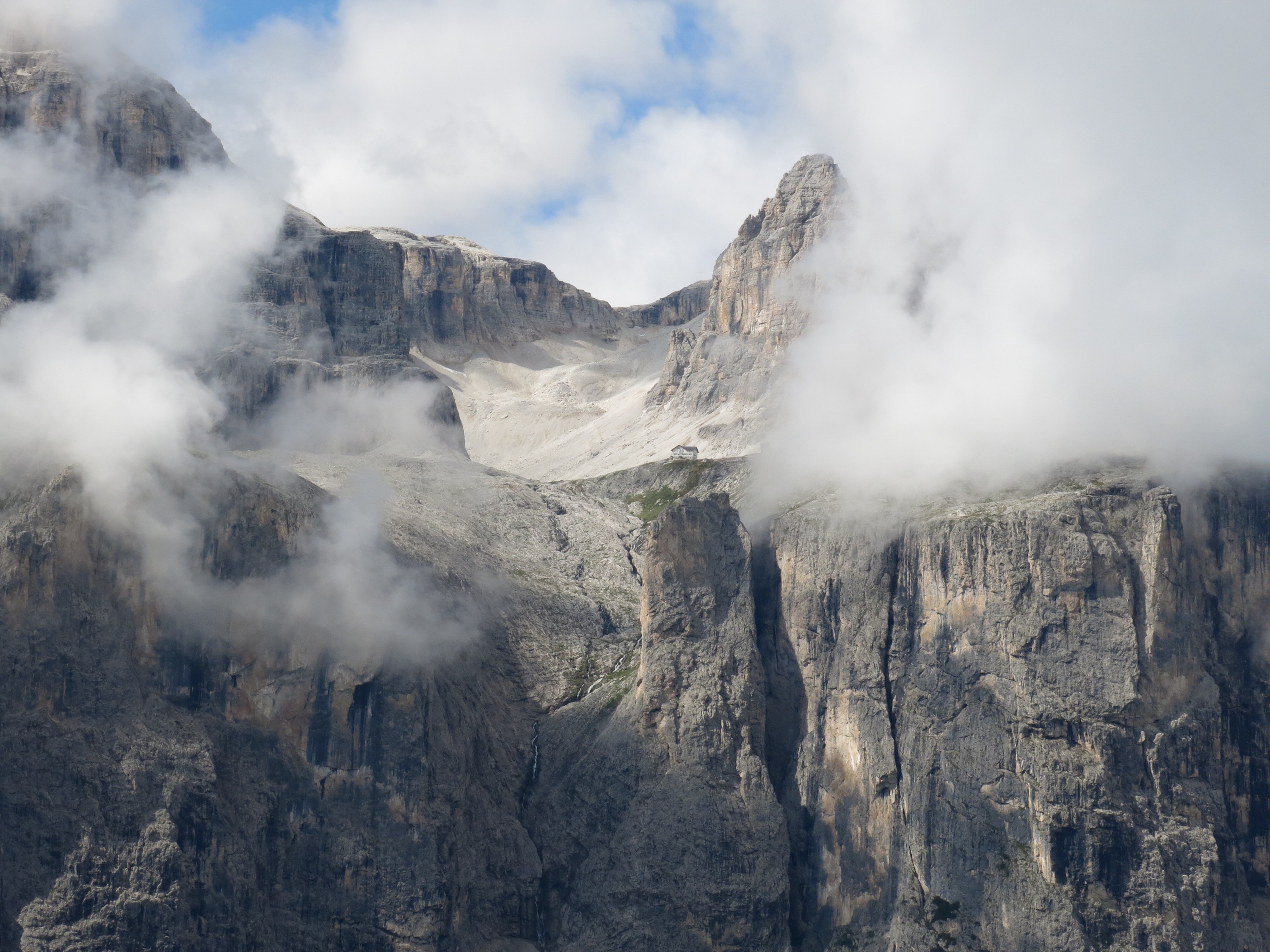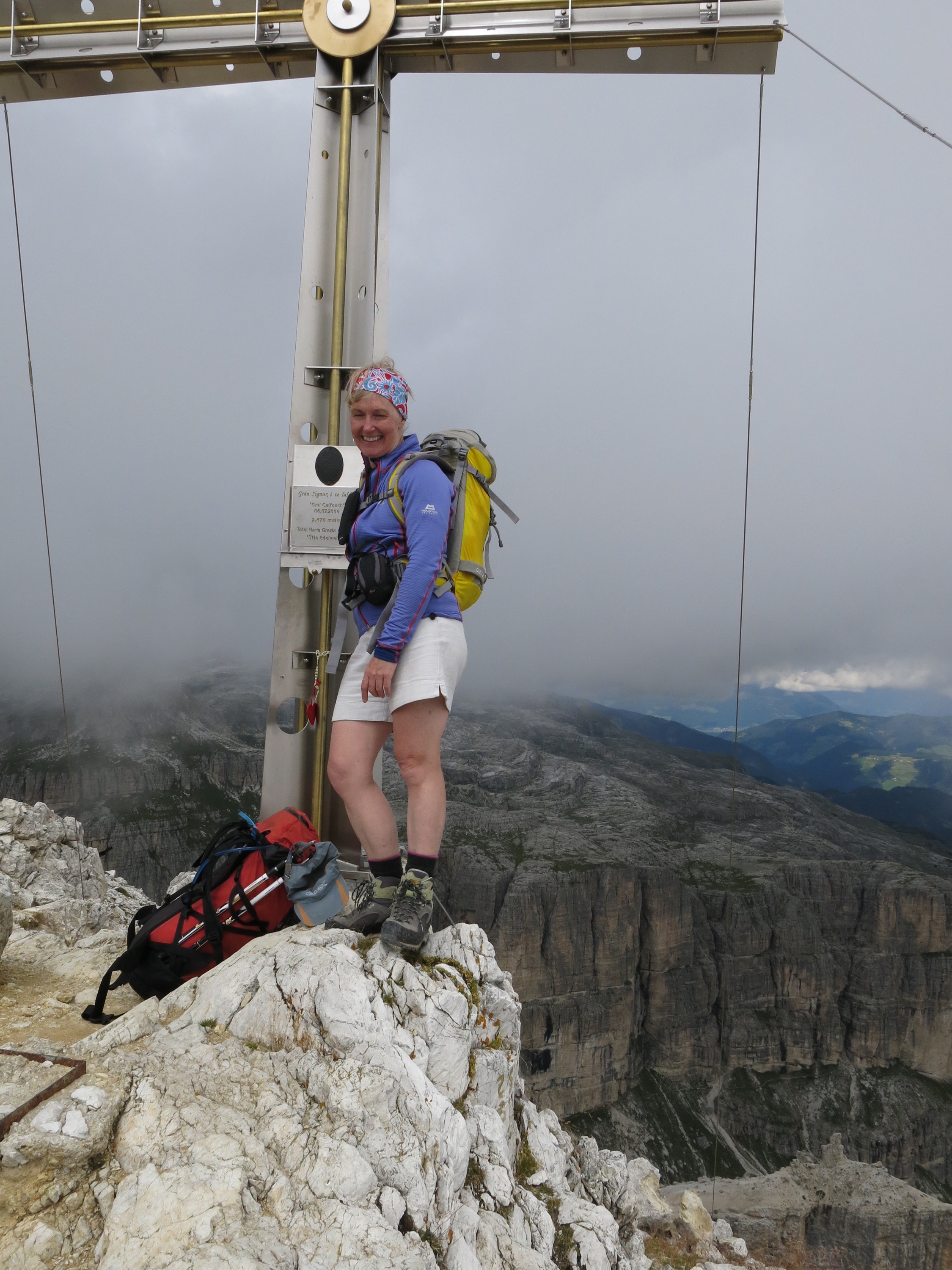 Today we decided to go up Sassongher. There is a via feratta which is described as more like a scramble or a protected walk with a few wires in place. We went up the cable car from Colfosco to Col Pradat. The cafe at the top was amazing with fusions and furs on the seats. At that point the sun was out and we dalyed a bit in the sun. It has been a bit lacking this week. The then traversed round to the ridge walked up to the col and the pen the final push to the top. It did cloud over but we were lucky enough to get a clear view on the top. We had a bit of rain later but we were dry when we got back to the car.