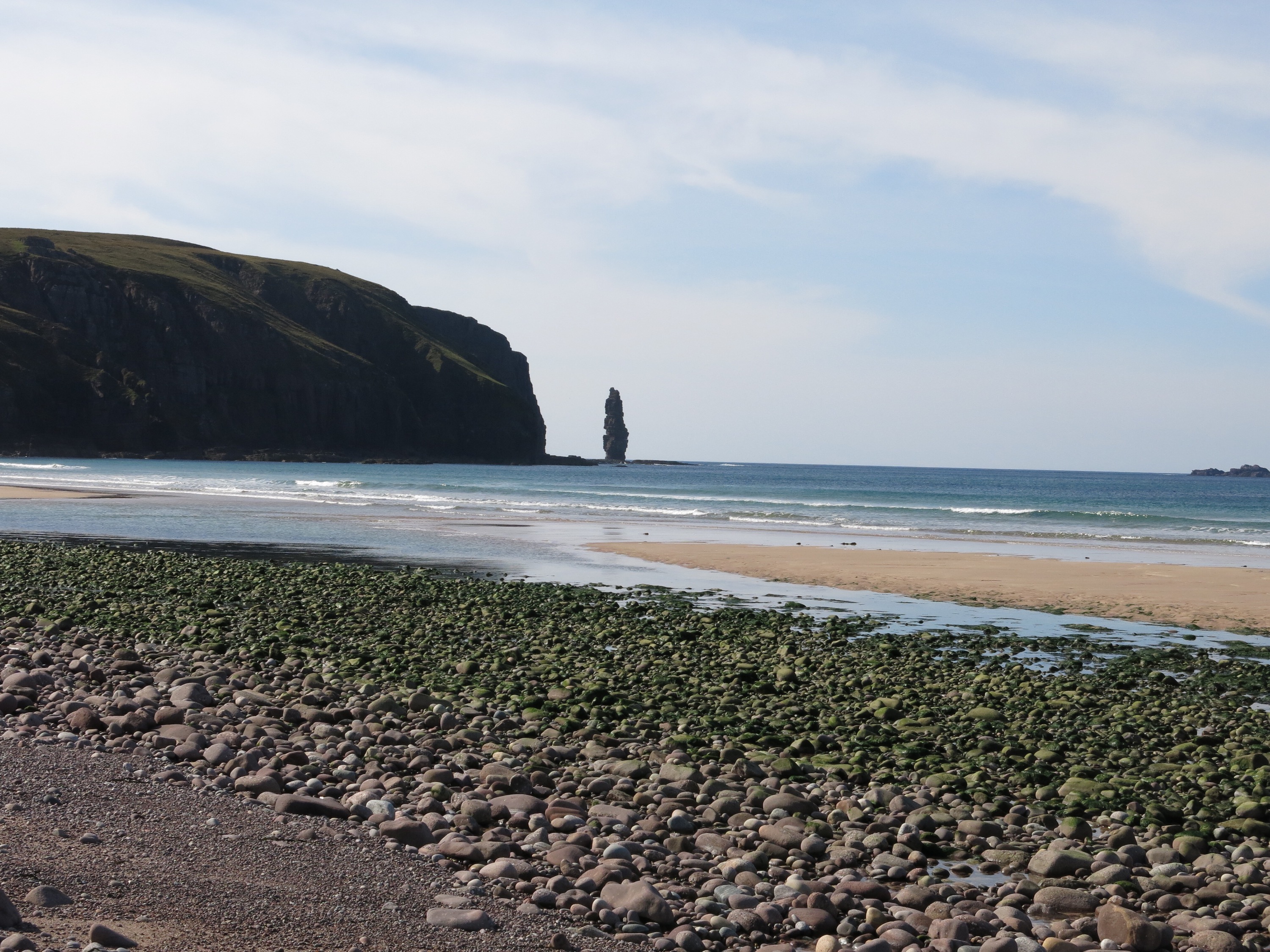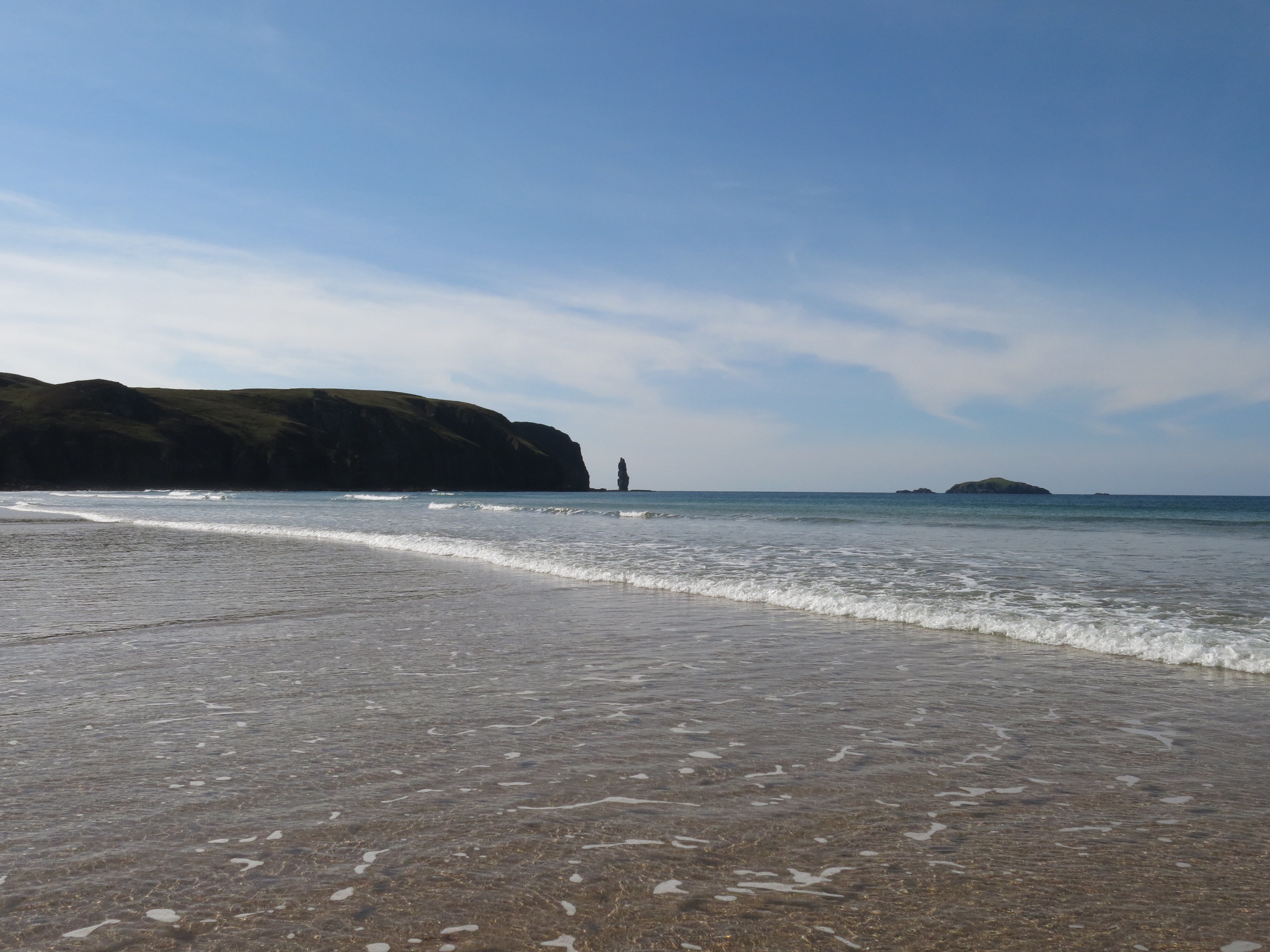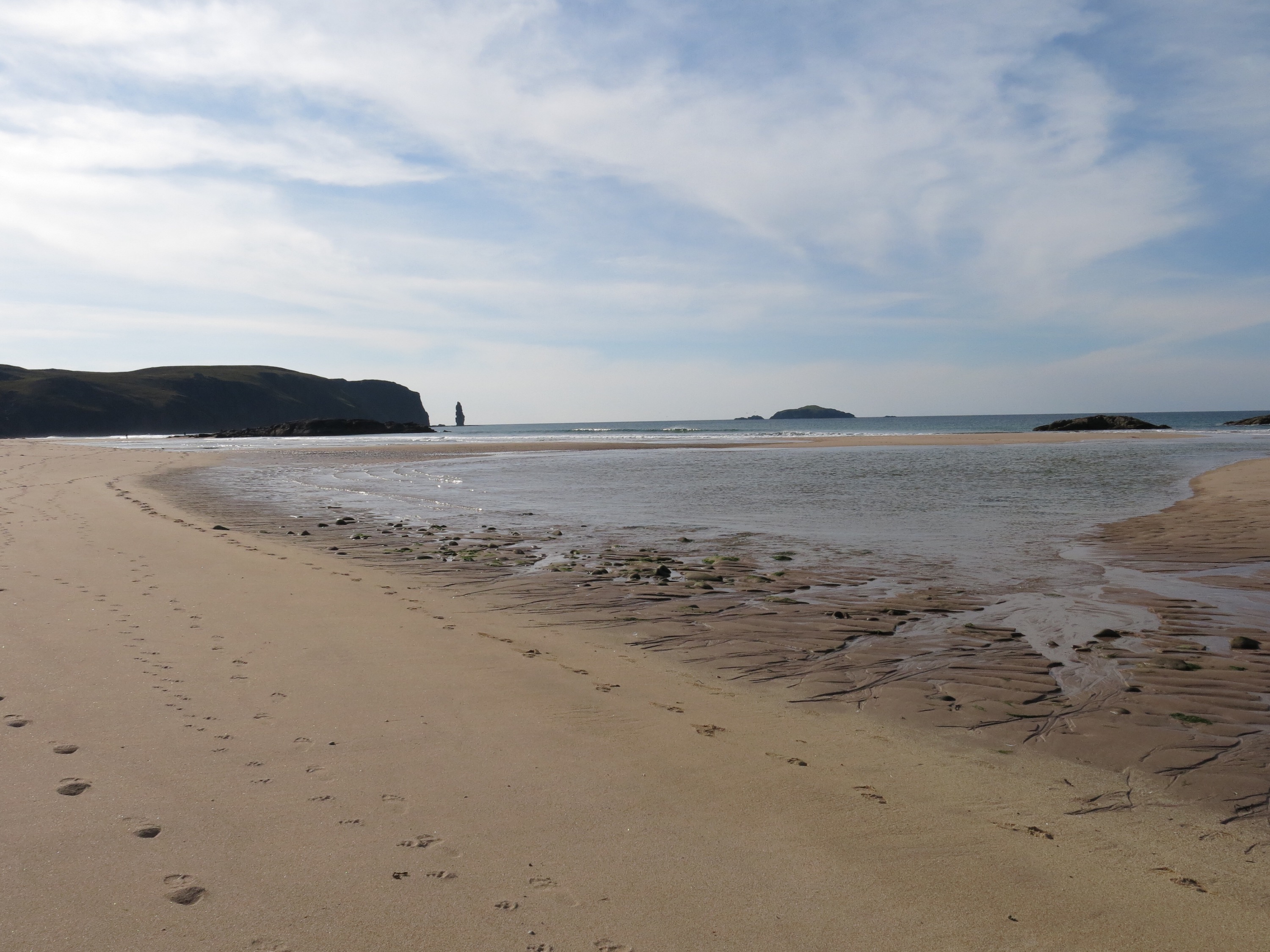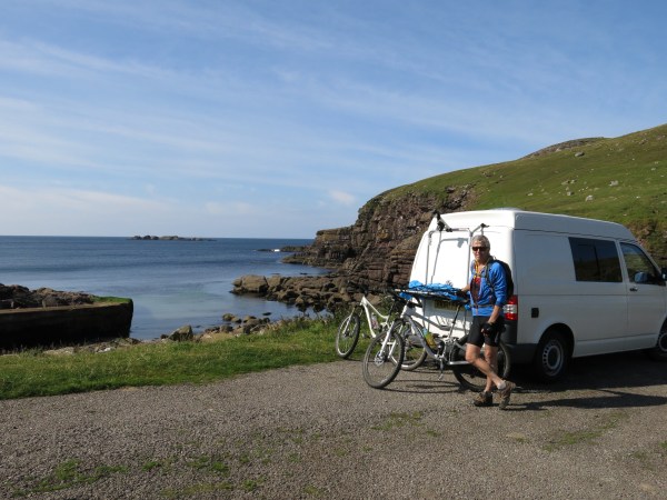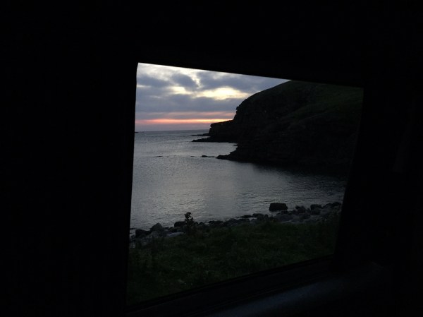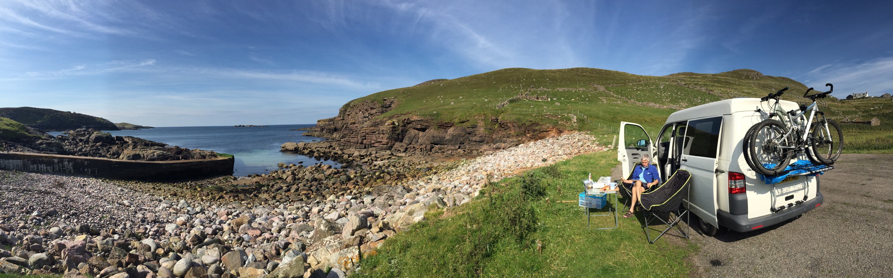 We set of last night after my wedding at the Big Husky Lodge. Stopped at Lairg for tea and saw Chris Bonnington! After that we drove up the road and found a spot to stop. We had a bit of a midge evasion! Not what we expected but the new midge nets on the new sky light worked a treat. next morning we headed north and parked up at Droman Pier.