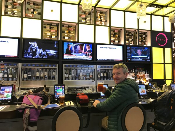 Then the journey down to Sue and Chris’ and a lovely meal out with them for my birthday Chris drove us to the airport, we arrived in plenty of time. The journey was good. The usual nonsense getting through customs in the USA even though we were only traveling through! After getting through all that we had a nice New York lager and very fresh salad.