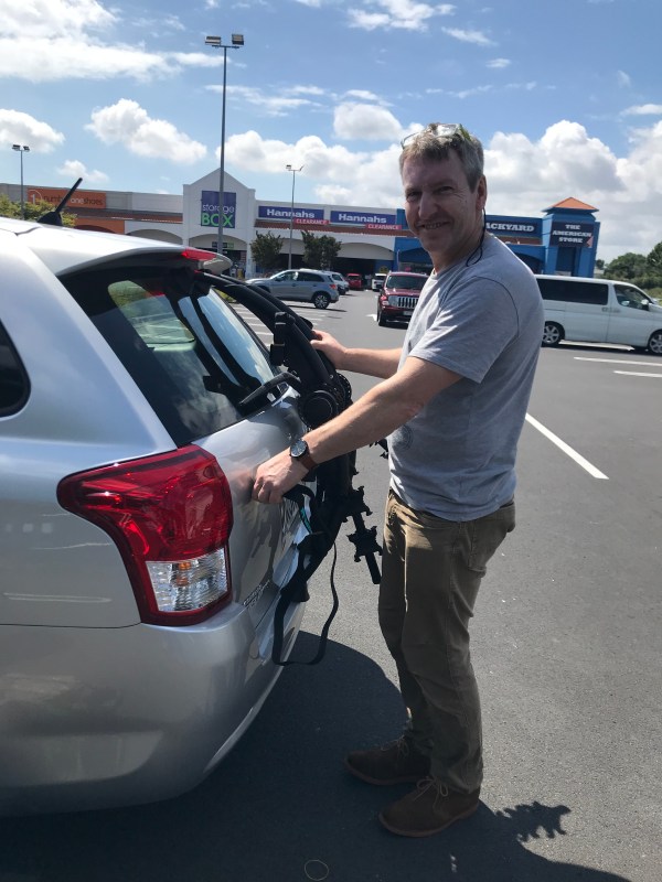 we arrived on time picked up our car, there was a bit of a faff with the bike rack we had to go get one from the bike shop that the hire car had ordered. My bike as I feared was too small but the lovely man in the shop swapped it for another. Which is a pretty silver purple and pink. Still need a bit of fannying to get the bikes properly on the bike rack.