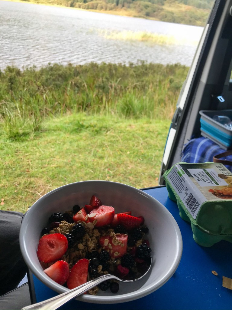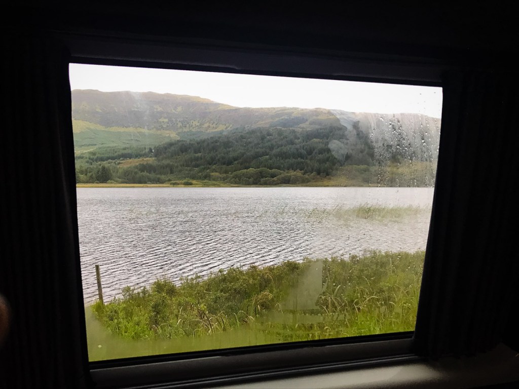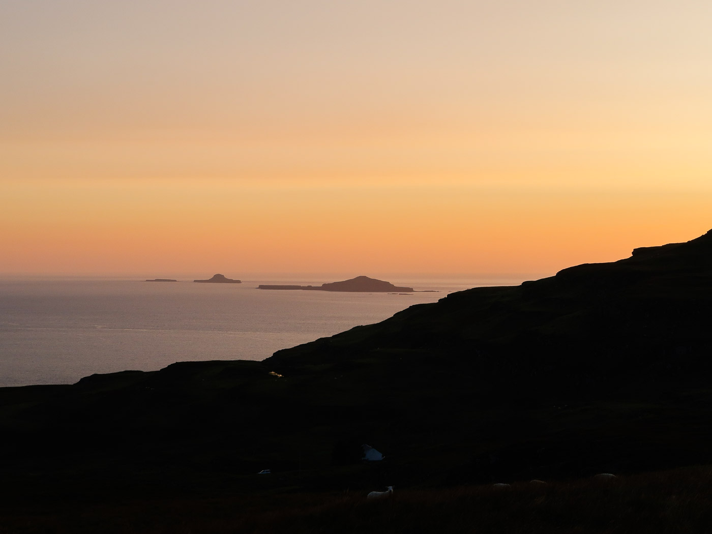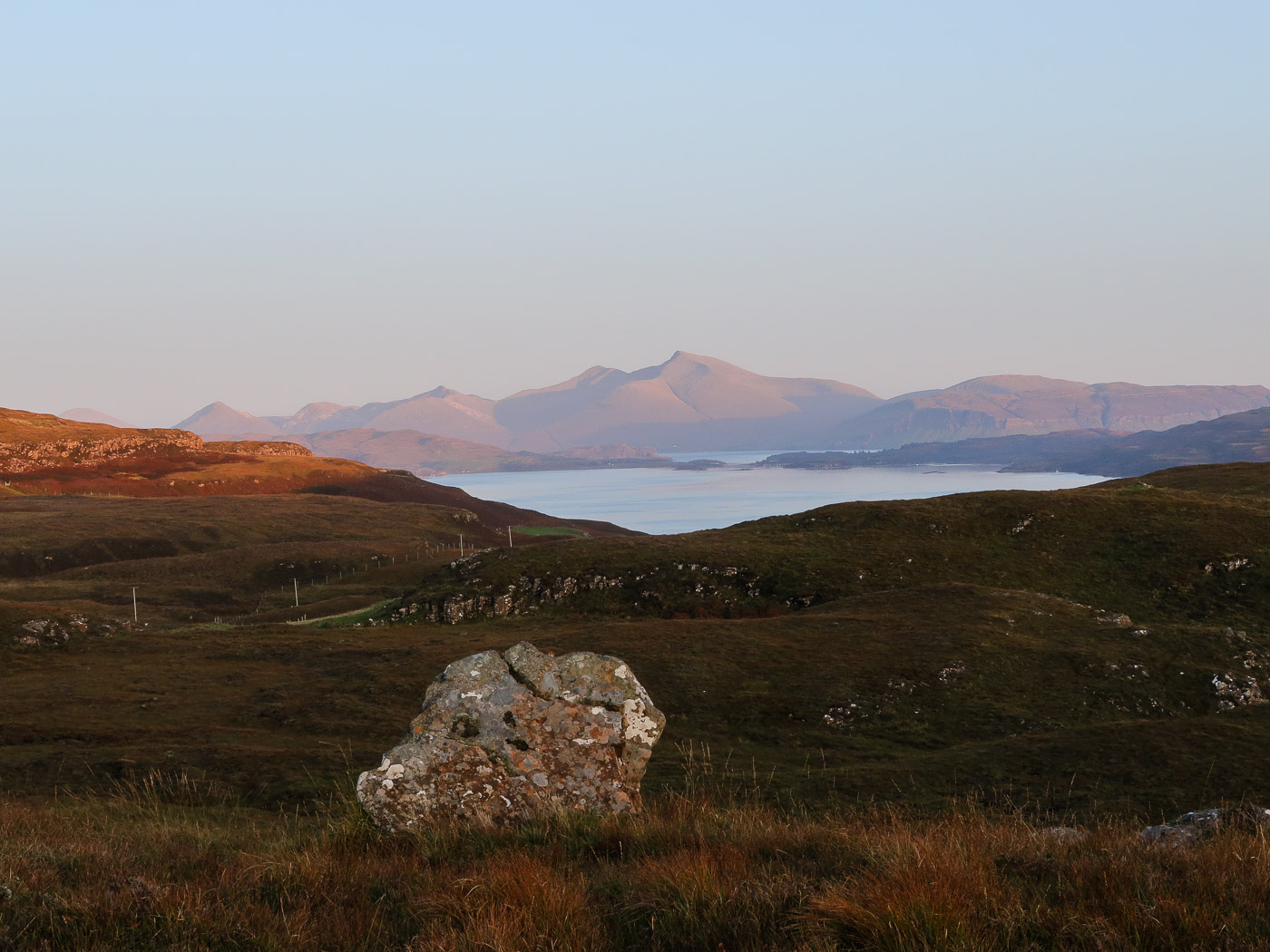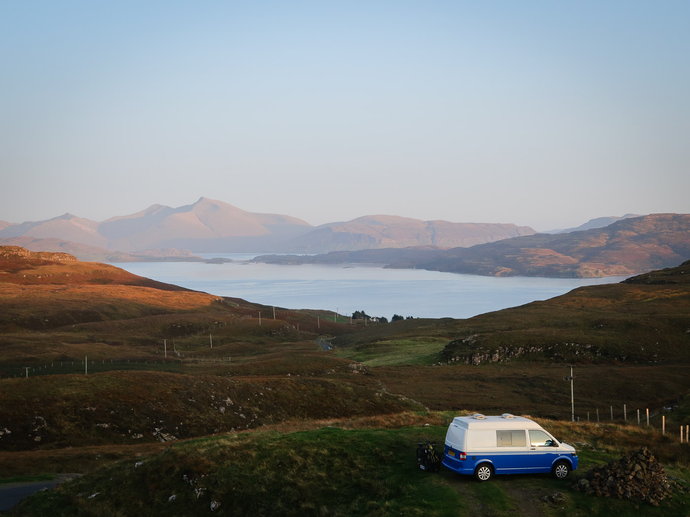 Eventually we packed up and headed to the ferry at Lochaline, we had a little wait but I went buy postcards for Joe and Kai and post a parcel for Campbell and Fiona. We brewed up in the van and watched the world go by. After the ferry trip we headed to check out the ferry times to Ulva. It was a disappointment (especially for Kenny) that they were not running at all due to covid. We shall return, so we carried on round to Calgary bay. Had a walk along the beach and shore to an old jetty. It was fairly busy so decided not to stop the night there but carry on along the road we came. We had a place in mind that was free luckily. It had great views over towards Ben More and the Corbett that Joe and I climbed on our last visit in 2016. we watched a lovely sunset and had a nice tea and evening in the Van.