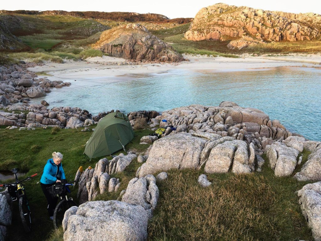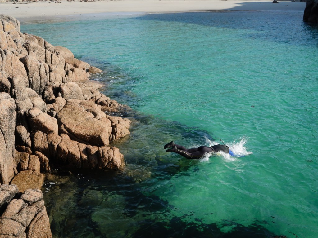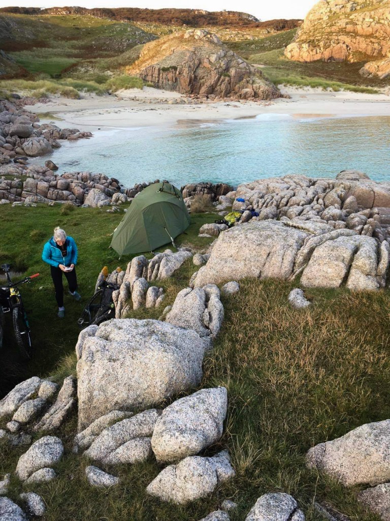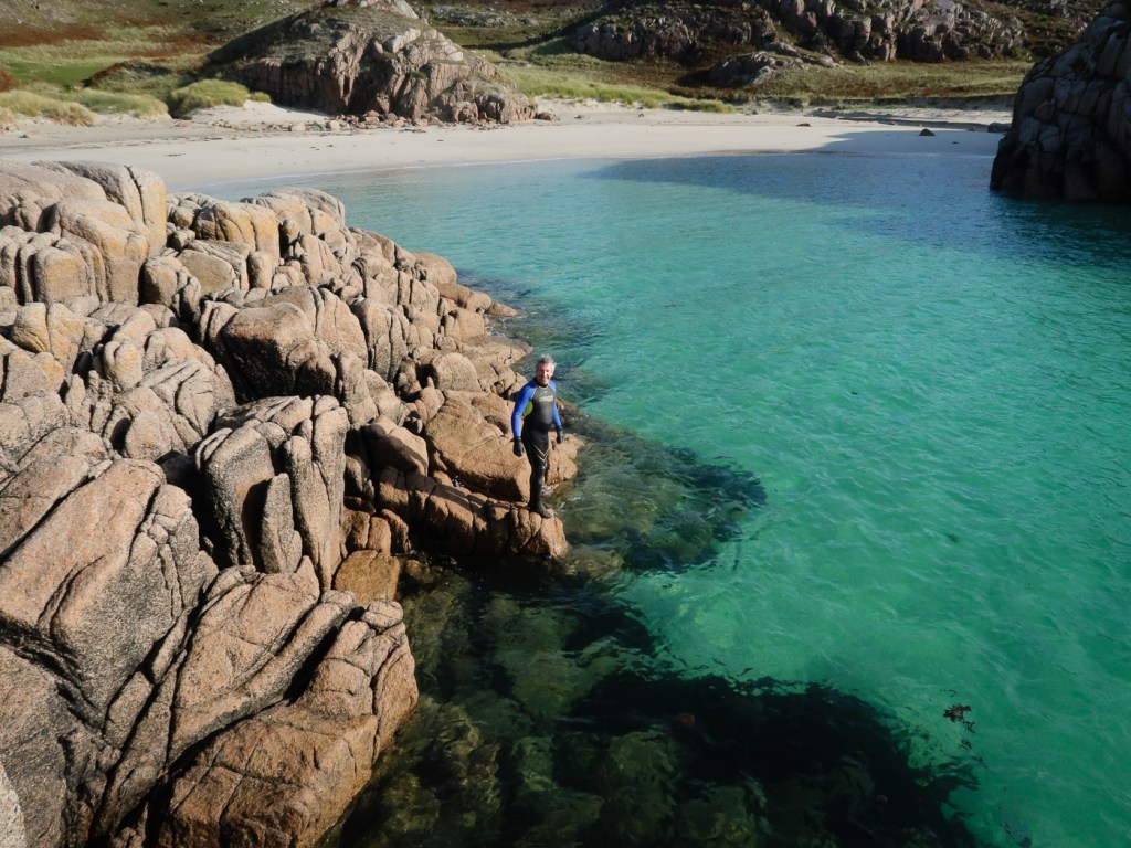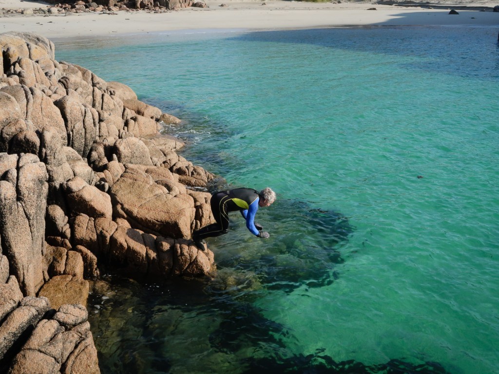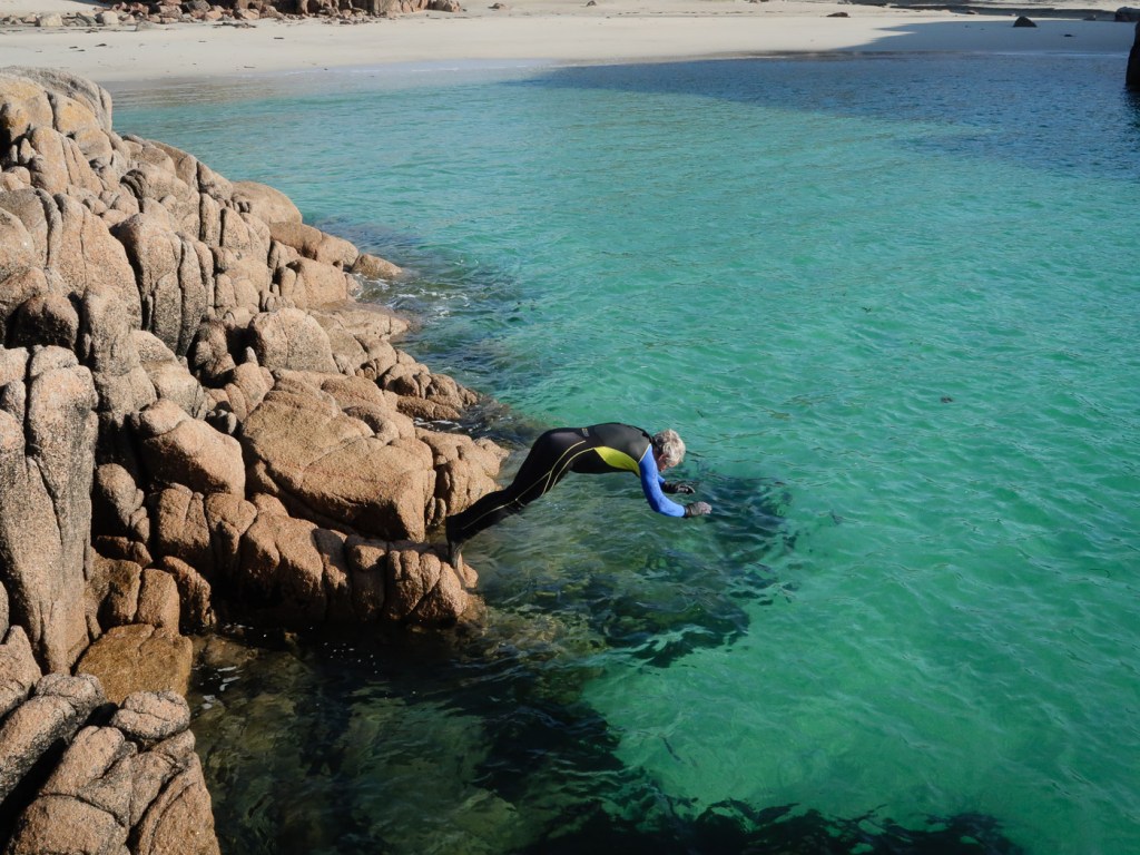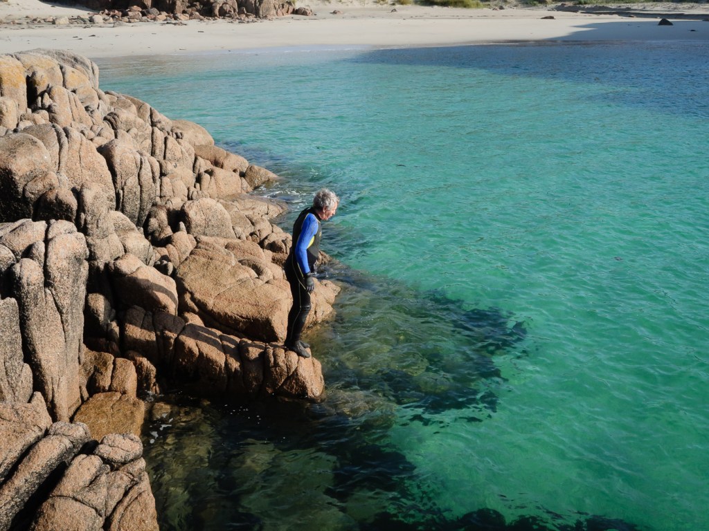 Today was kenny’s birthday adn the weather excelled itself. Sunny warm and lovely. After breakfast and the sun had warmed things up with got the wet suits on and had an amazing scramble round the little island in the middle of the bay. We swam across little inlets and to the shore – it was fantastic. After lunch we packed up all the stuff and headed back to the van. It has to be said the return journey – which was my route did not tuen out as imagined. It was mostly hike a bike and deer fences. but character forming!!!