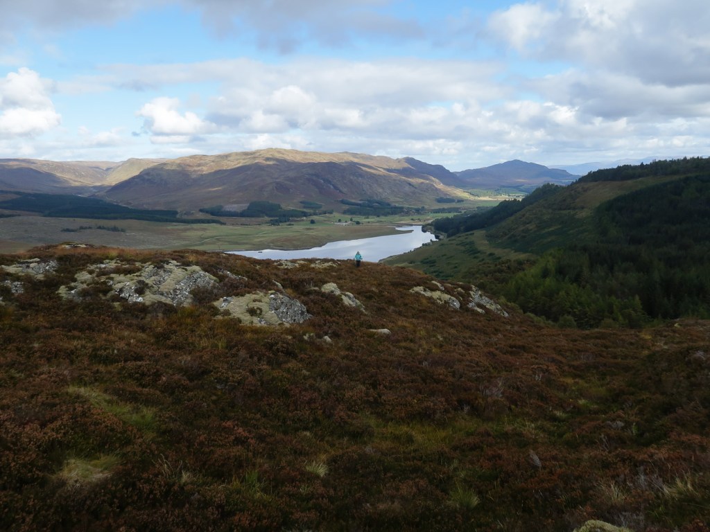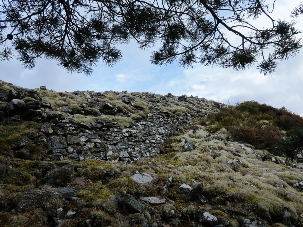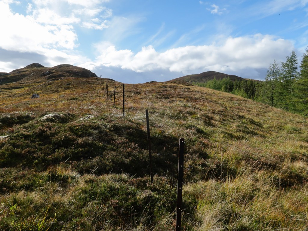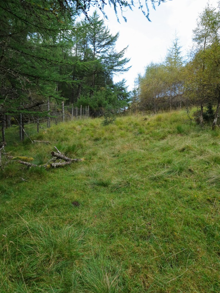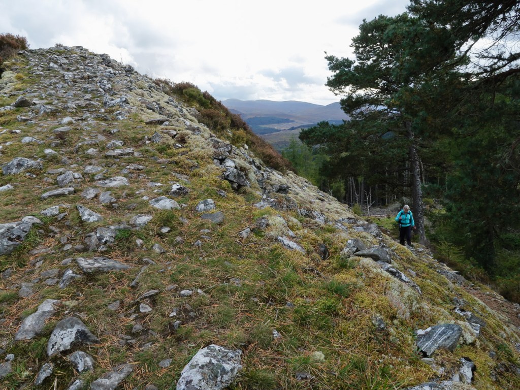 I picked this route out of my Grahams book, it seemed a good length for a short day walk and it was near the hills Joe and I were up a few weeks before so it is always nice to do a few in the same area. Chris joined me Dot was a bit broken after an epic walk a few days before. The route looked unlikely at first as we looked up a field to a dense wood that was to be our way up. In fact though there was a little path the went up and then there was a gap between the two types of woods. We emerged from the woods onto a little ridge that gave us wonderful views back down to Laggan. The ridge curved round and after climbing a deer fence we reached the trig point which was the summit. We aimed for another fence and wooded area via a boggy low bit that wasn’t as boggy as it looked. Though the gate and over rough ground until we picked up a way marked path that took us along another lovely ridge and down to a junction. We headed up to explore a old fort before a walk round via forest tracks to Chris van which was parked strategically to avoid a 2 Km road walk.