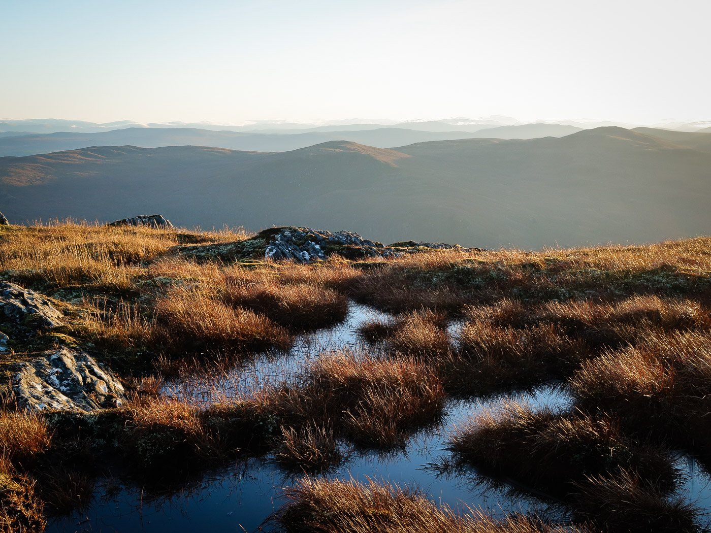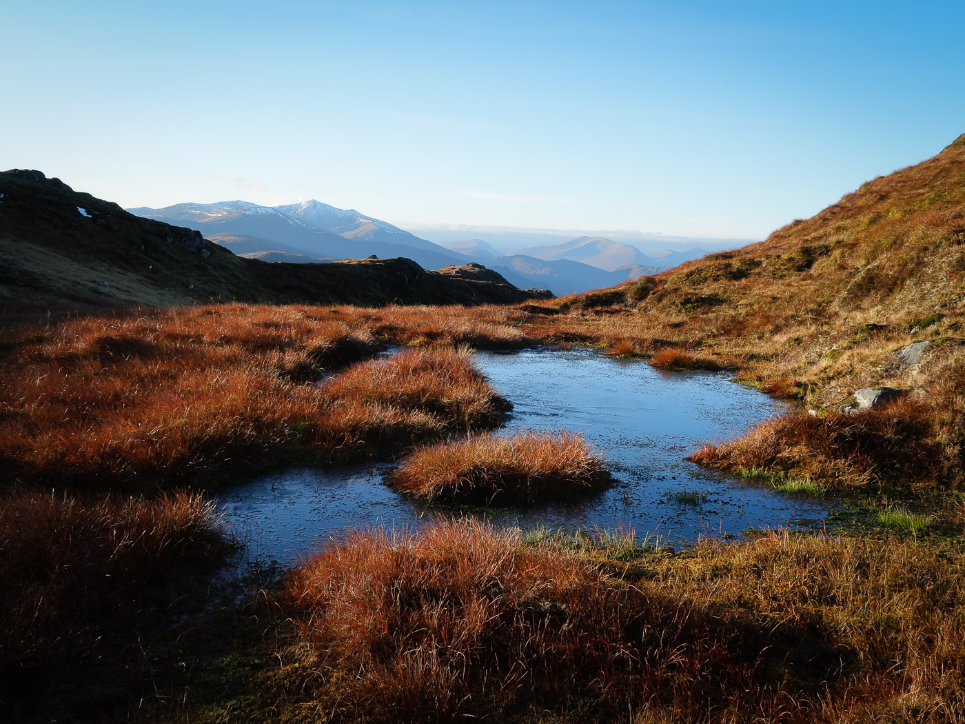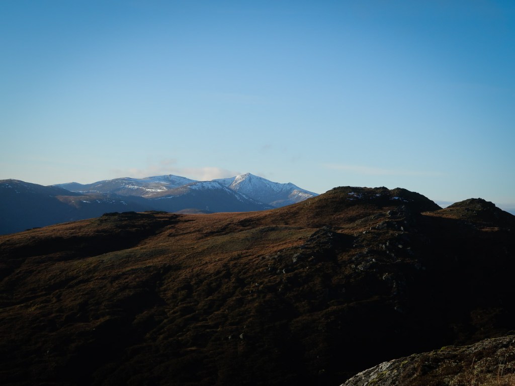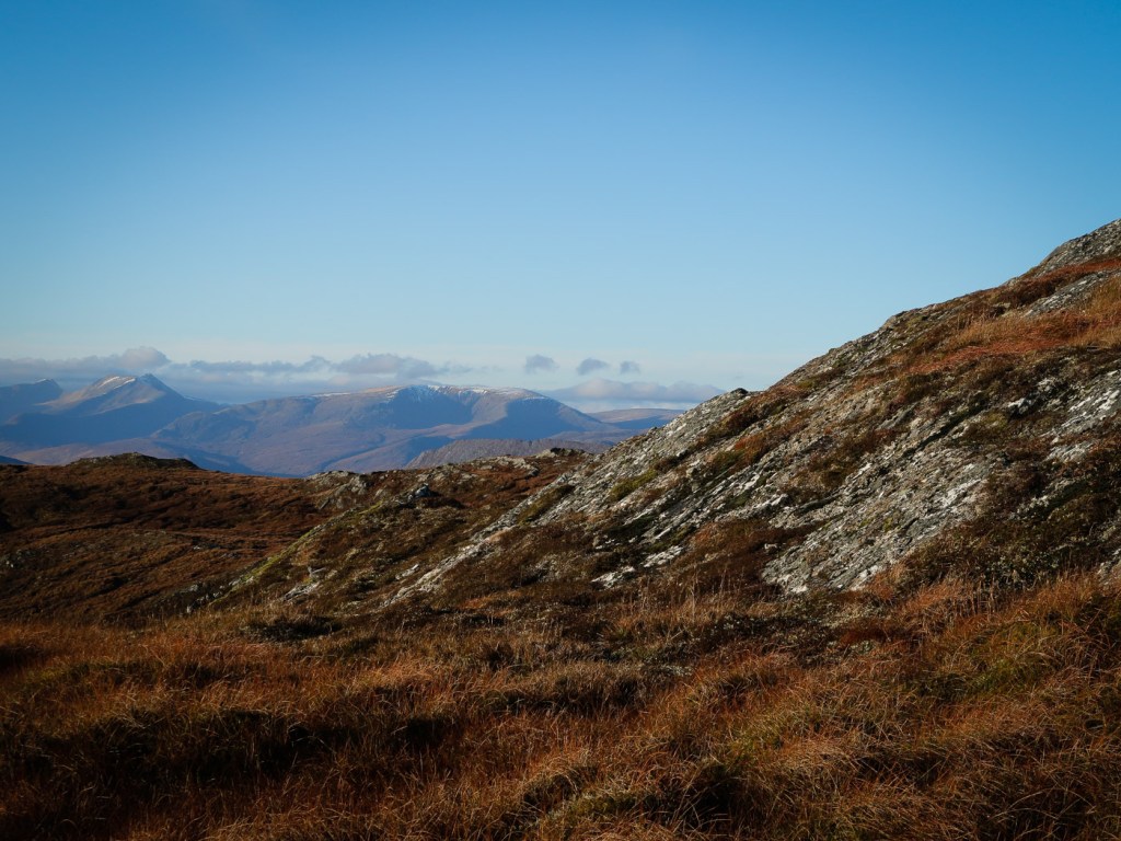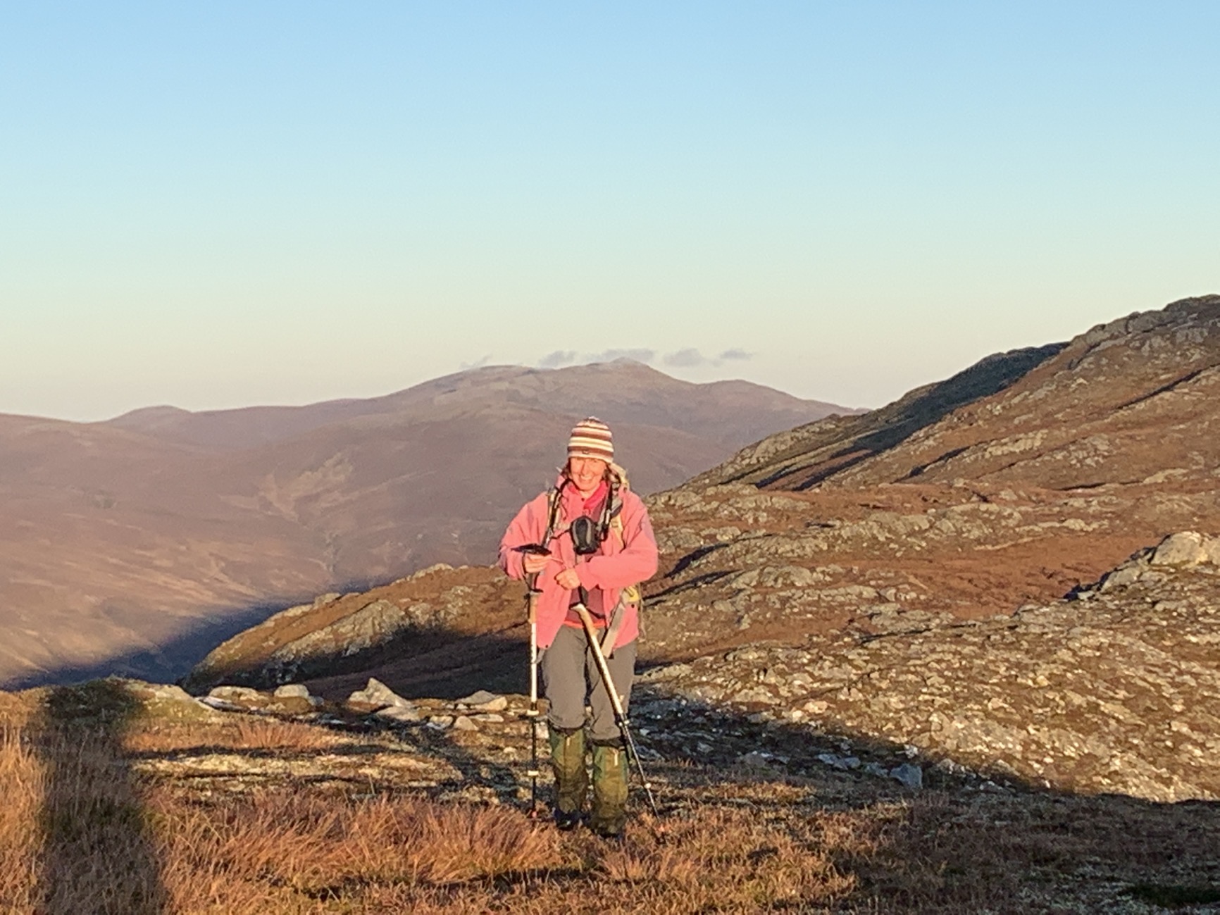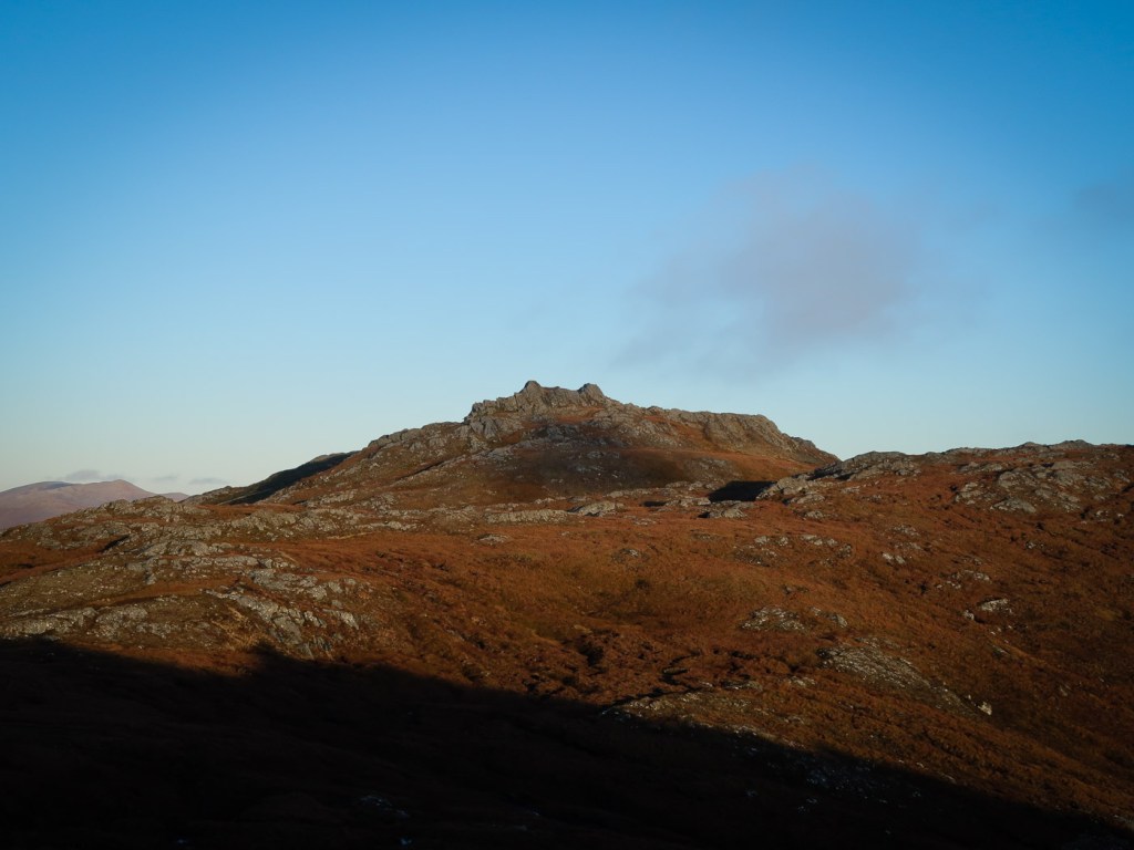 Today we thought the weather would be ok for something slightly higher, in the event the day turned out lovely and we were treated to fantastic views of of the nearby munros. We couldn’t park where we intended as the ground was too sodden so we went back along the road to an alternative start. It was steep and hard going through deep heather and bog. but was worth it! There was two other people walking on the hill but neither went along to the second top. We got back to the van just as the light was fading. The last bit down we found a little path that was most welcome.