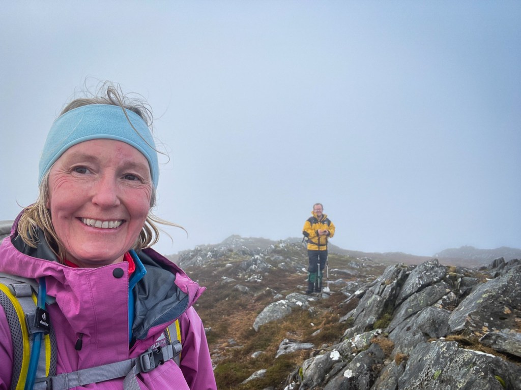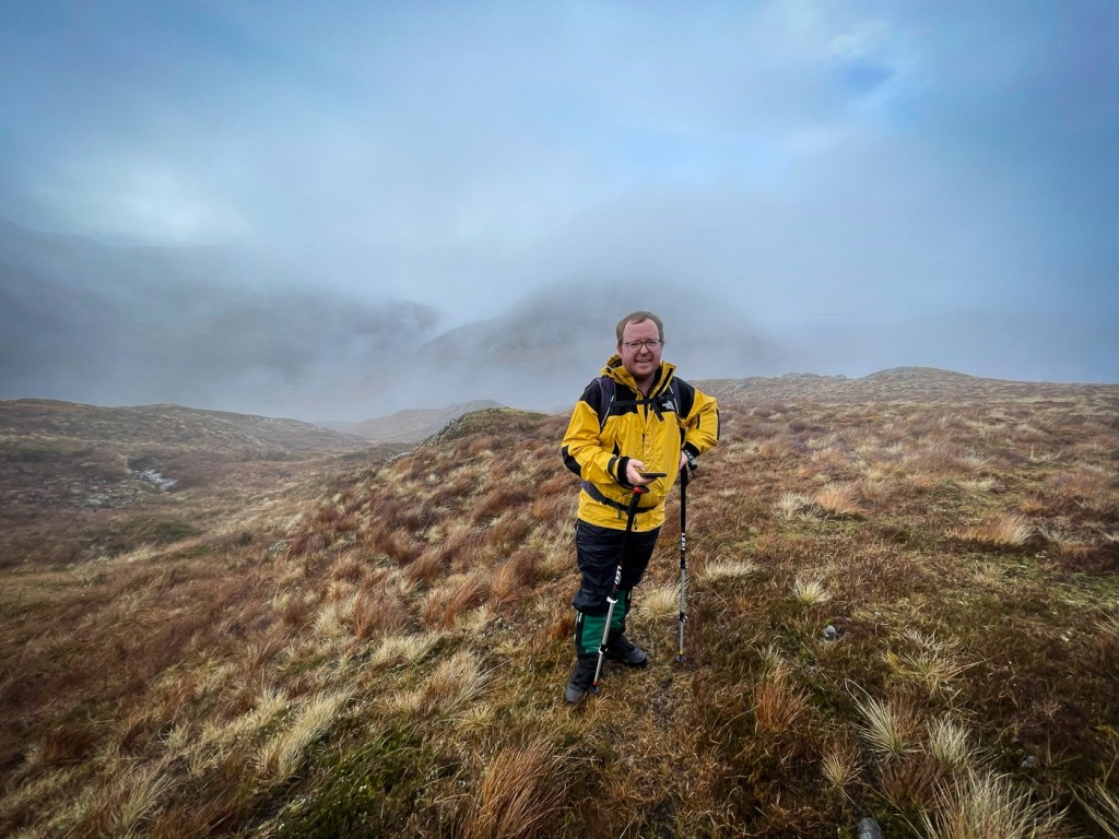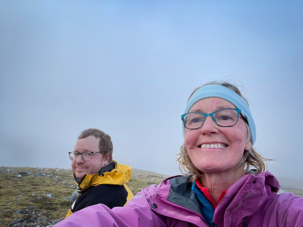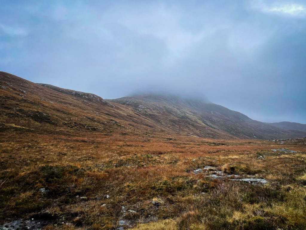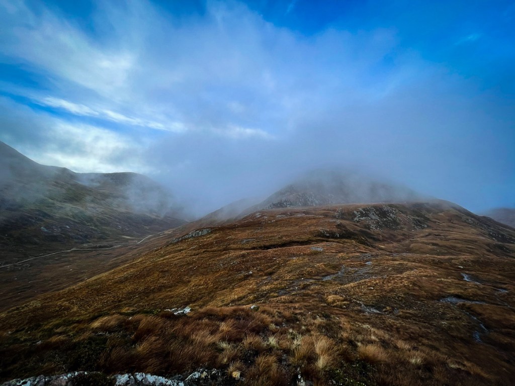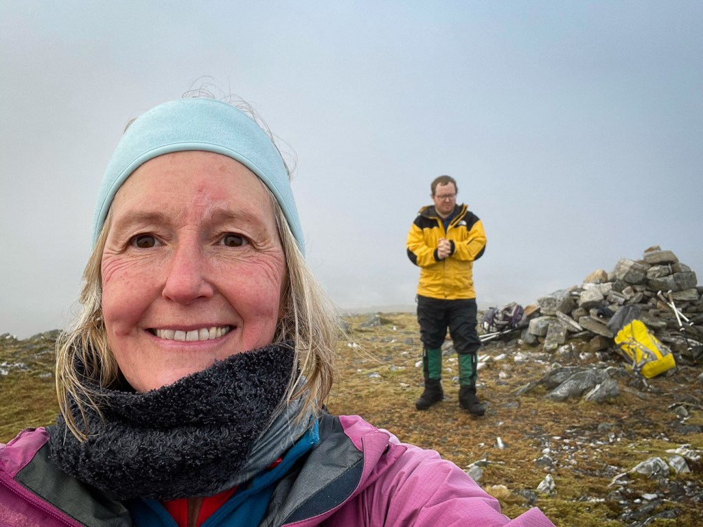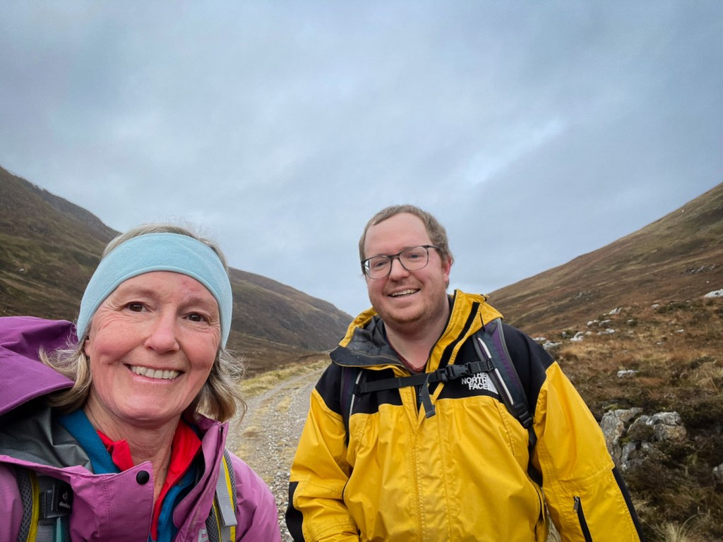The weather looked ok again possibly a bit windy but we decided to stretch ourselves with a bigger walk – not too big…the days were short still but then Joe had his new head torch!! We drove up a long rough track to a parking place, then a long lovely walk up the glen followed on our left were the peaks we intended to climb, on our right were higher munros of the grey corries. The mist never really cleared so we didn’t see them much. Also when we got to the top we would have seen the munros that we all climbed when we had a holiday house in Fersit