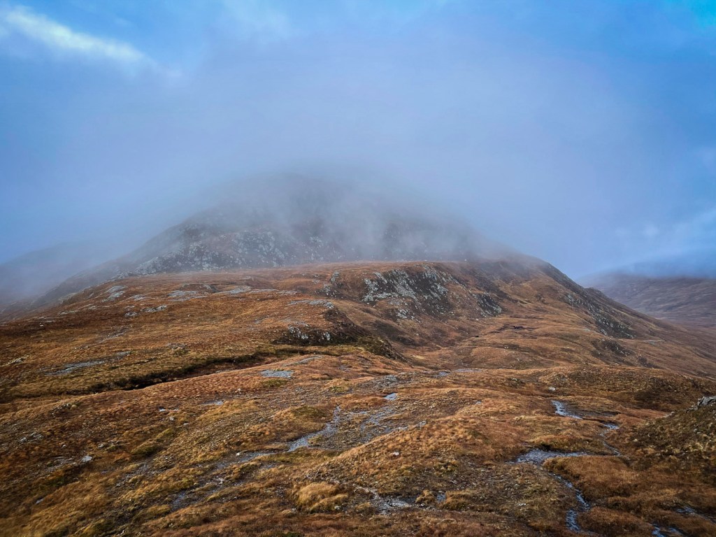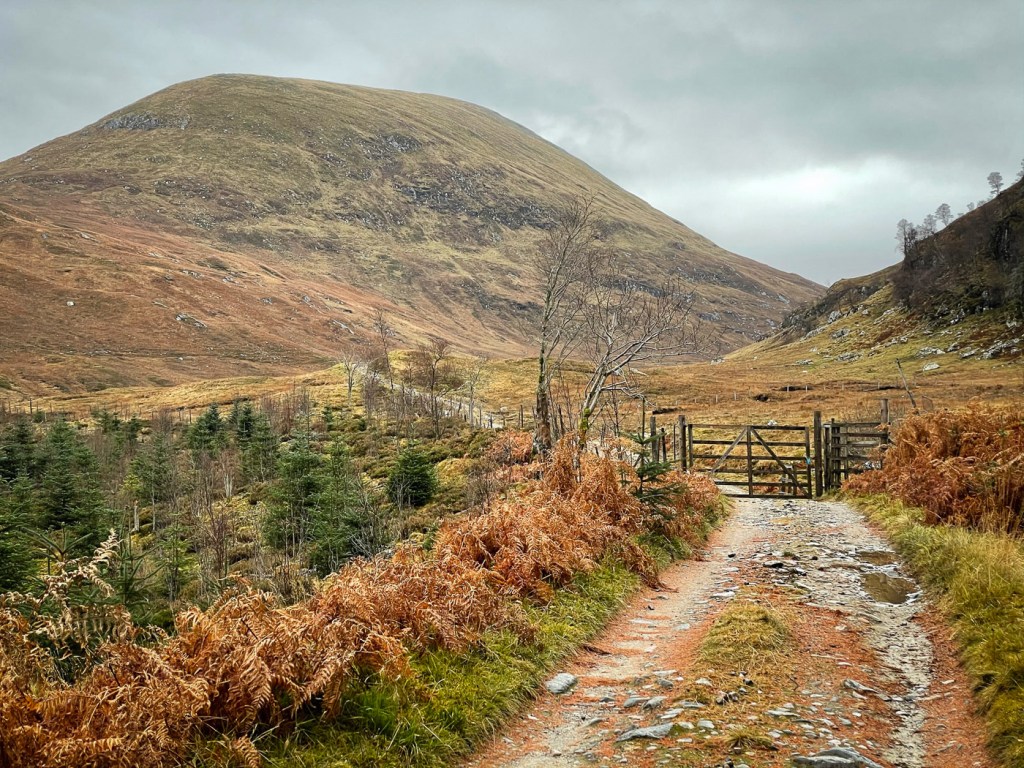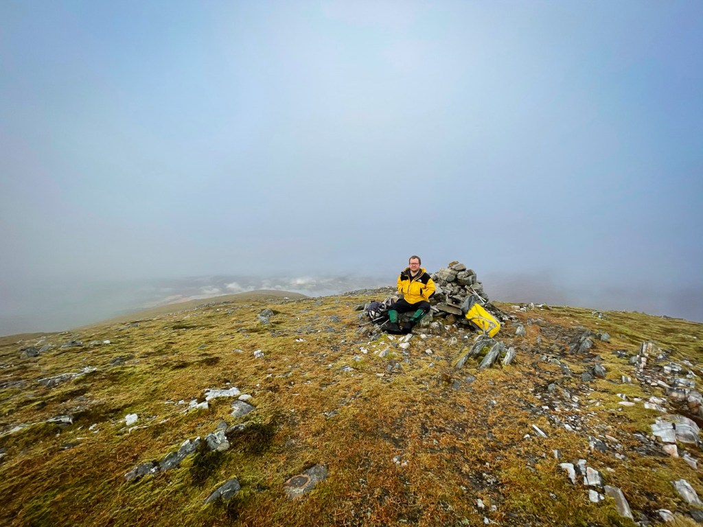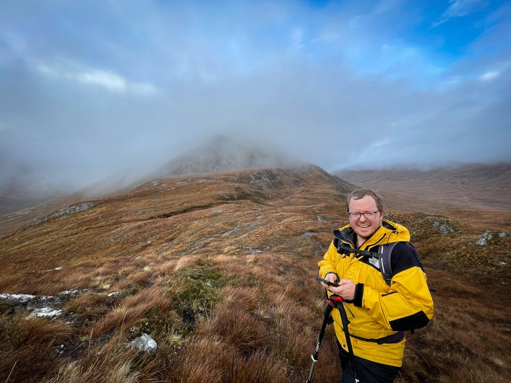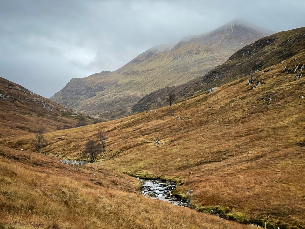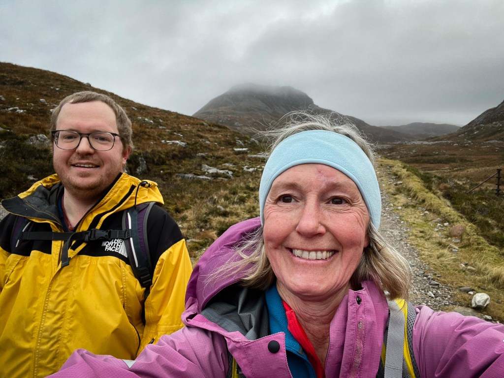 The weather looked ok again possibly a bit windy but we decided to stretch ourselves with a bigger walk – not too big…the days were short still but then Joe had his new head torch!! We drove up a long rough track to a parking place, then a long lovely walk up the glen followed on our left were the peaks we intended to climb, on our right were higher munros of the grey corries. The mist never really cleared so we didn’t see them much. Also when we got to the top we would have seen the munros that we all climbed when we had a holiday house in Fersit