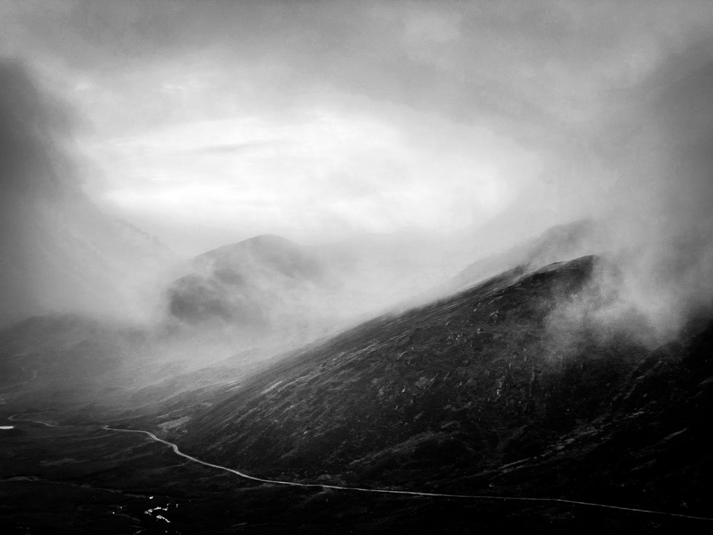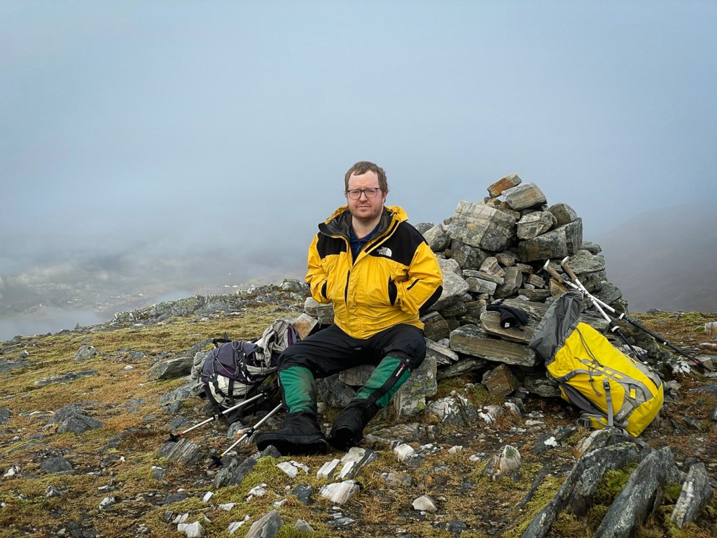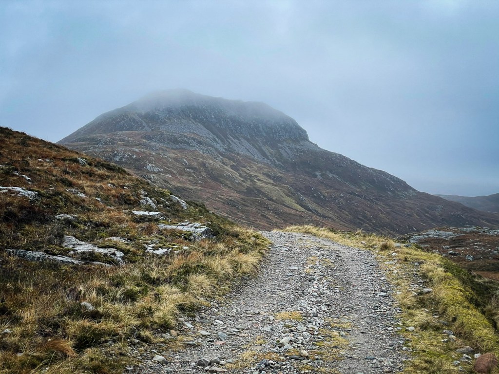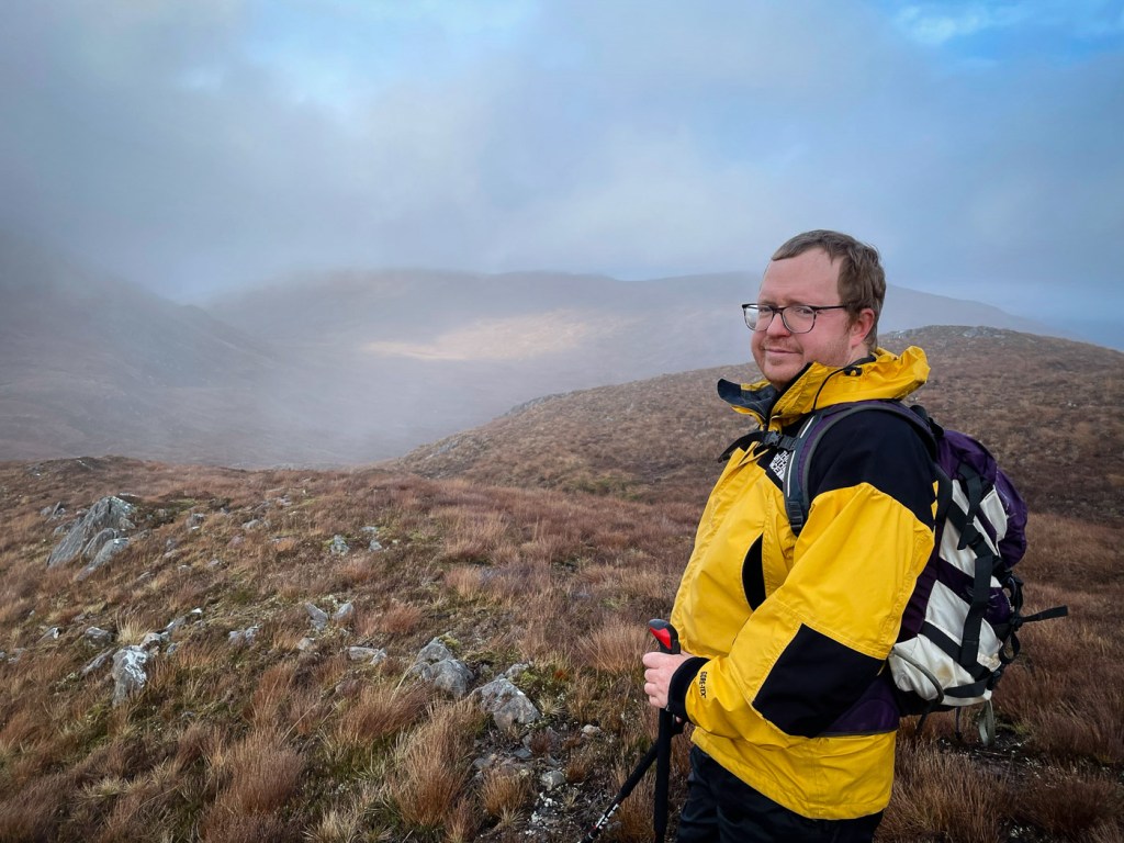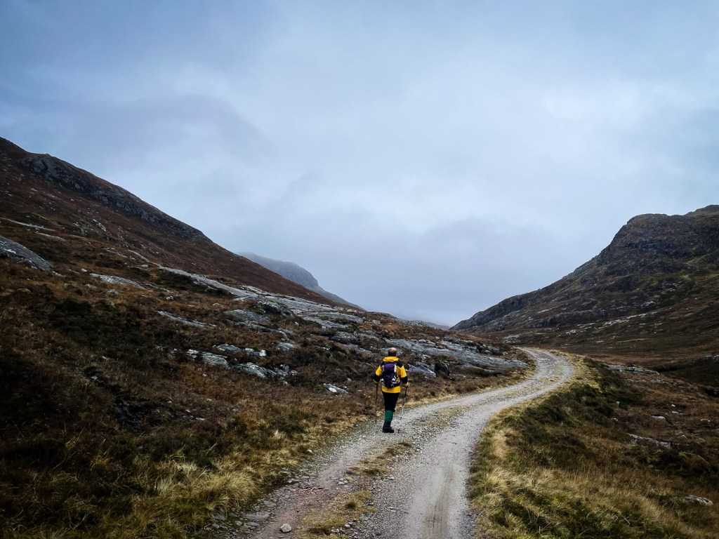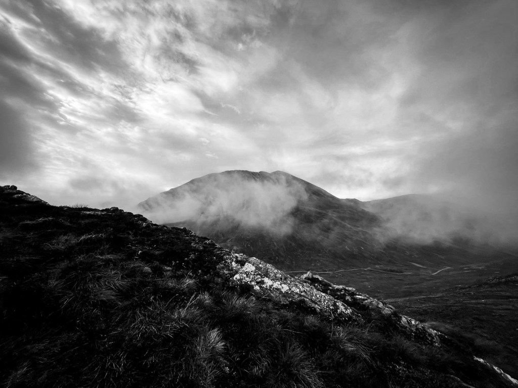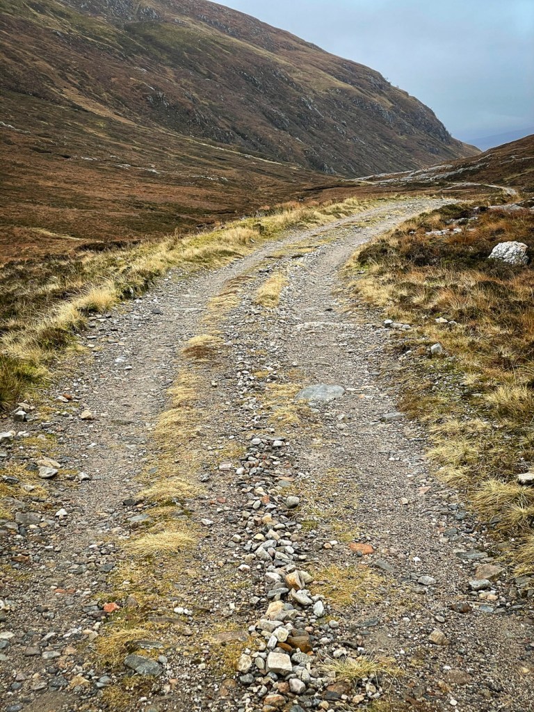 The weather looked ok again possibly a bit windy but we decided to stretch ourselves with a bigger walk – not too big…the days were short still but then Joe had his new head torch!! We drove up a long rough track to a parking place, then a long lovely walk up the glen followed on our left were the peaks we intended to climb, on our right were higher munros of the grey corries. The mist never really cleared so we didn’t see them much. Also when we got to the top we would have seen the munros that we all climbed when we had a holiday house in Fersit