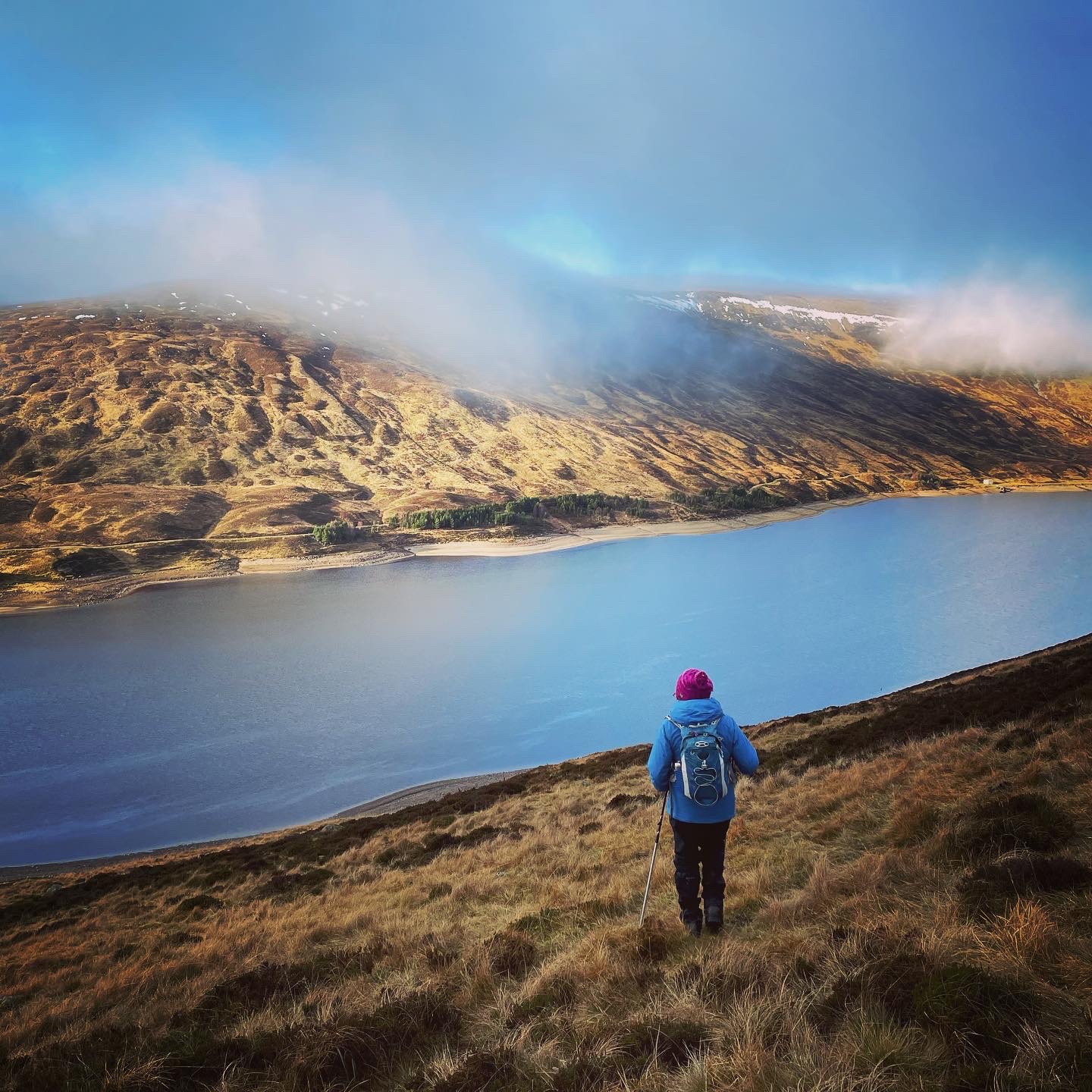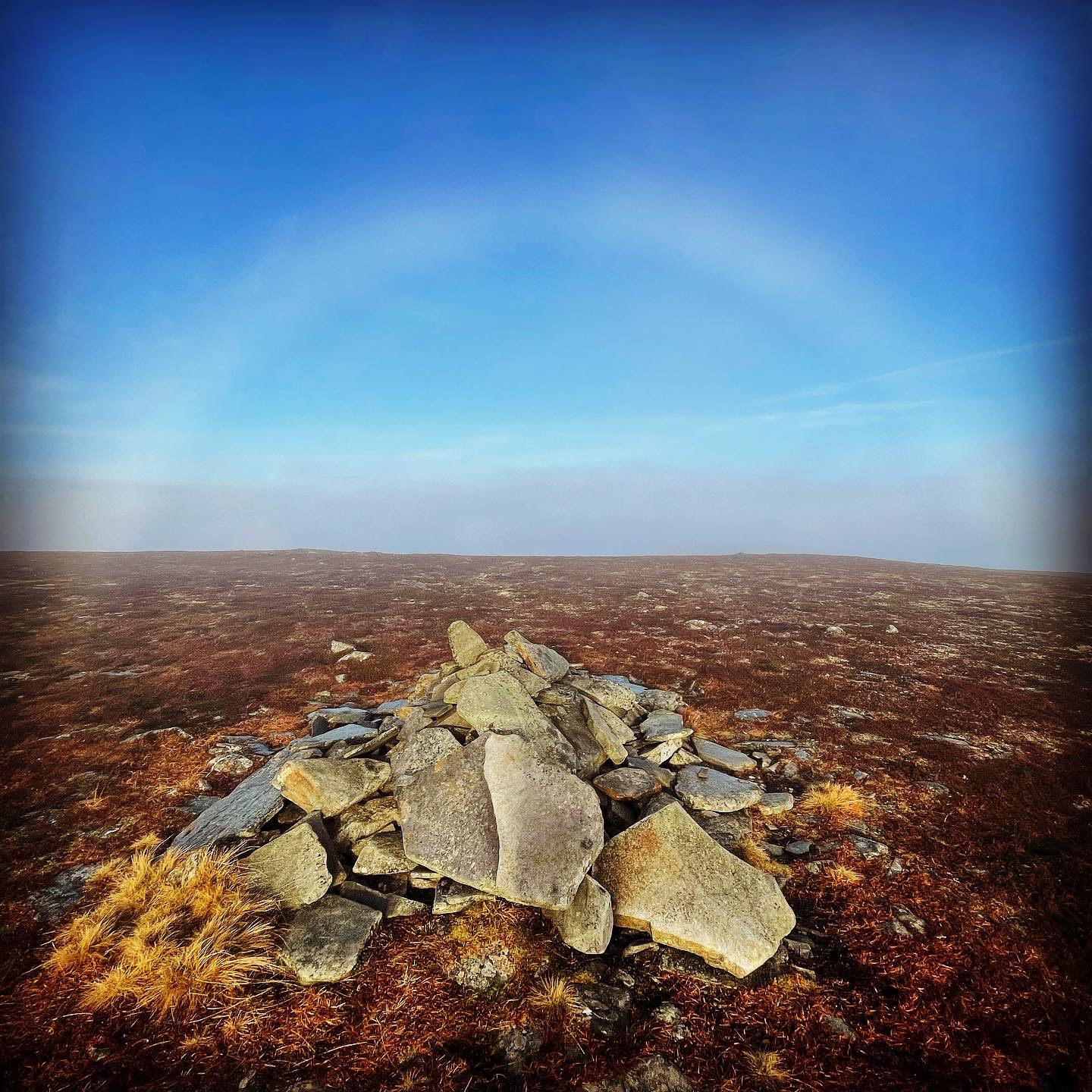 I was only back I from Sue and Chris’s on Wednesday evening but Janet was keen to climb a hill so this one seemed a good choice as it wasn’t too big a drive from home and I had to get the car to the garage before we left. It was a lovely sunny day with no wind. However there was cloud swirling about so by the time we at the summit we were in the flag. We did see an amazing fog bow – a first for me. We decided to carry on along the ridge but then dropped down before the end to the track along the shore and a 4 km walk back to the bridge. It wasn’t so bad! The day was a good one but I should have had my camera with me not just my phone.