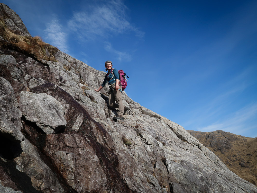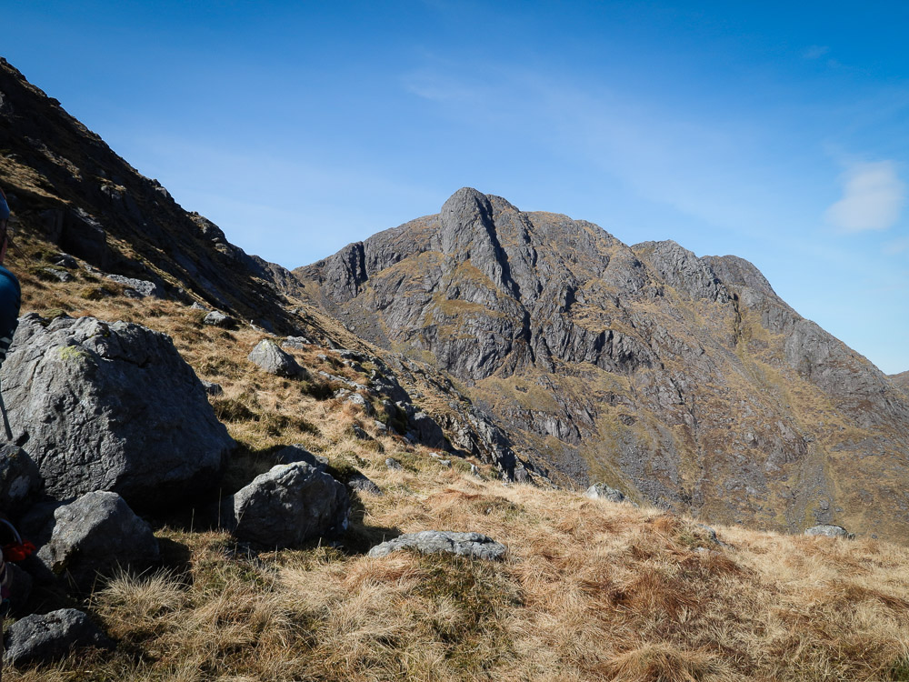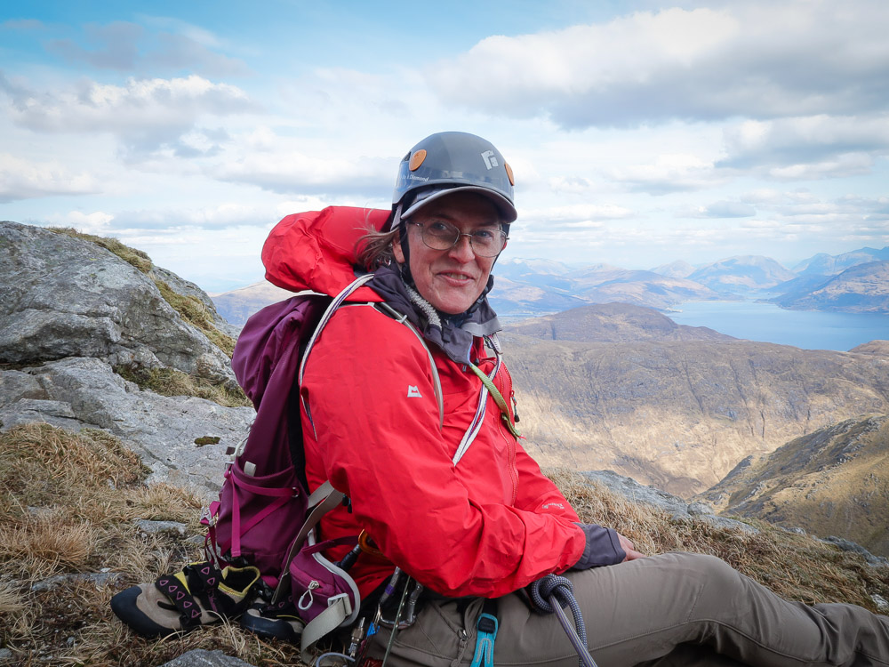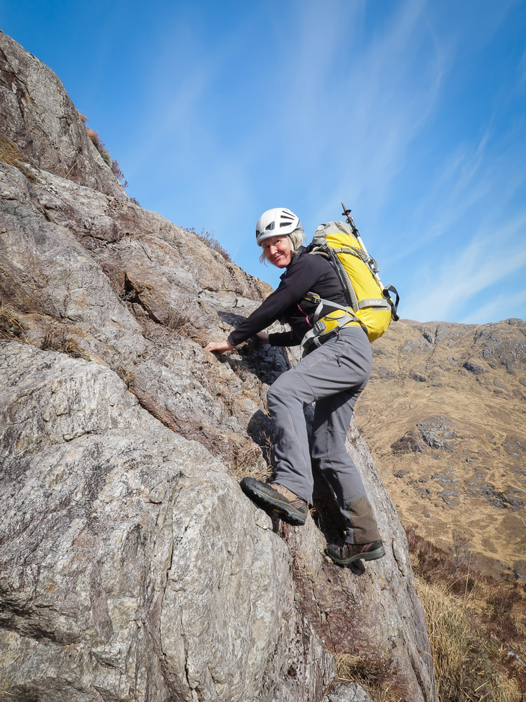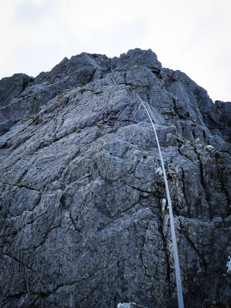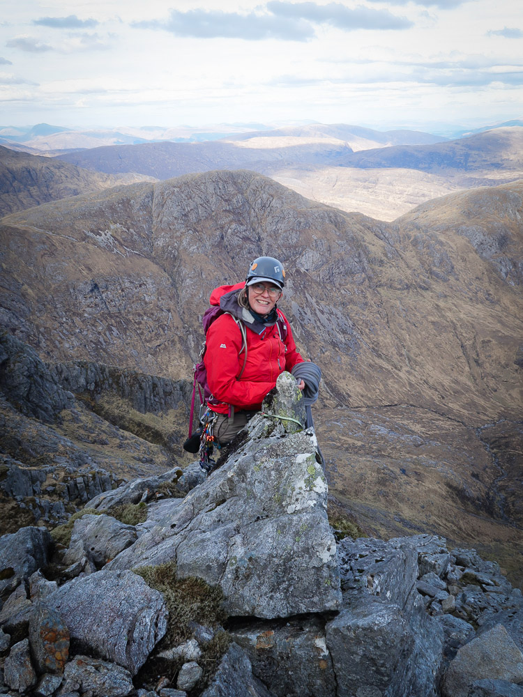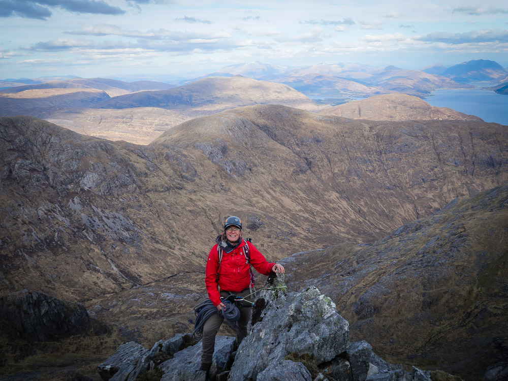 It was a totally stupendous day. the scramble was brilliant, followed by an interesting traverse round to the climb. The start of the climb was scrappy but the ridge was excellent. by the time we got to the ridge it was getting blowy and cold – also a little late so we didn’t hang about. A big boots climb! it was a long walk down……but back to the van before we needed our head torches and back to the hut before the ladies had finished their main courses. I then found out from peak hunter that this was the hill that Joe and Sam climbed in the mist when we were staying in Mallaig with the Americans