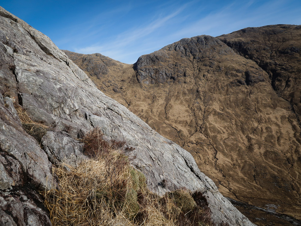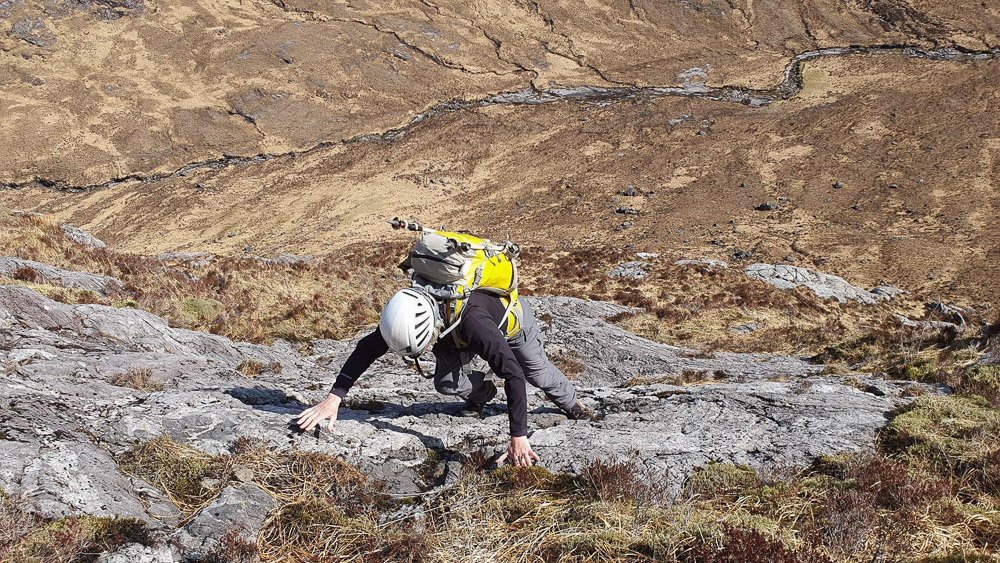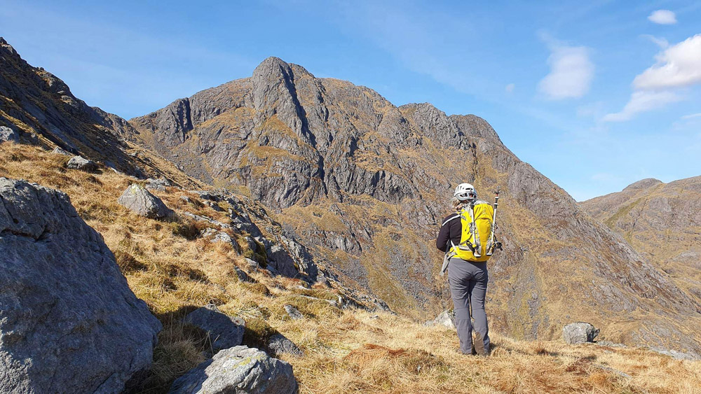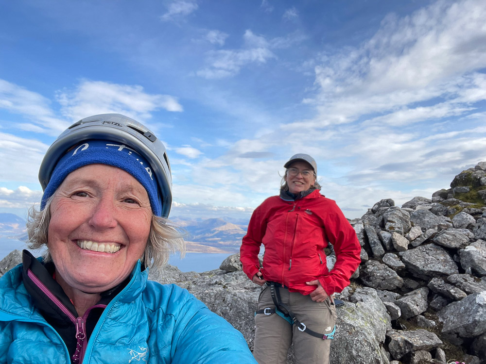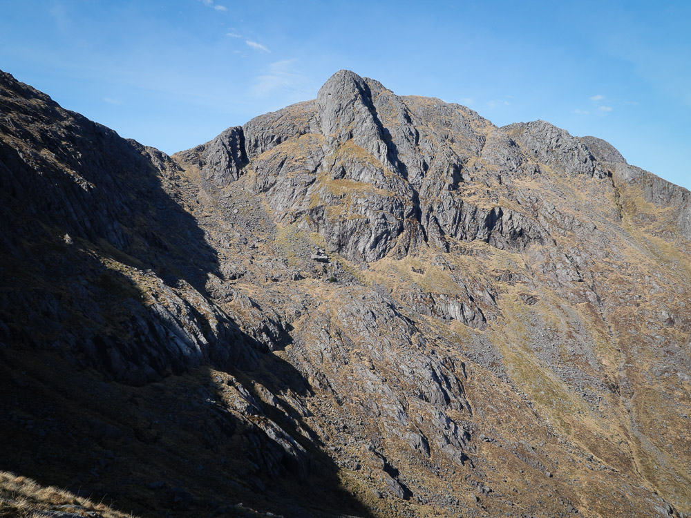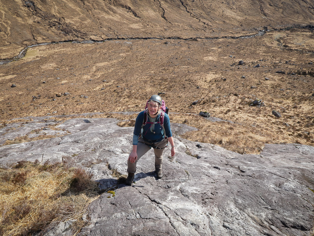 It was a totally stupendous day. the scramble was brilliant, followed by an interesting traverse round to the climb. The start of the climb was scrappy but the ridge was excellent. by the time we got to the ridge it was getting blowy and cold – also a little late so we didn’t hang about. A big boots climb! it was a long walk down……but back to the van before we needed our head torches and back to the hut before the ladies had finished their main courses. I then found out from peak hunter that this was the hill that Joe and Sam climbed in the mist when we were staying in Mallaig with the Americans