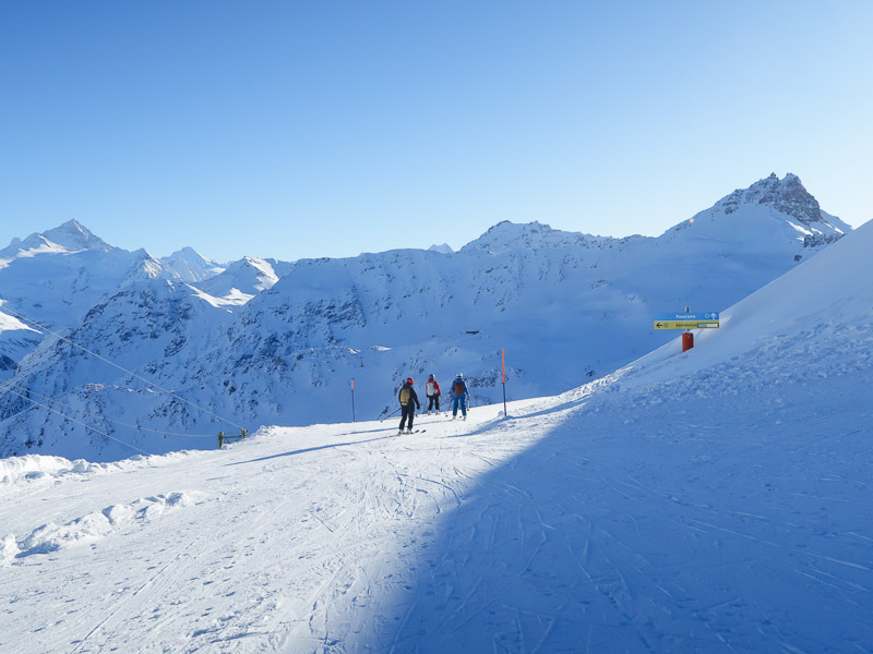 The first day we headed to the nearest lift up to Grimentz. It was a wonderful blue bird day , no wind. I was a little apprehensive about how my new skis and boots would be but they are shaping up to be lovely. We stuck to blues with an odd red to get our ski legs going.