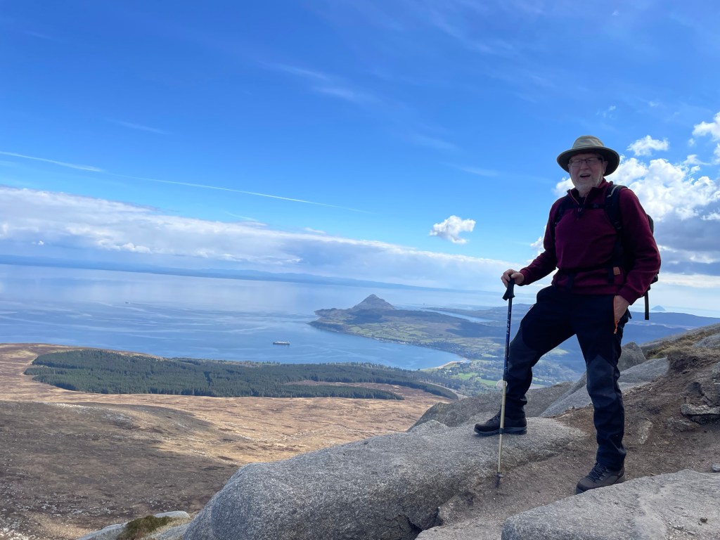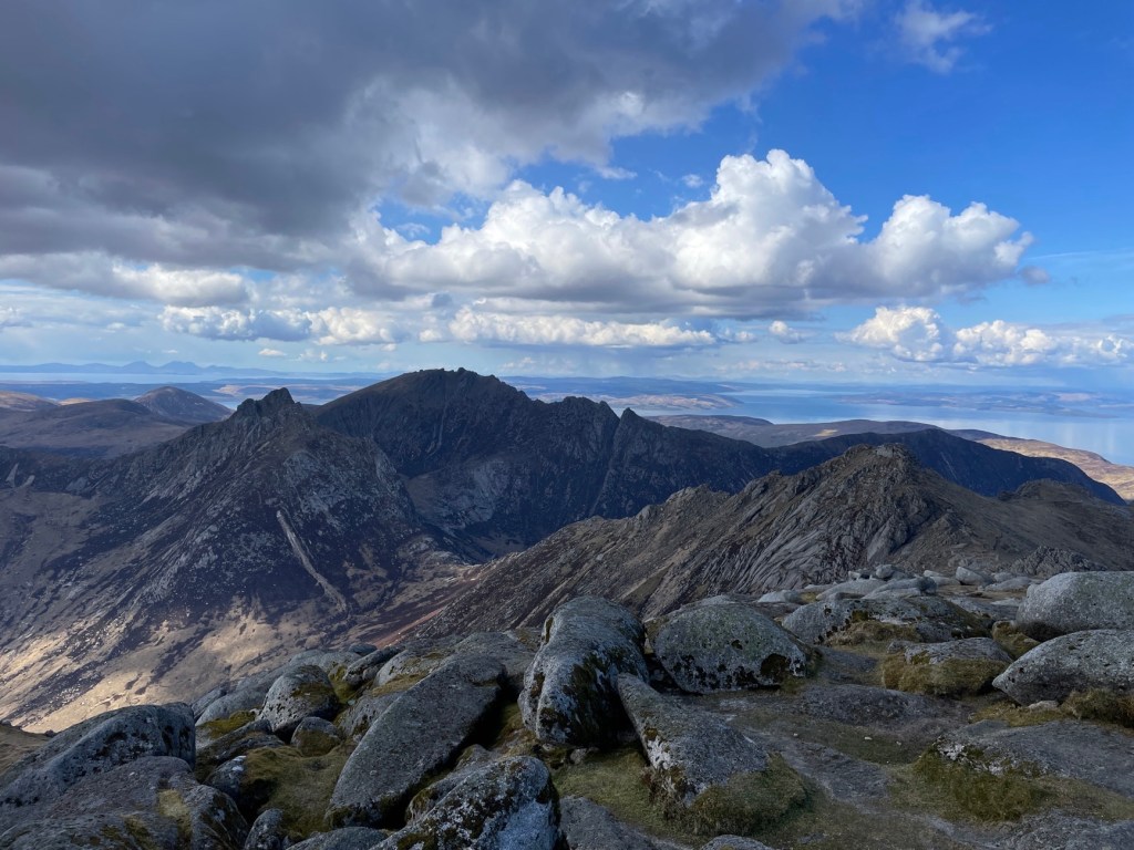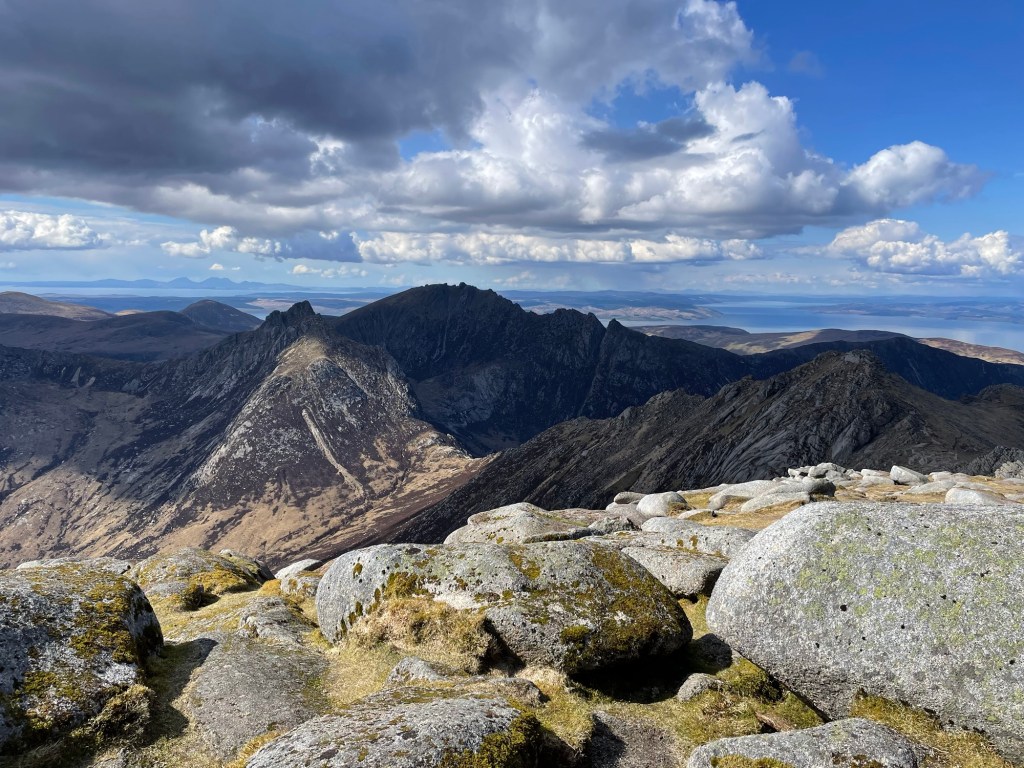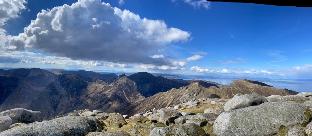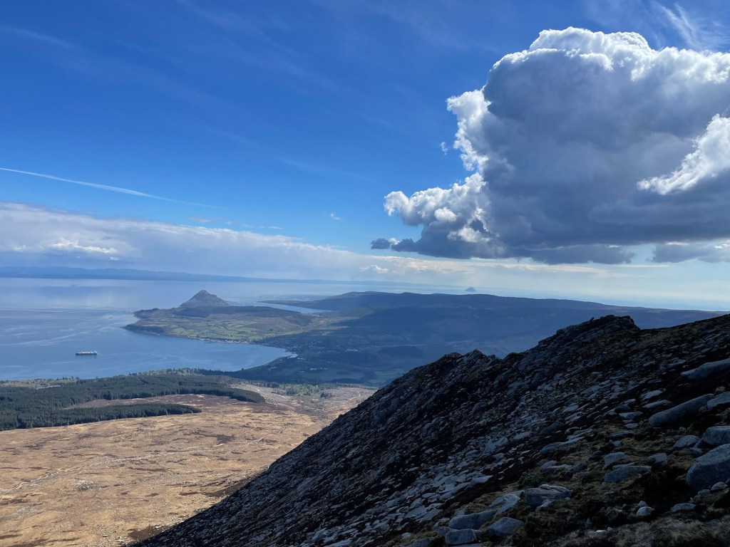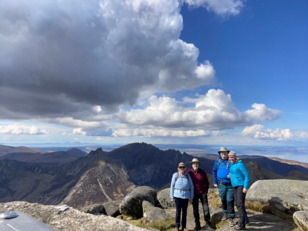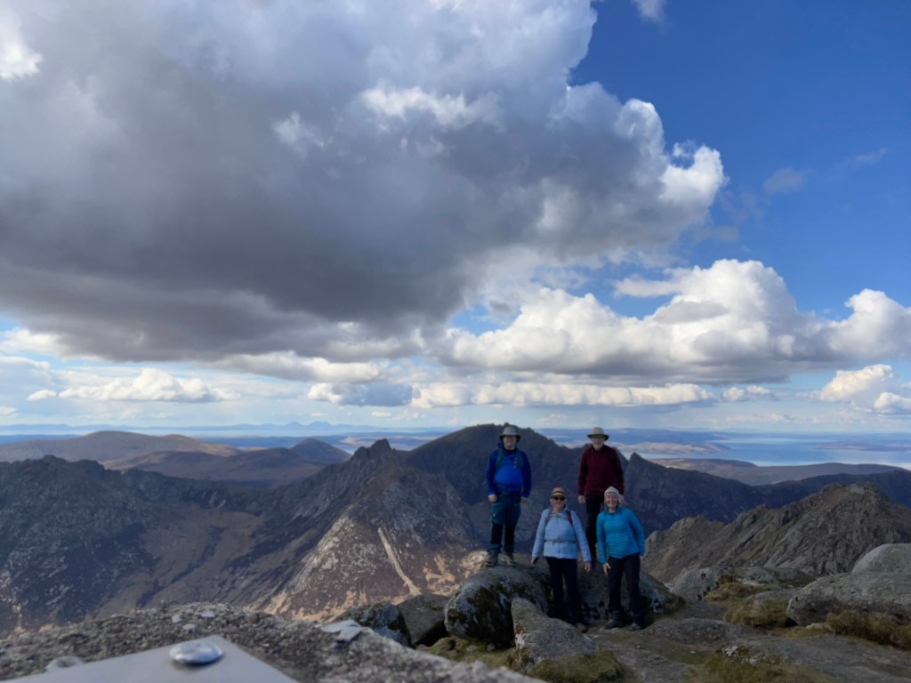 What a day. Joe and I went over to Arran for a couple of days to meet up with Jimmy and Lynne. They were very keen to climb up Goatfell but also a wee bit apprehensive. We set off at about 10am, our route was the direct tourist path up from Broderick. It was a good choice as it still took us 91/2 hours. I couldn’t believe how busy it was but everyone was going quicker than us so after a while they started passing us coming down rather than going up! At the top we had the summit to ourselves which was wonderful. We got down and got sucked into the mountain rescue 60th anniversary by a lot of quite tipsy rescuers.