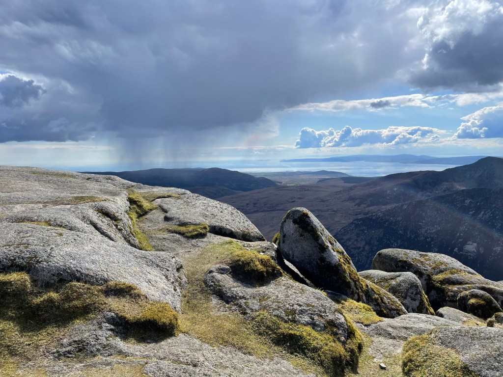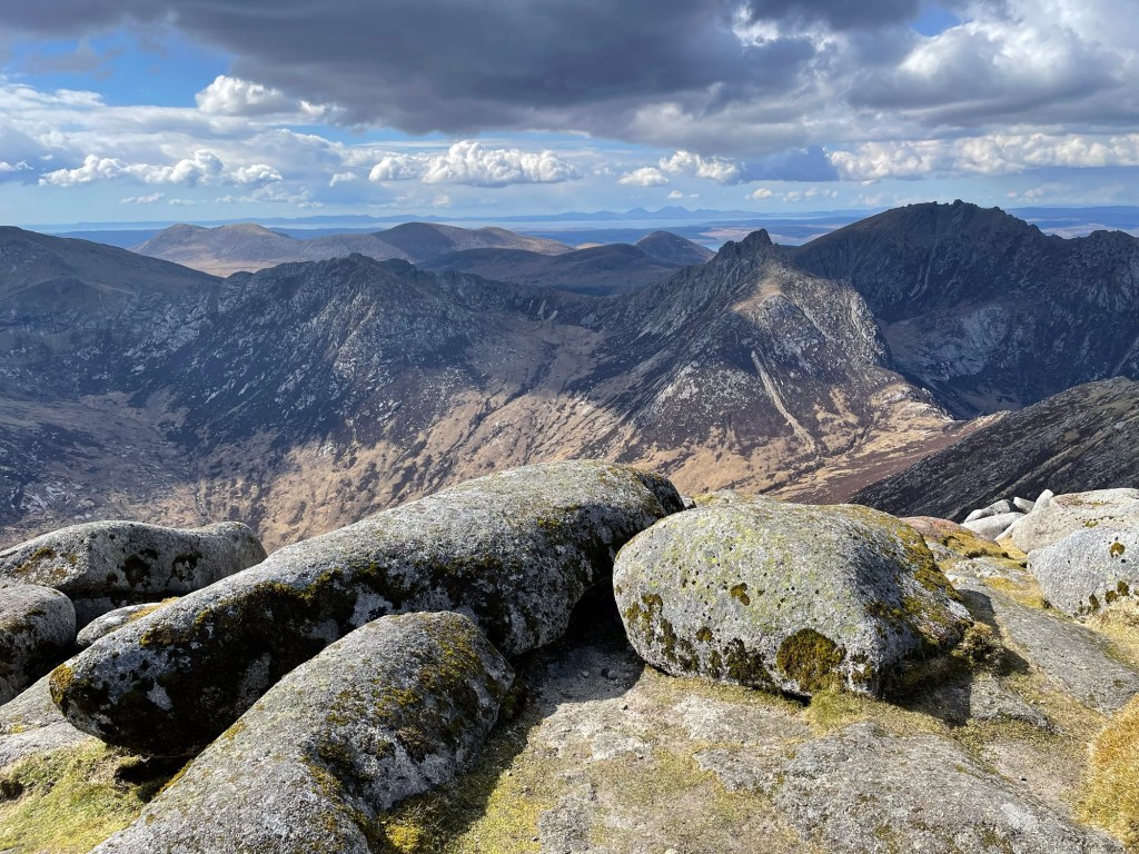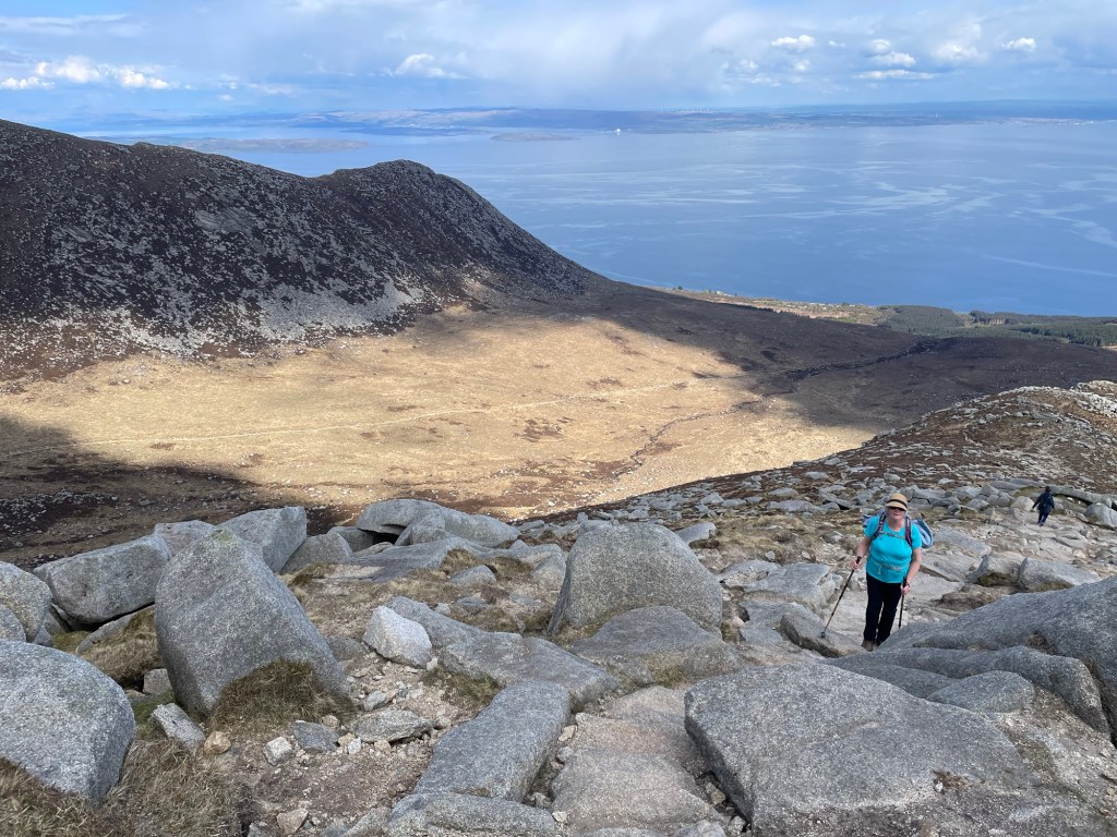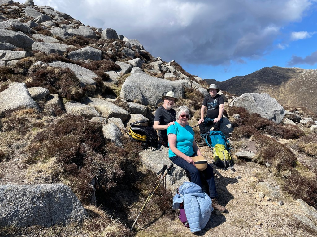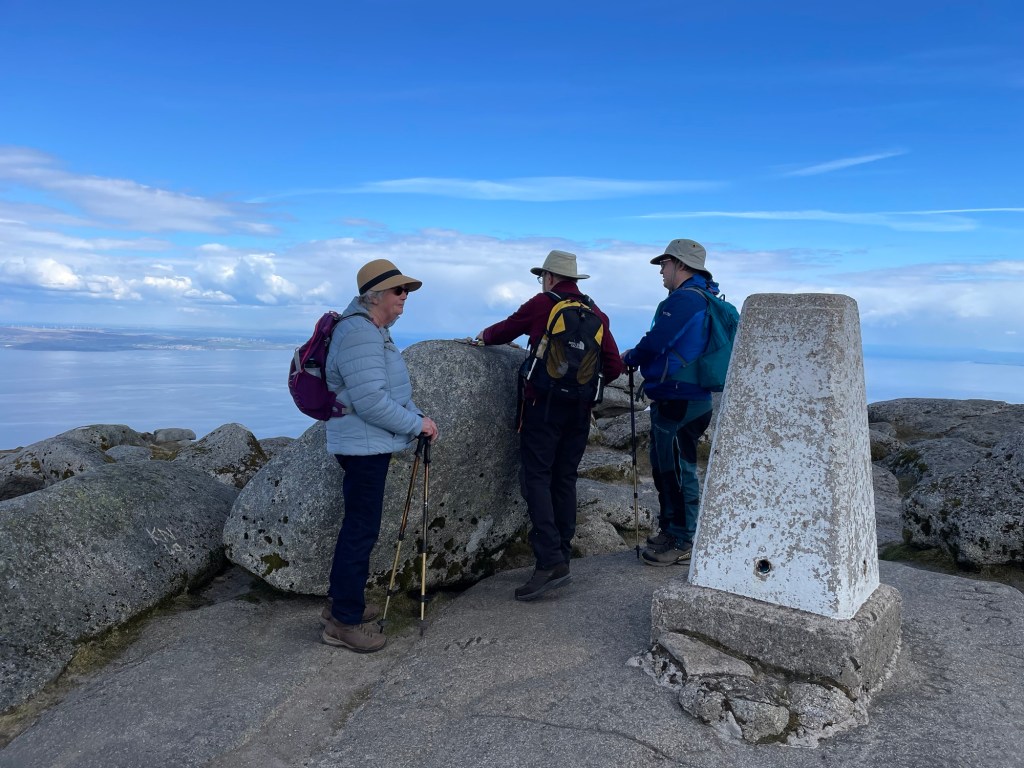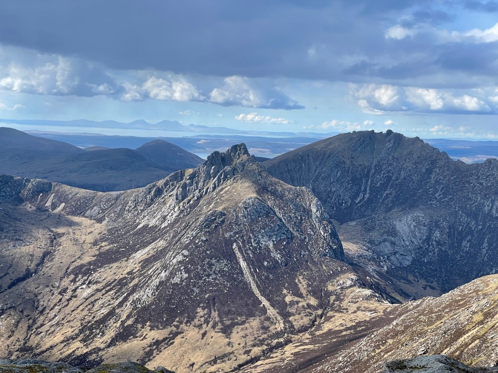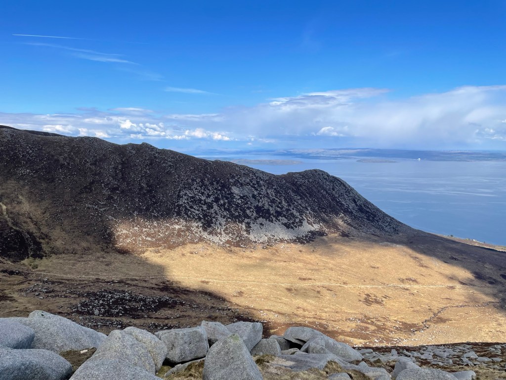 What a day. Joe and I went over to Arran for a couple of days to meet up with Jimmy and Lynne. They were very keen to climb up Goatfell but also a wee bit apprehensive. We set off at about 10am, our route was the direct tourist path up from Broderick. It was a good choice as it still took us 91/2 hours. I couldn’t believe how busy it was but everyone was going quicker than us so after a while they started passing us coming down rather than going up! At the top we had the summit to ourselves which was wonderful. We got down and got sucked into the mountain rescue 60th anniversary by a lot of quite tipsy rescuers.