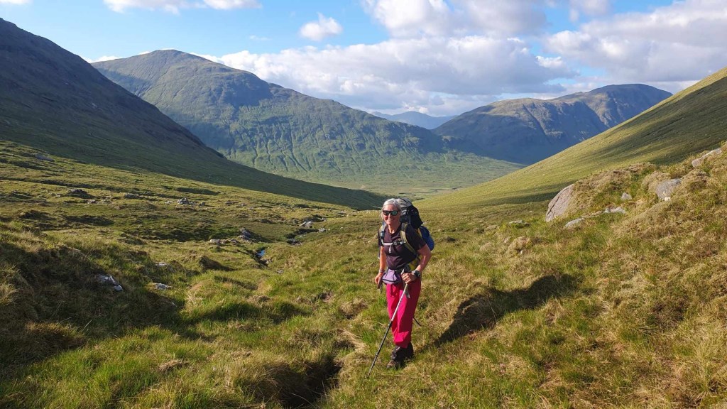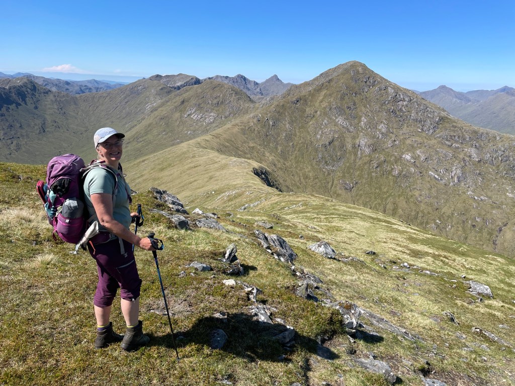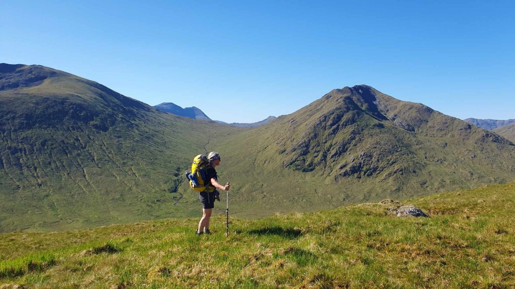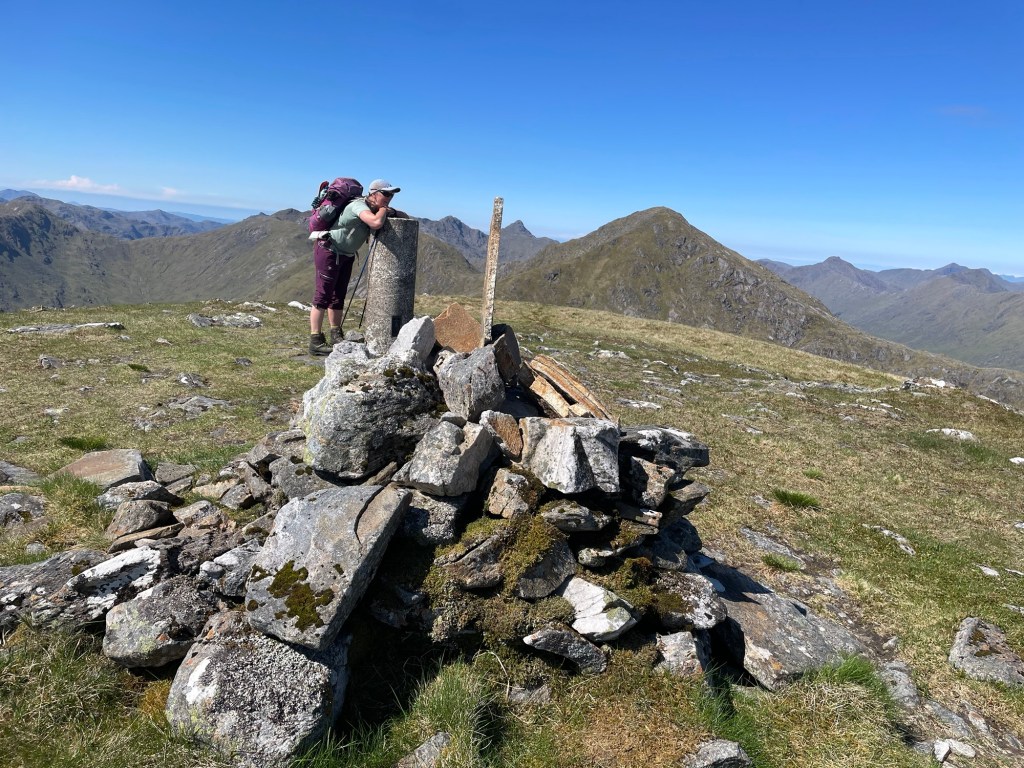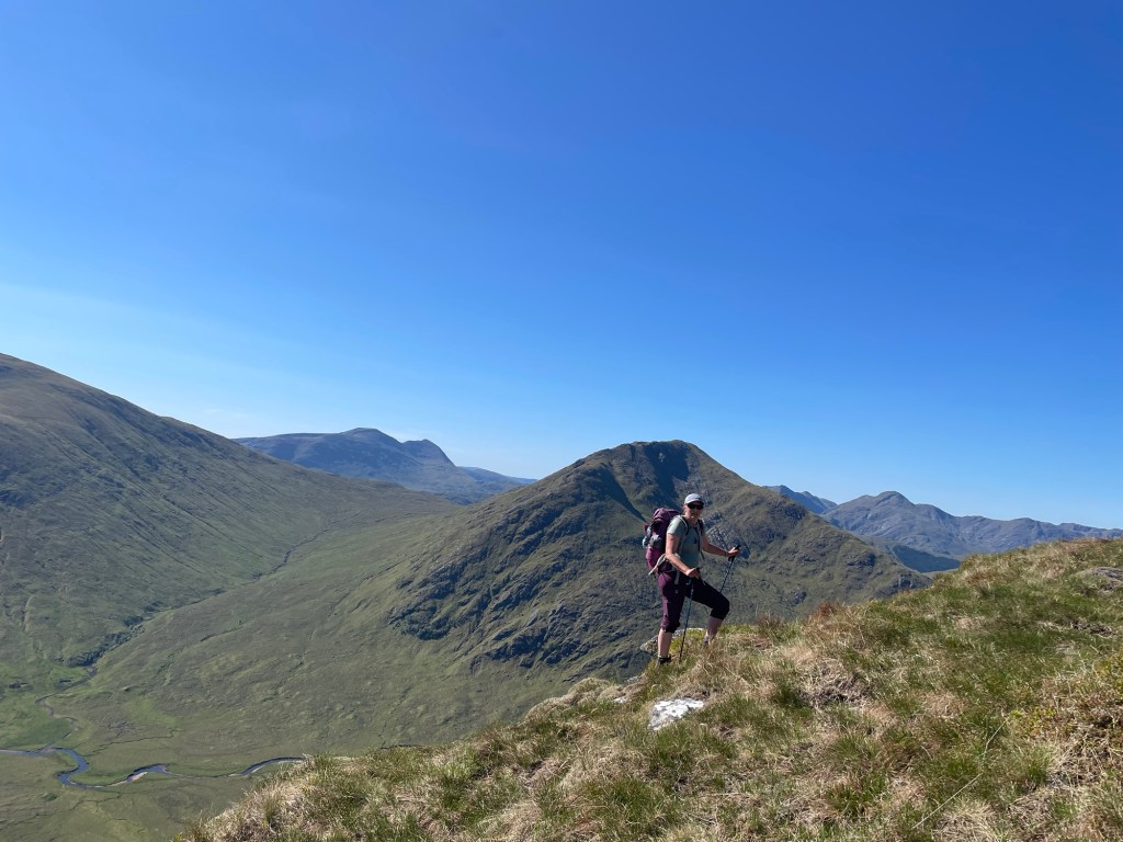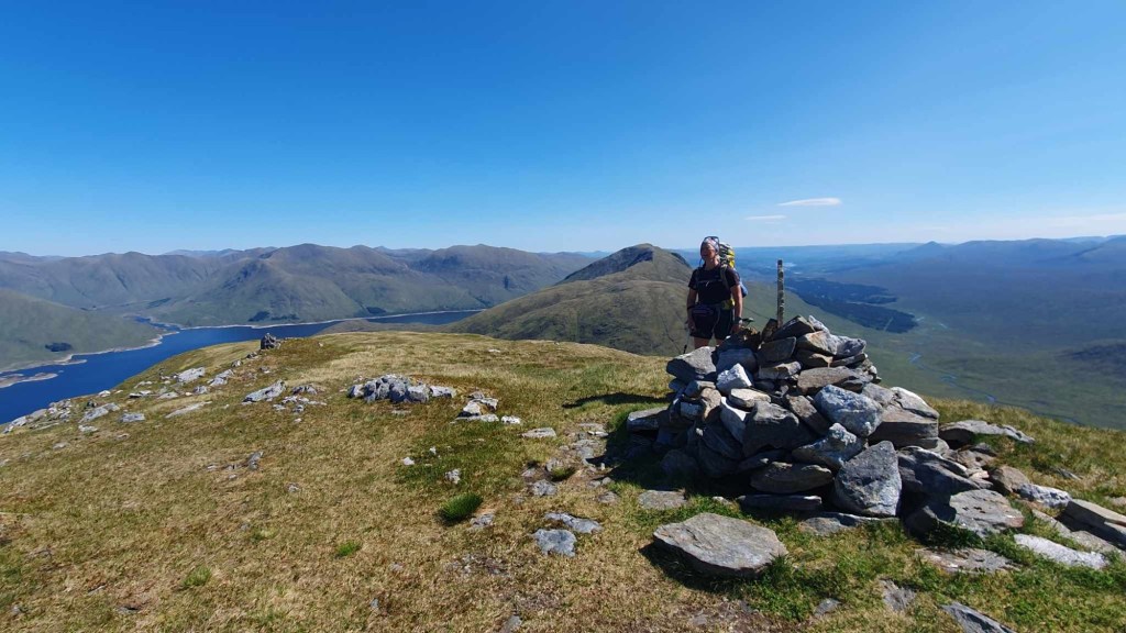 This trip had been planned for a while. The Munro is one of my ‘bottom five’ and so the first bottom five I have been up. After a very nice ladies meet at the Glenfinnan sleeping car, Anne Marie and I spent a night in an idyllic park up by the river. Of course I had to have a dip. After a slow start we drove round to end of loch Argaig and set off at about 4.30 for kinbreak bothy. A fairly hard walk in after the efforts of the last few days but we made it! And there we no one else there. I pleasantly night in the bothy and we woke to an amazing day. Mist in the valley and then a blue bird day. Not too hot as a nice breeze which also kept the midges away. We walked up over the Corbett and then left our sacs in the bealach while we went up Sgurr Mor. Fantastic views. The decent from the Col was very steep and grassy. Then a trudge up to the pass and back down to the track….that was hard work……then a bit of a track walk back to the vans. G&T and food and sleep. A most excellent day. We even got back before it rained