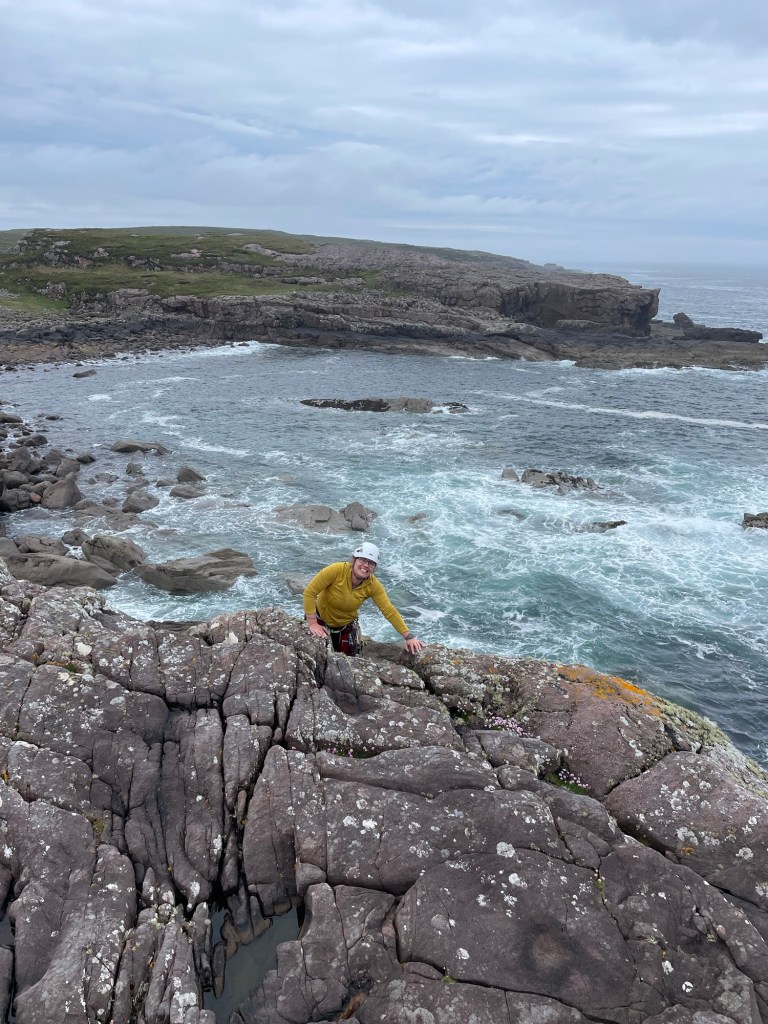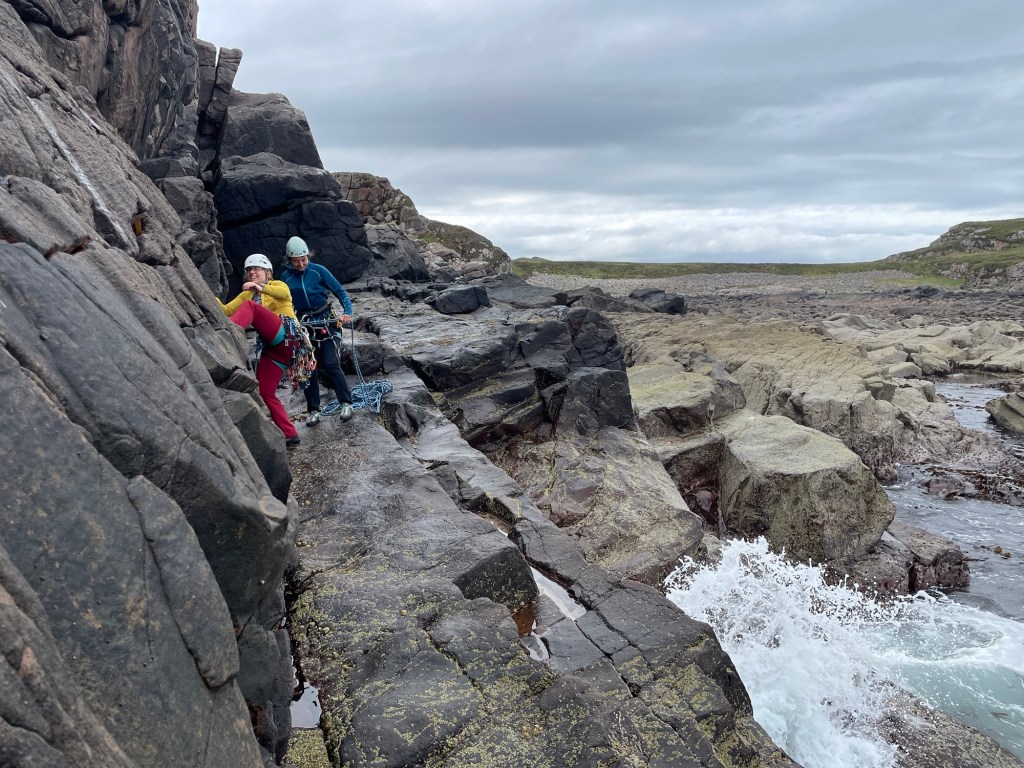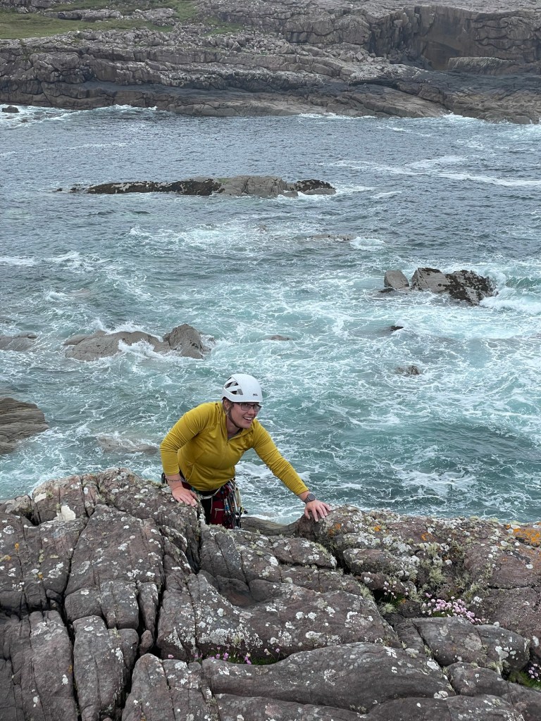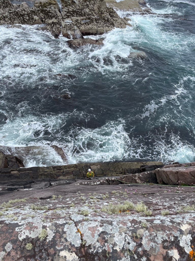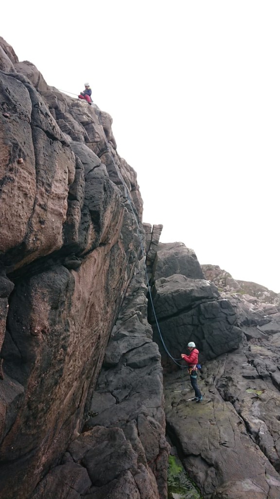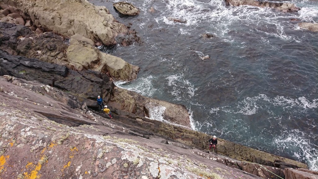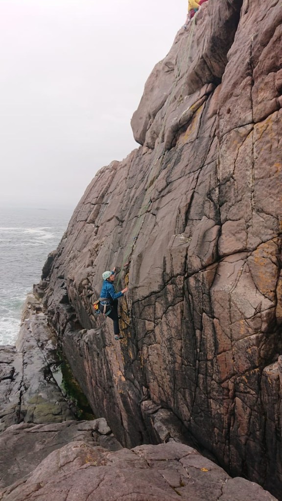 Jeannie set up an abseil, the tide was lucking 1 1/2 hours off low tide so we were able to get to the shelf at the bottom of the climbs. It took a little figuring out but in the end we were happy with our figuring. Jeannie and I started with a Diff each to get used to the rock. I then felt like giving my self a little push and decided to lead a HS 4b which I did and very much enjoyed.
