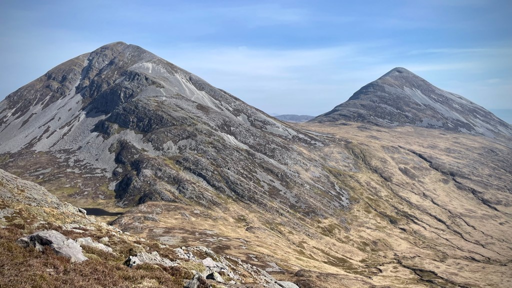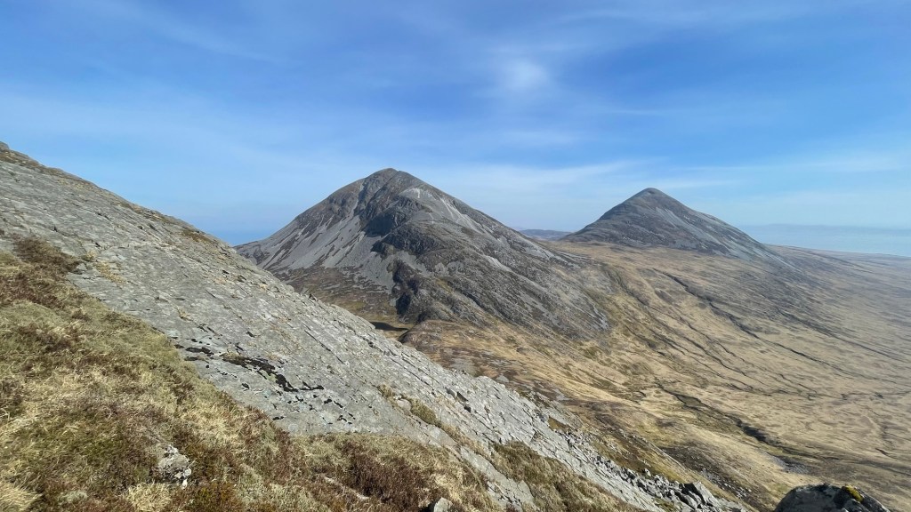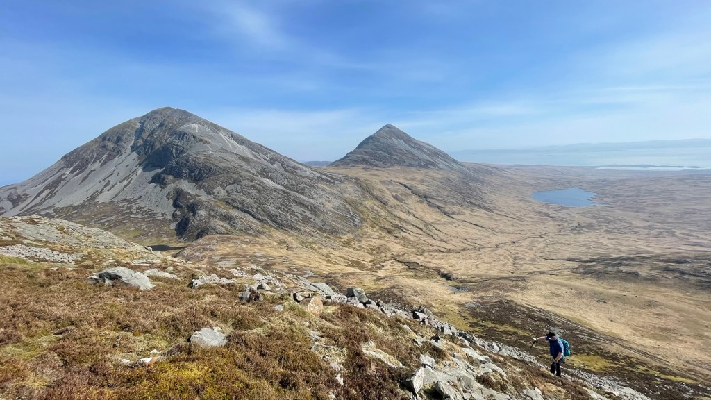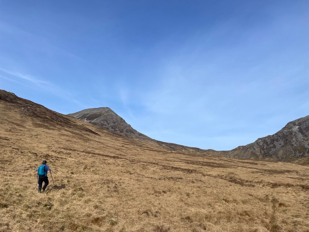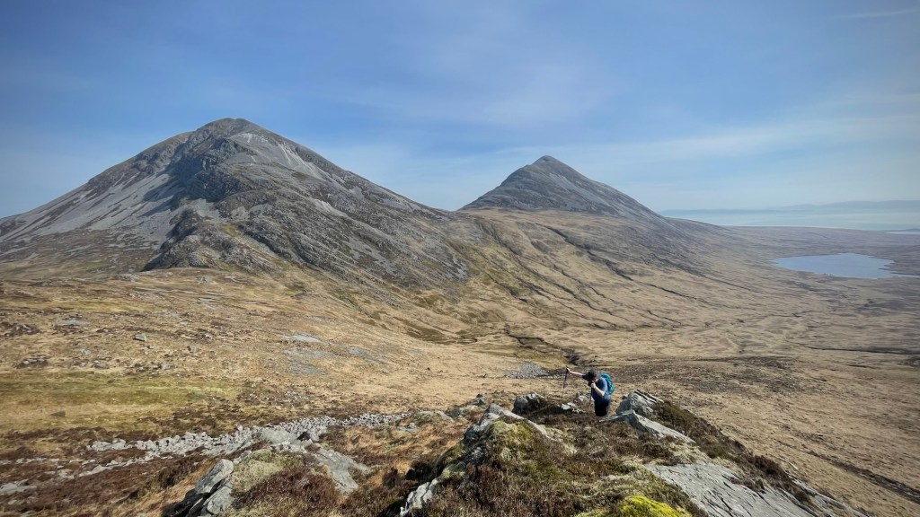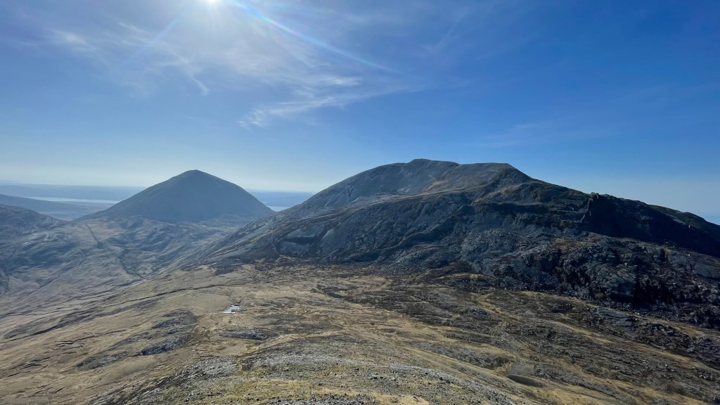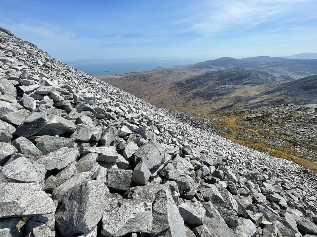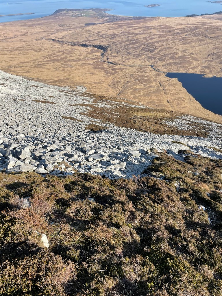 This was to be the last day before the weather broke, I have been wanting to come back to Jura to go up these hills for over 25 years. They did not disappoint. We set off early and what could have been a very boggy approach wasn’t too bad due to the dry weather we have had for the last two weeks. We decided to go this way round incase we felt able to take in the sub2000 hill at the end….fools that we were! Actually we chose a good route up the first pap which involved very little scree. It was steep though which upset joes knee. He soldiered on to the top. Well done Joe. The descent involved some steep scree. Little did know much worse was to come! Once back at the Coll. Joe decided to head down but was happy for me to continue, he knew how much I wanted to go up these hills. We followed each other on strava beacon, sadly I said goodbye bye to Joe and continued solo.