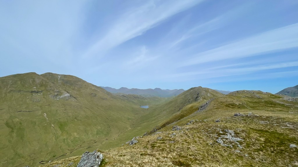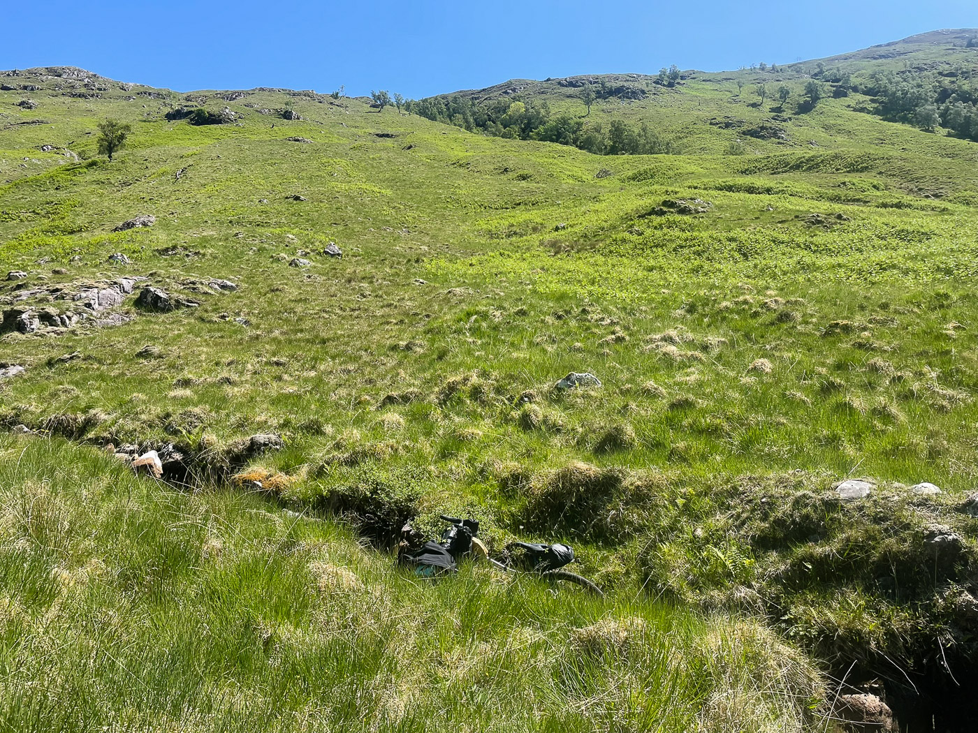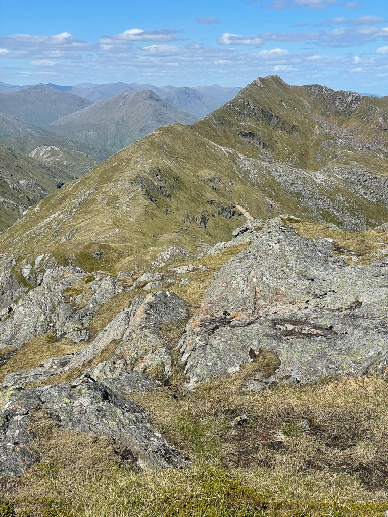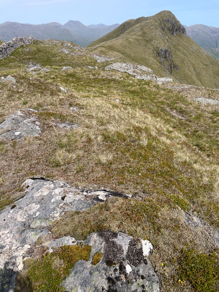 It was a bit of a wound licking week after my bike packing trip got unexpectedly cancelled. I spent a couple of days with kenny in Mallaig and then thought that I should pull myself together and do something. I had all the bike packing gear with me so decided on a wee trip up gleann Dubh lighe. there was a bothy if it got midgey and two fine hills either side of the glen. I set off not too early but with enough time to go up streap first and then make camp. Streap was a wonderful ridge and a bit day. When i got back to the bike I had no energy left to get back to the bothy luckily there was a breeze and so no midge. I put up the tent ate and slept. I wasn’t sure if I would have another hill in me!!