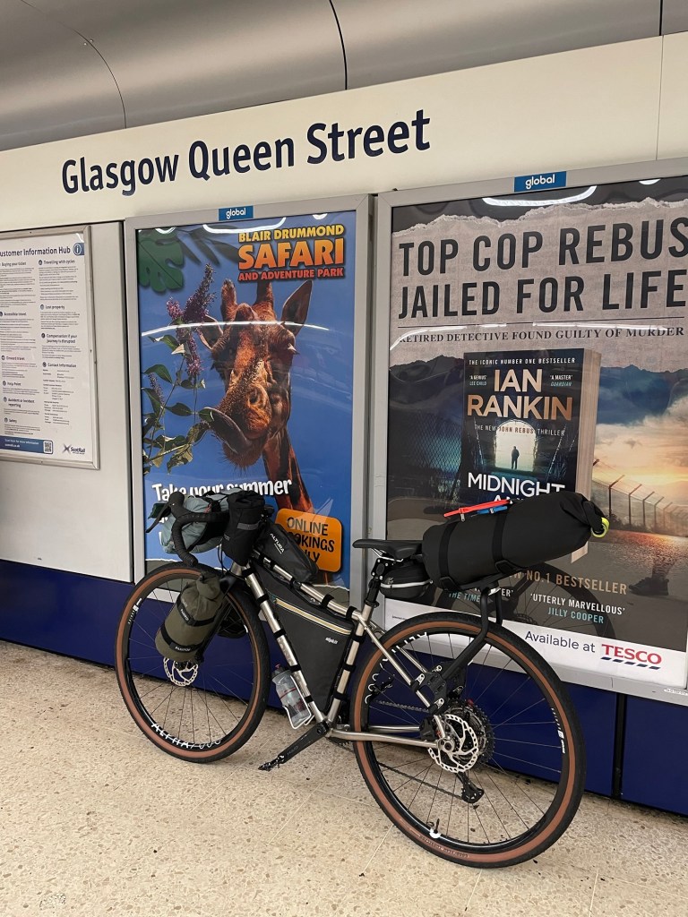 It started so well. Janet came to mine. We got to the station on time. The train arrived on time but the door to the bike carriage was not working. The guard wouldn’t let us on. So we went into the ticket office and the man there was perplexed. We managed to get on the next train and a change later we were at Glasgow minus Janet’s bag with her tent poles in it. The bag was found at Edinburgh and we continued to Balloch. We were a couple of hours behind schedule but hey ho. Six hours later and some great roads tracks and some interesting single tracks we were at the hostel in Callander. We had fish and chips in Aberfoyle. So at least we had had our tea. The hostel was really nice