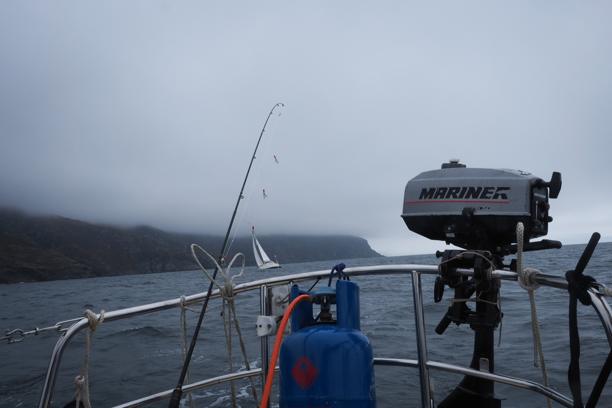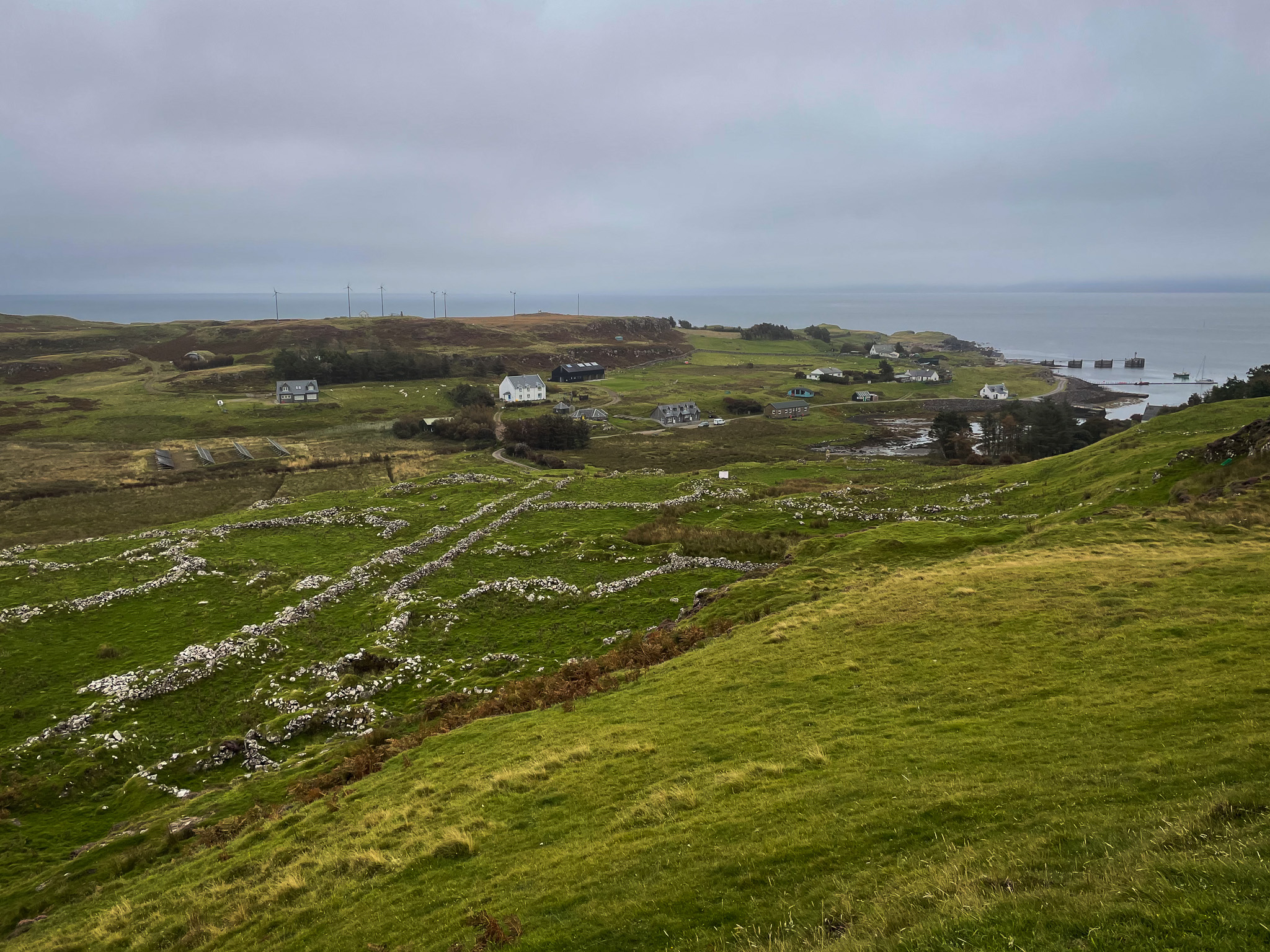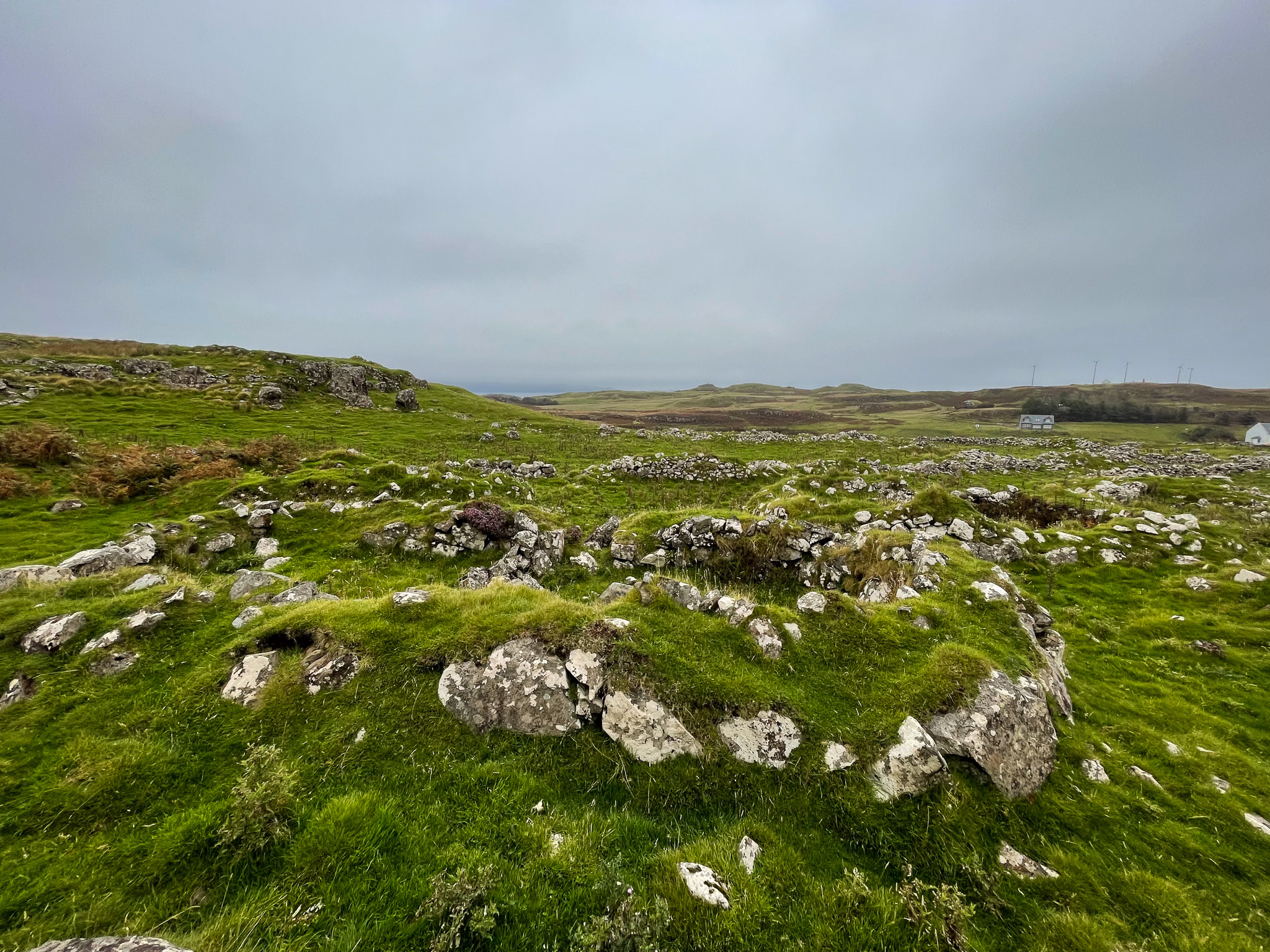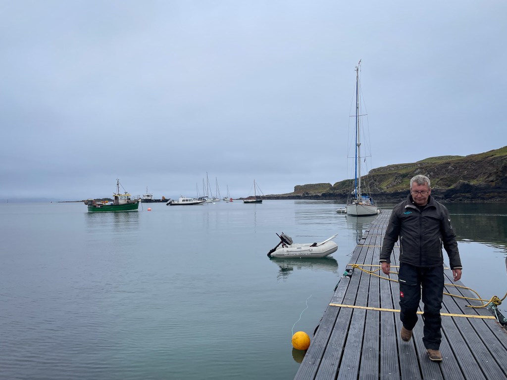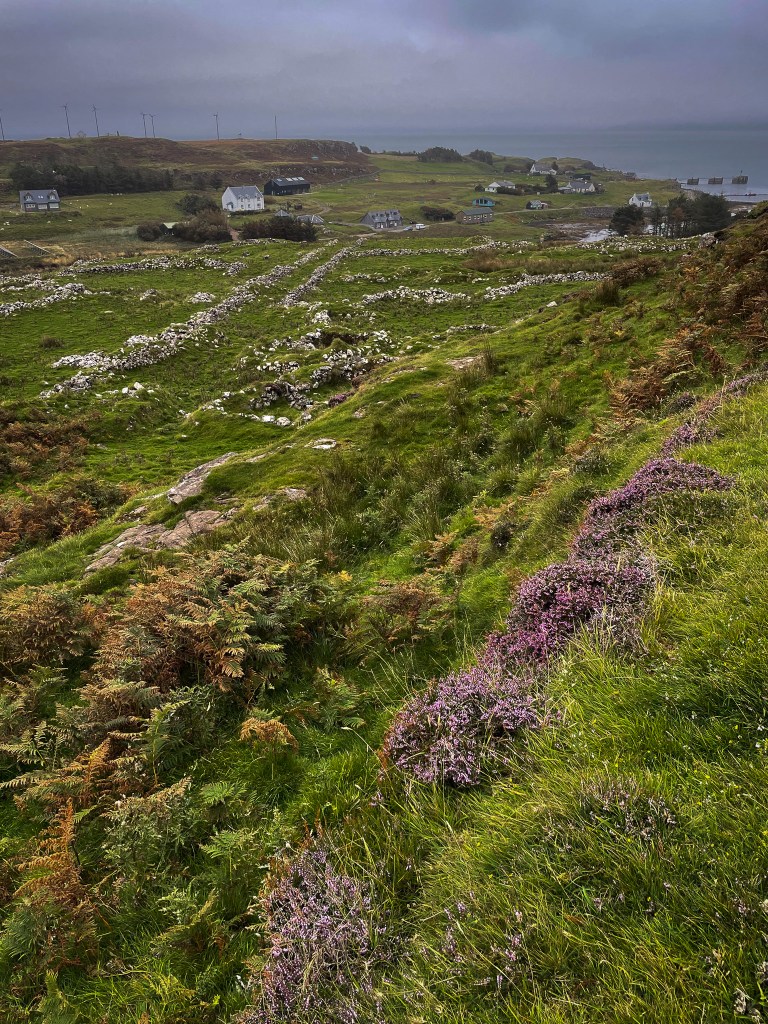 This was the day i got the tides wrong, I worked it all out based on low water Dover not high water….I wont do that again but at least we got a lie in. But it was a bit choppy and the wind was against us. We made it to Muck and anchored at Port Mor. I persuaded Kenny to blow up the dingy and row a shore first time in this trip. We went for a walk and discovered an old village and grave yard.