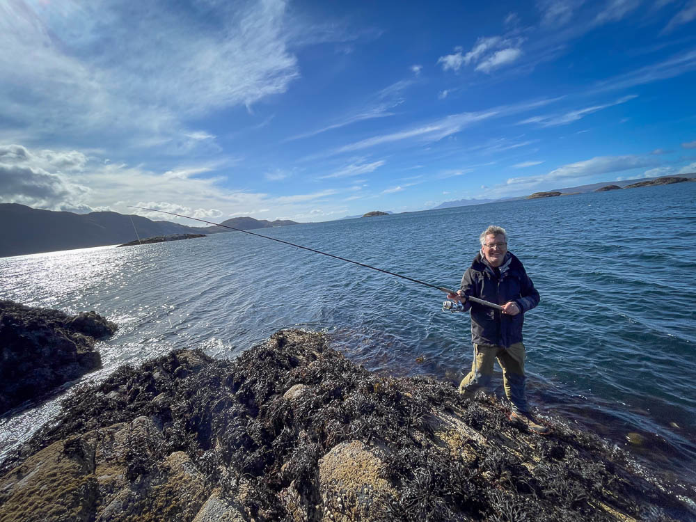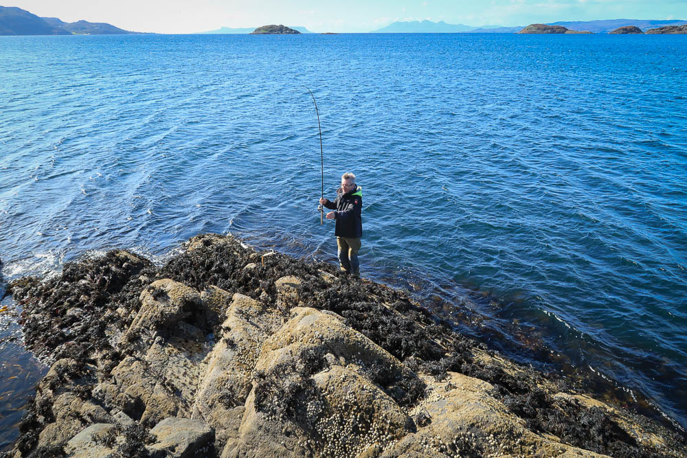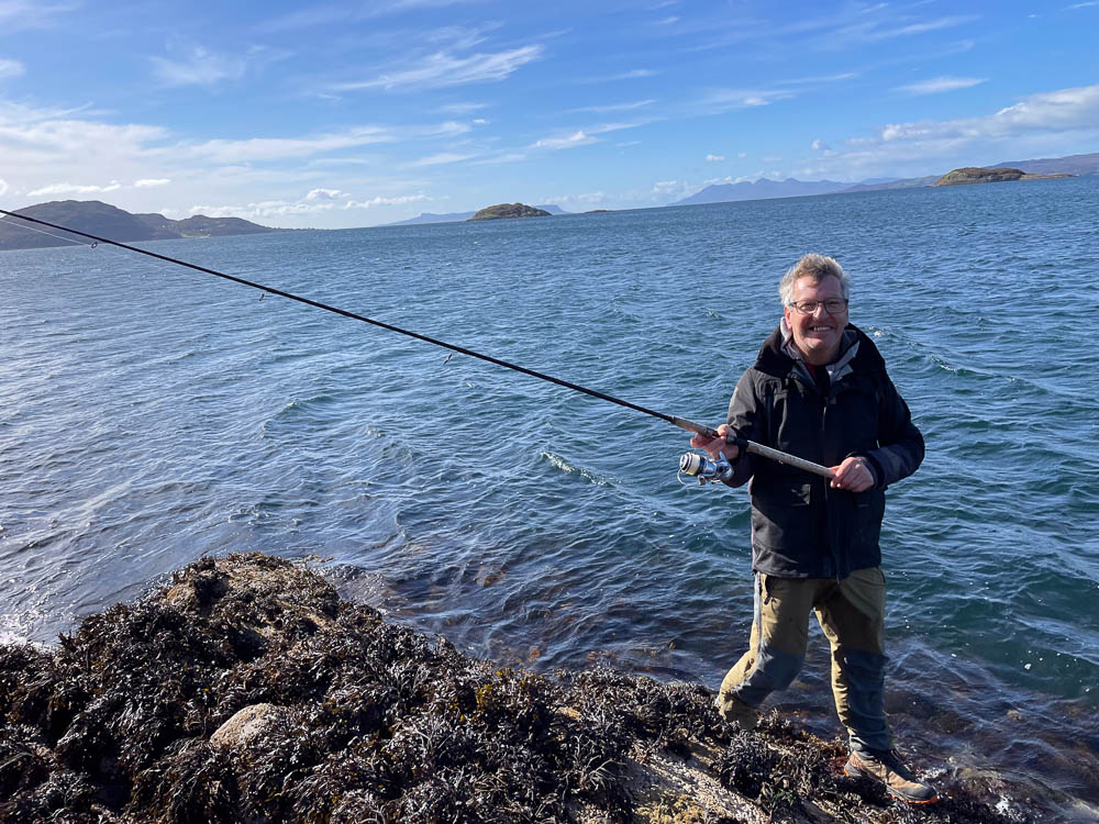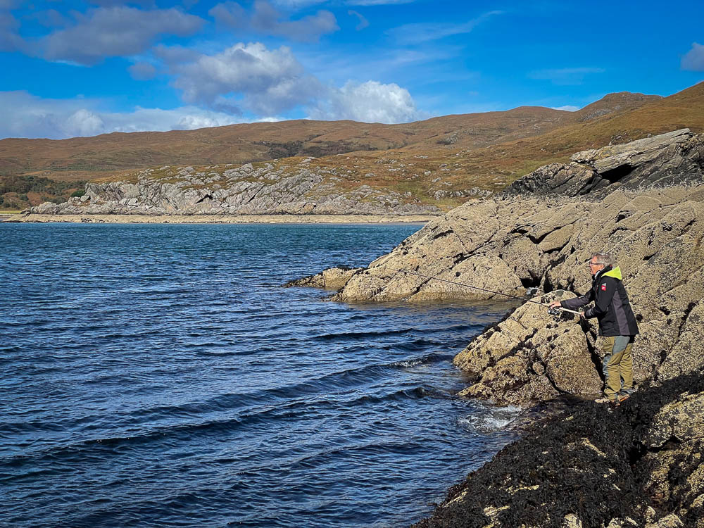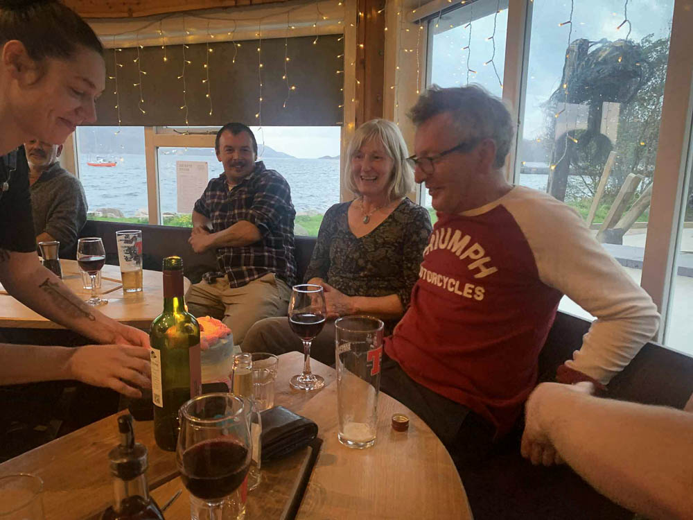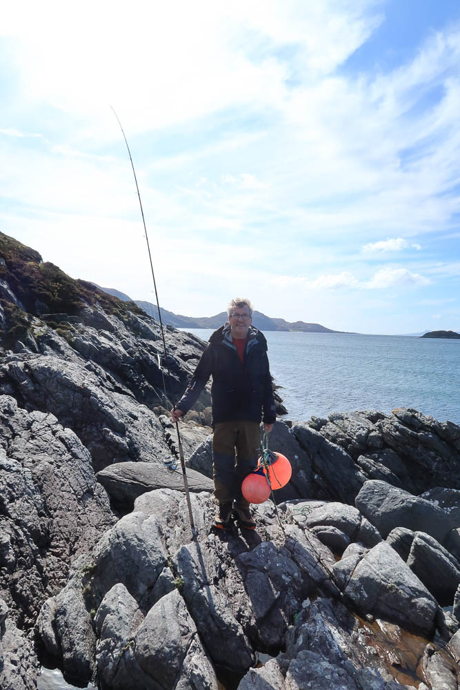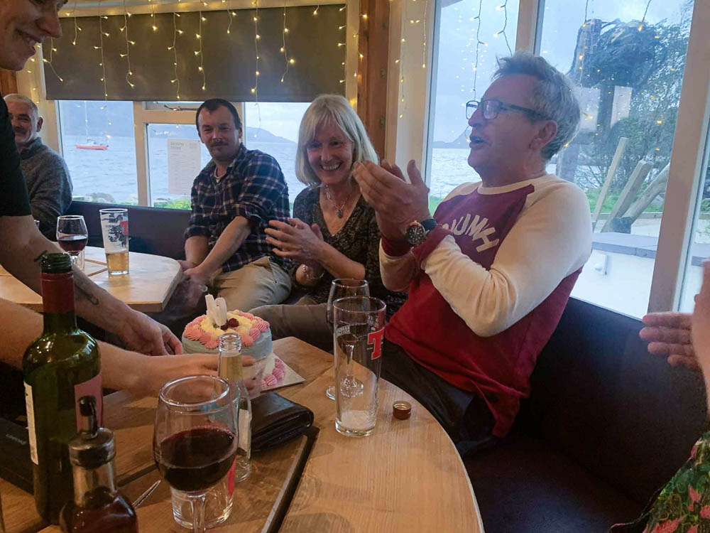 After a lovely family meal in the Old Forge last night we had a slow start before we decided to get some fresh air and walk down to Sandaig Bay. Kenny took his rod and i took my swimmies. What a lovely day we walked round to the next bay on the left I had not been there before it was really beautiful. Sea is still reasonably warm and i had a great tip. Kenny walked round to the point and Joe sunbathed. After my swim we scrambled over the rocks to Kenny where he was catching so so many fish! after a hard walk back over a lumpy top we found it easier scrambling on the rocks. We then walked up to Roli’s path back the the first bay and walked up the road. so nice to be out. We then raced down to the old forge in time to get cheesy chips and meet up with the ferry boys who were intent on getting blottowed. Sea was very rough in the marina when we got back so moved peggy before going up to the west highland hotel for another birthday meal.