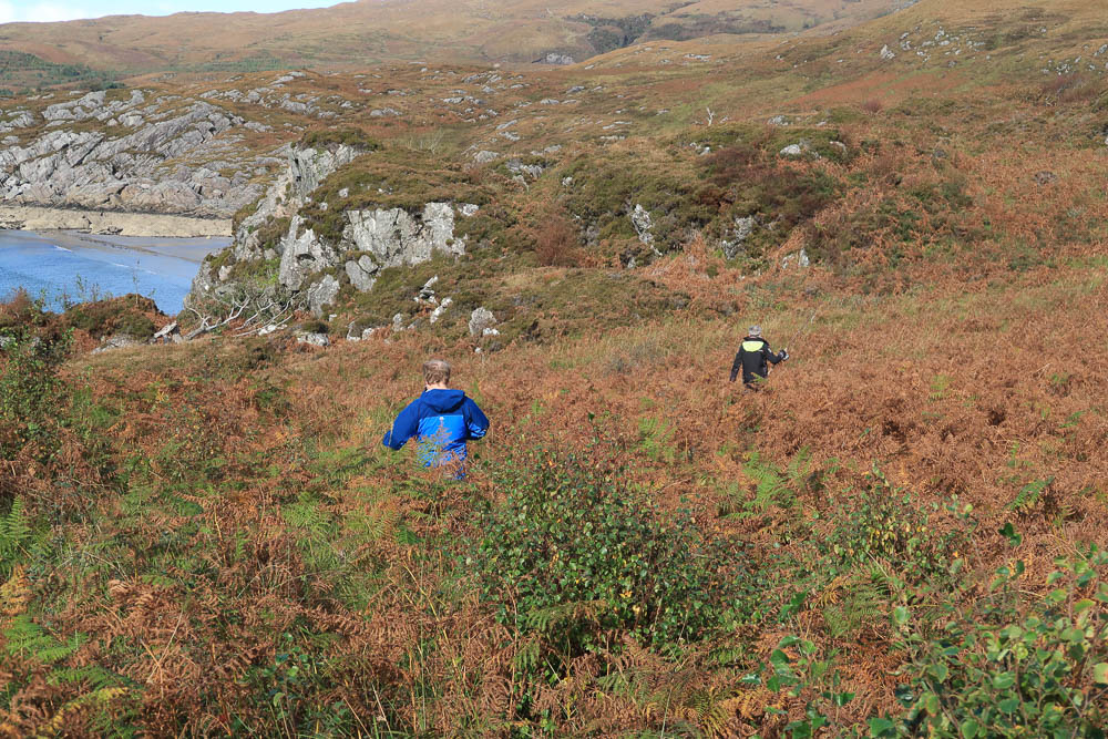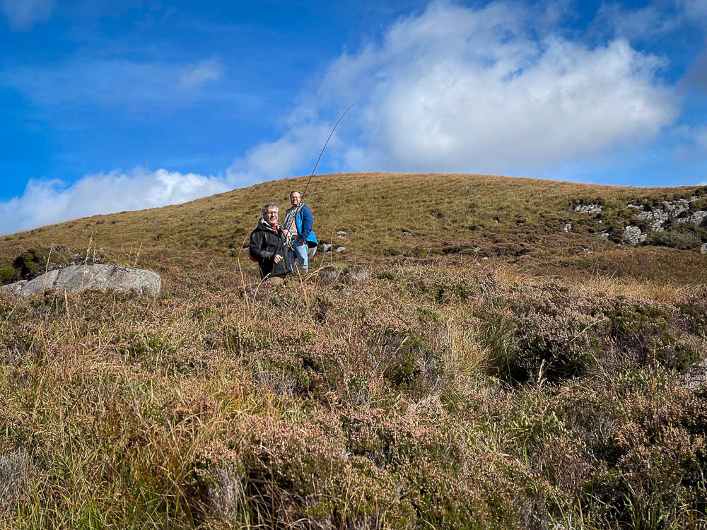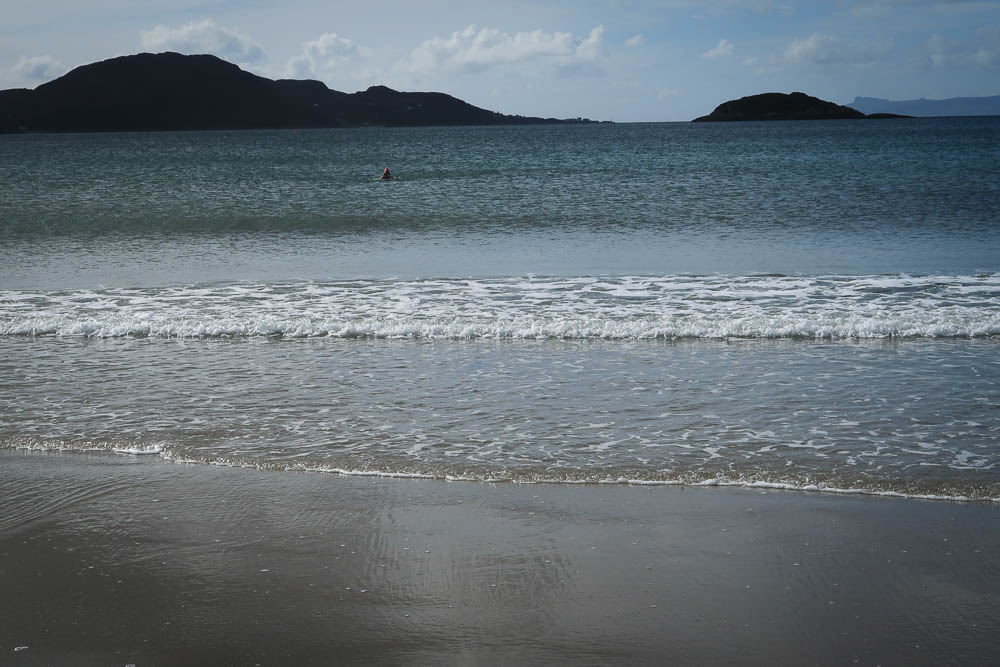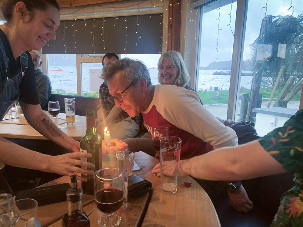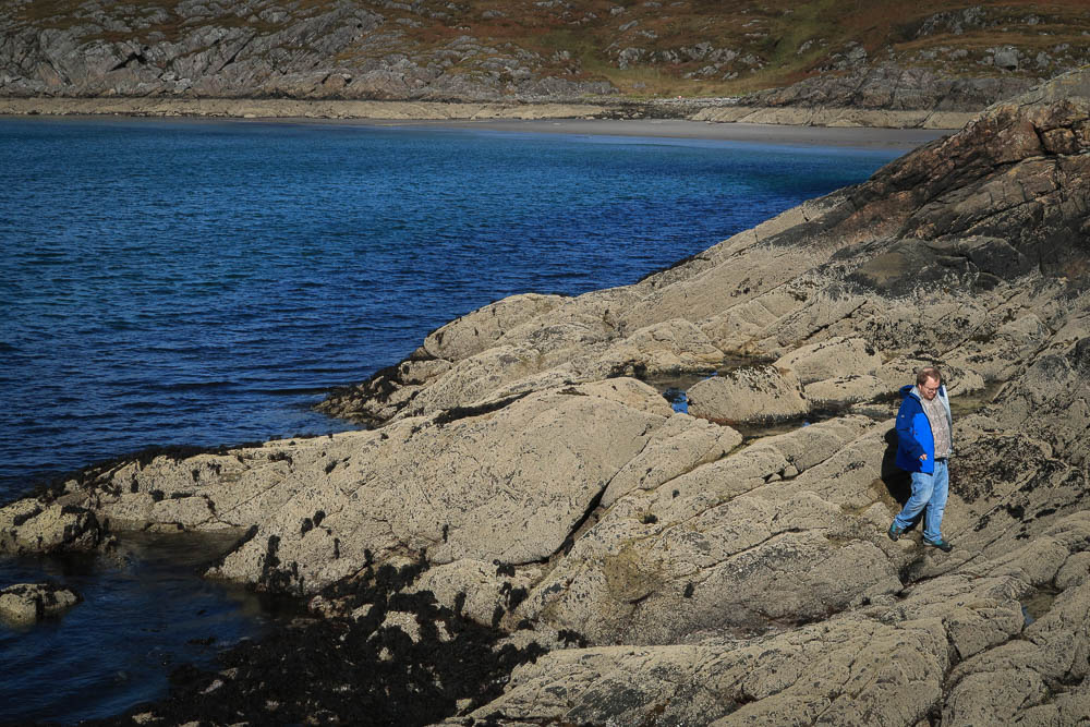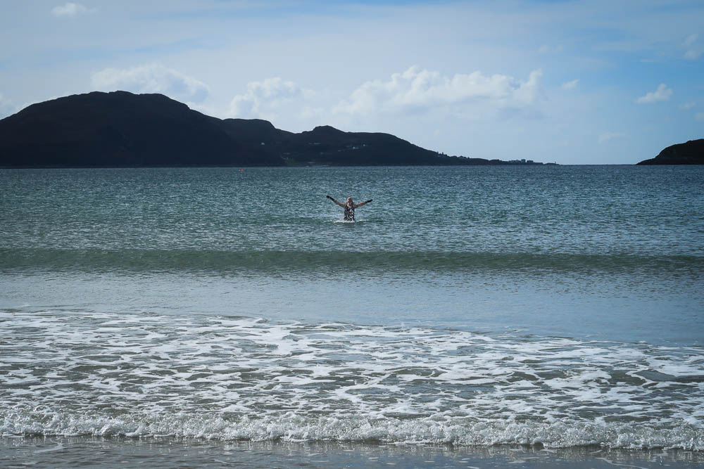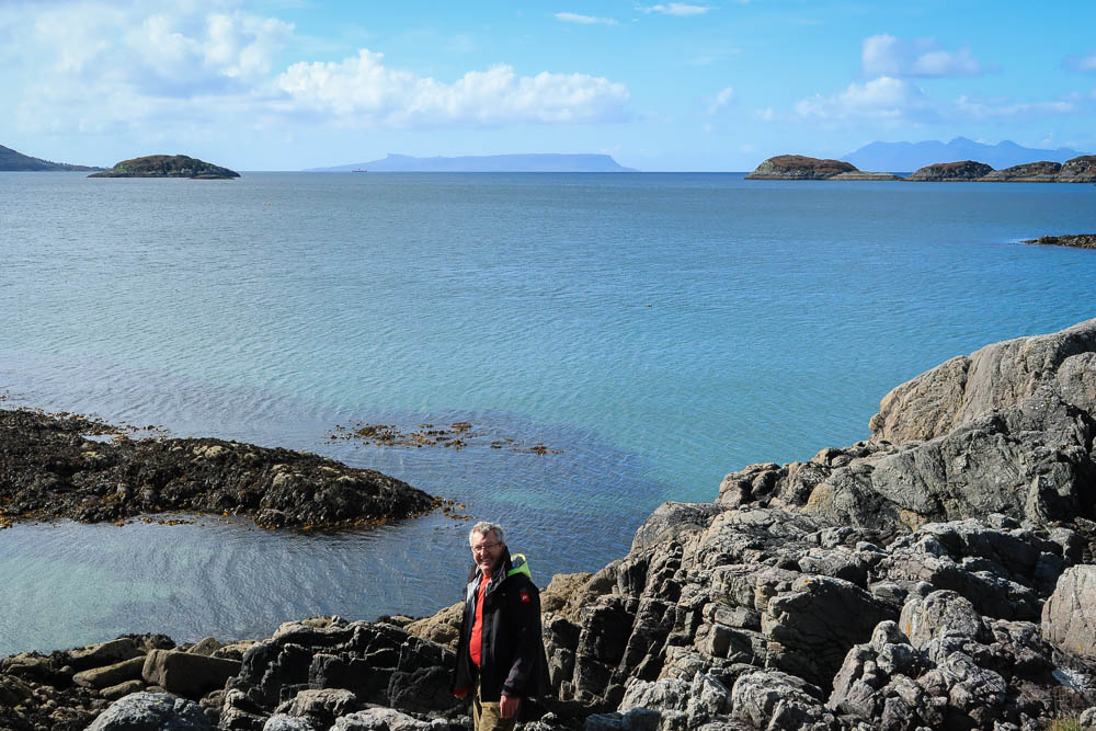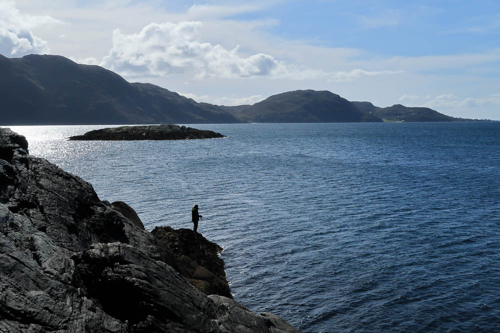 After a lovely family meal in the Old Forge last night we had a slow start before we decided to get some fresh air and walk down to Sandaig Bay. Kenny took his rod and i took my swimmies. What a lovely day we walked round to the next bay on the left I had not been there before it was really beautiful. Sea is still reasonably warm and i had a great tip. Kenny walked round to the point and Joe sunbathed. After my swim we scrambled over the rocks to Kenny where he was catching so so many fish! after a hard walk back over a lumpy top we found it easier scrambling on the rocks. We then walked up to Roli’s path back the the first bay and walked up the road. so nice to be out. We then raced down to the old forge in time to get cheesy chips and meet up with the ferry boys who were intent on getting blottowed. Sea was very rough in the marina when we got back so moved peggy before going up to the west highland hotel for another birthday meal.