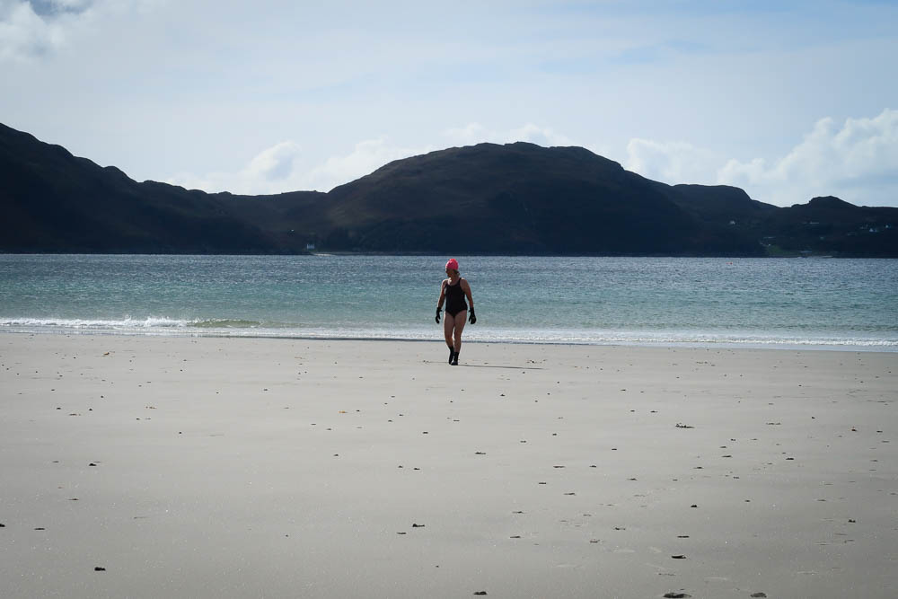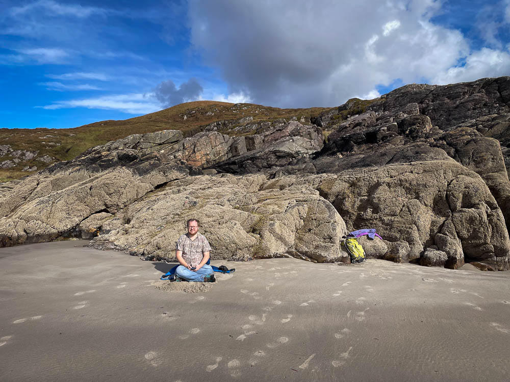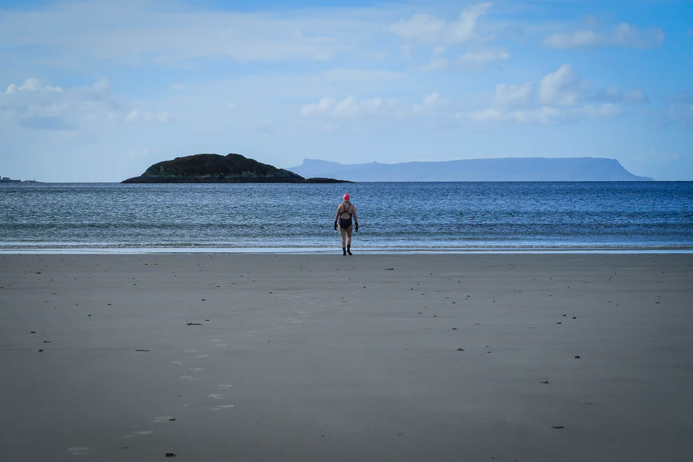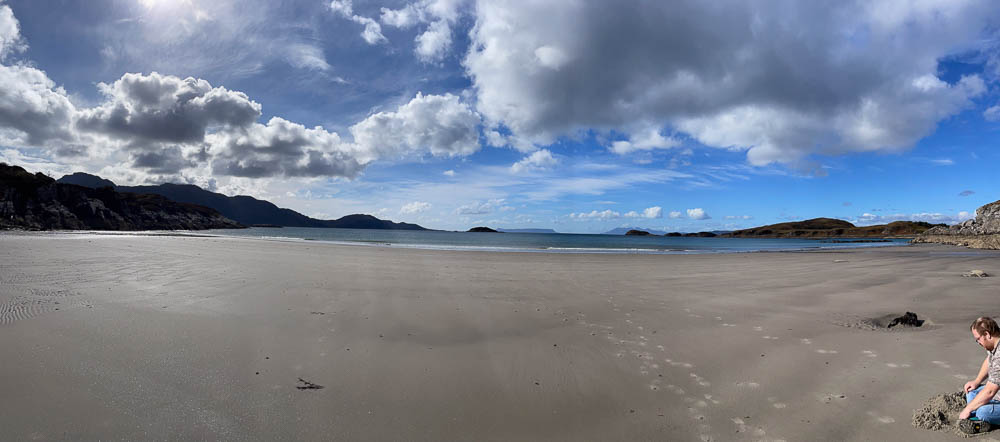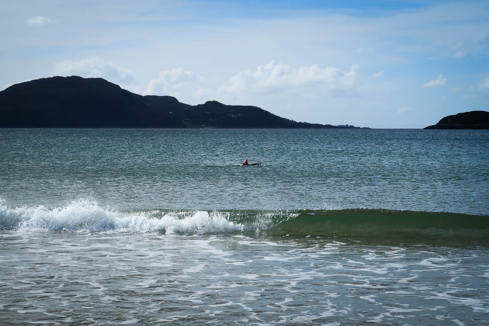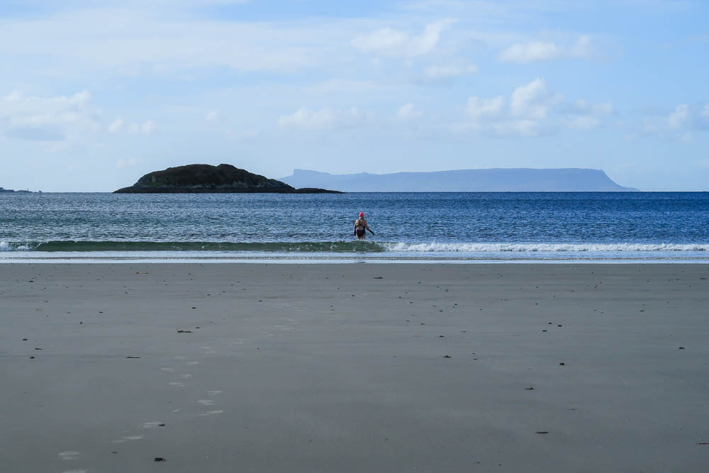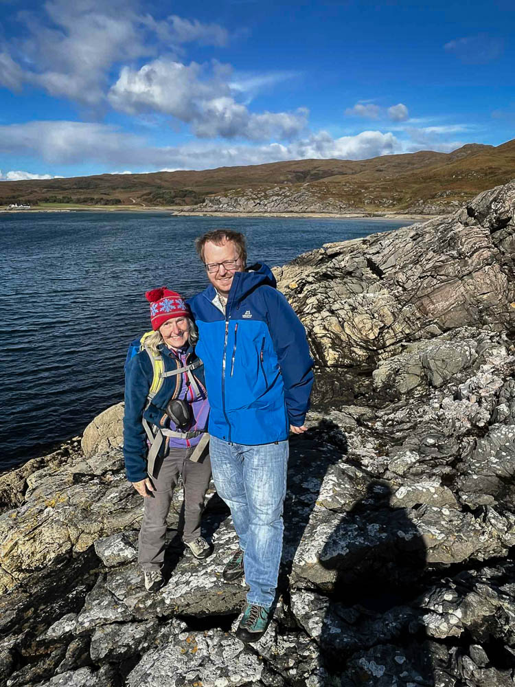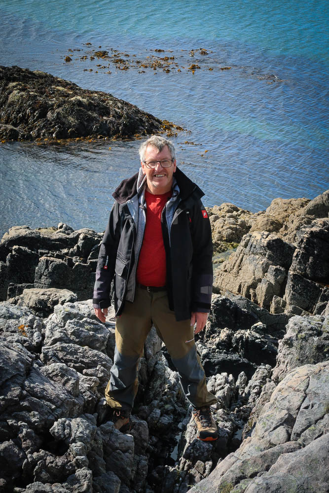 After a lovely family meal in the Old Forge last night we had a slow start before we decided to get some fresh air and walk down to Sandaig Bay. Kenny took his rod and i took my swimmies. What a lovely day we walked round to the next bay on the left I had not been there before it was really beautiful. Sea is still reasonably warm and i had a great tip. Kenny walked round to the point and Joe sunbathed. After my swim we scrambled over the rocks to Kenny where he was catching so so many fish! after a hard walk back over a lumpy top we found it easier scrambling on the rocks. We then walked up to Roli’s path back the the first bay and walked up the road. so nice to be out. We then raced down to the old forge in time to get cheesy chips and meet up with the ferry boys who were intent on getting blottowed. Sea was very rough in the marina when we got back so moved peggy before going up to the west highland hotel for another birthday meal.