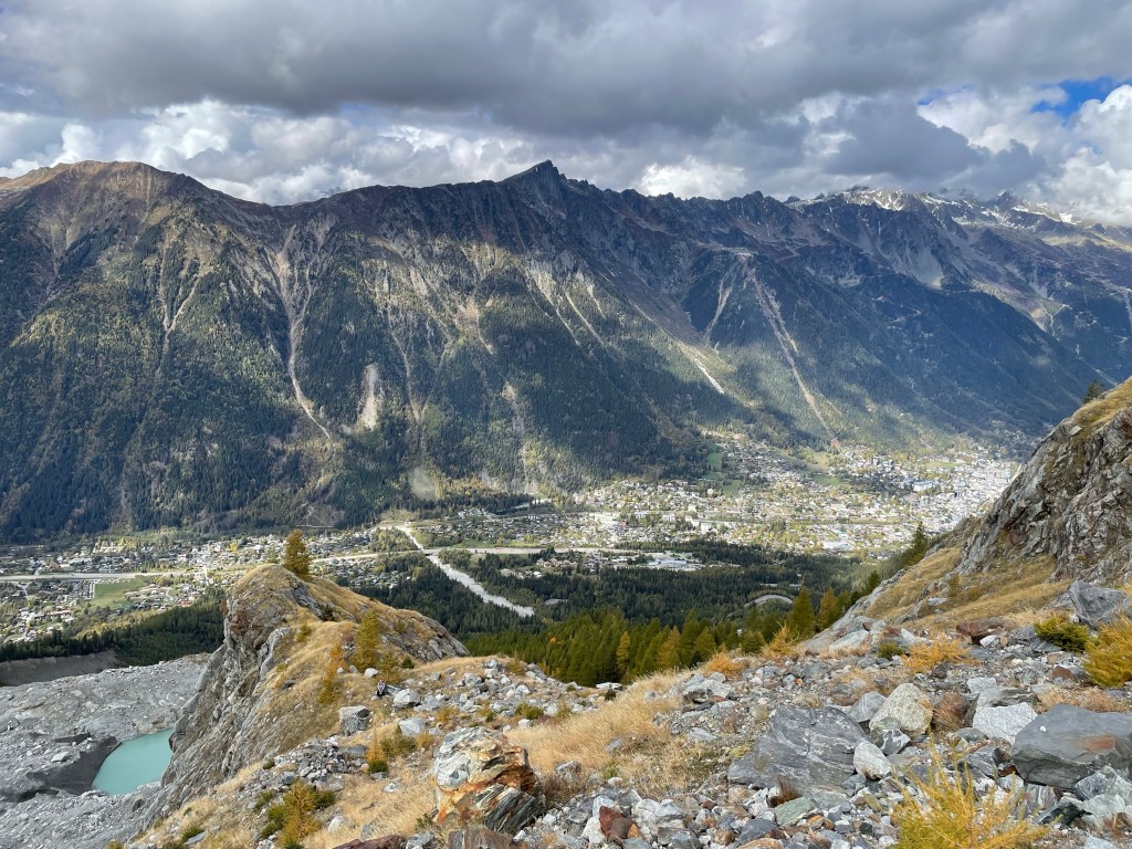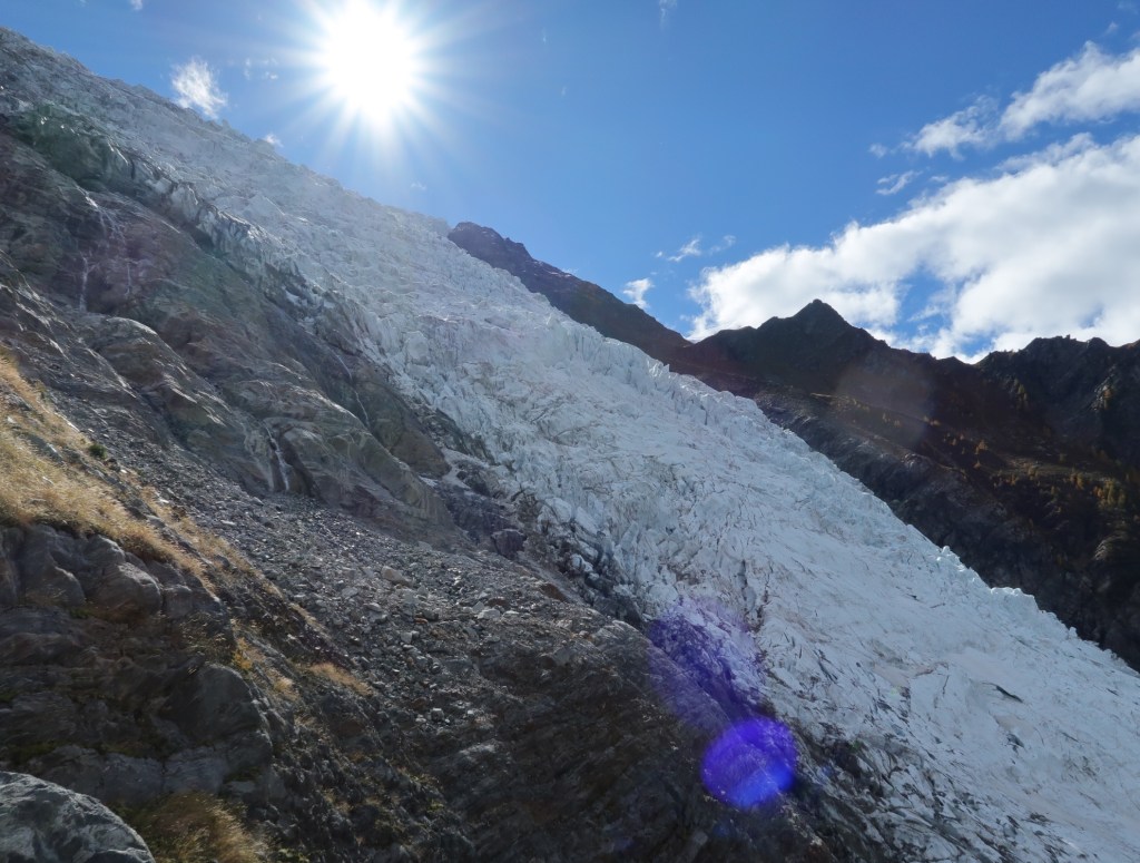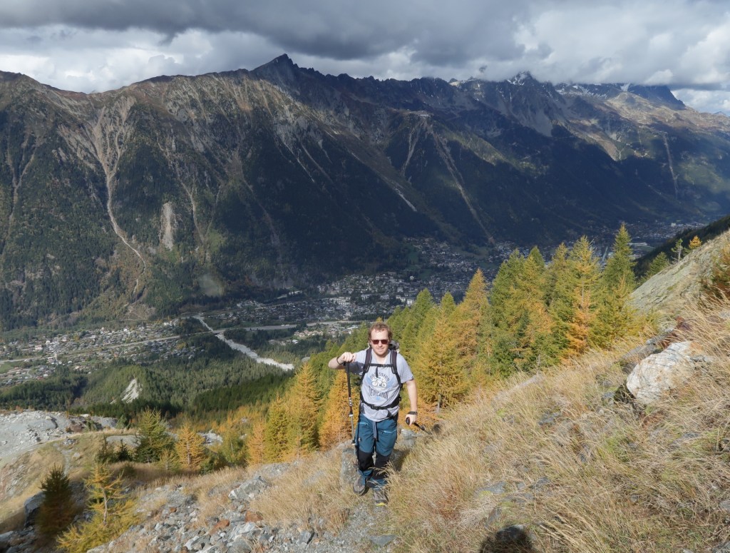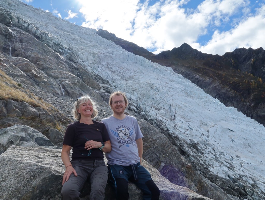 Today was a rest day! Our legs were tired from the big walk down yesterday so we decided a train ride up the valley to Le Buet and then a wander up to the cascade de benard. There was works on the train so we had to transfer to a bus at Chamonix which was ok but a bit disappointing as I was quite settled on the train! It was very quiet at Le buet but we had a nice little walk up to the falls and an explore of a cave. There was no where to eat open so we waited for the bus back and got off at Argentiere. Where we had a nice lunch and then decided to have another walk along the petit Balcon Sud to les Tines where we caught the bus back to Chamonix and then the train. There were amazing views of the glaciers.